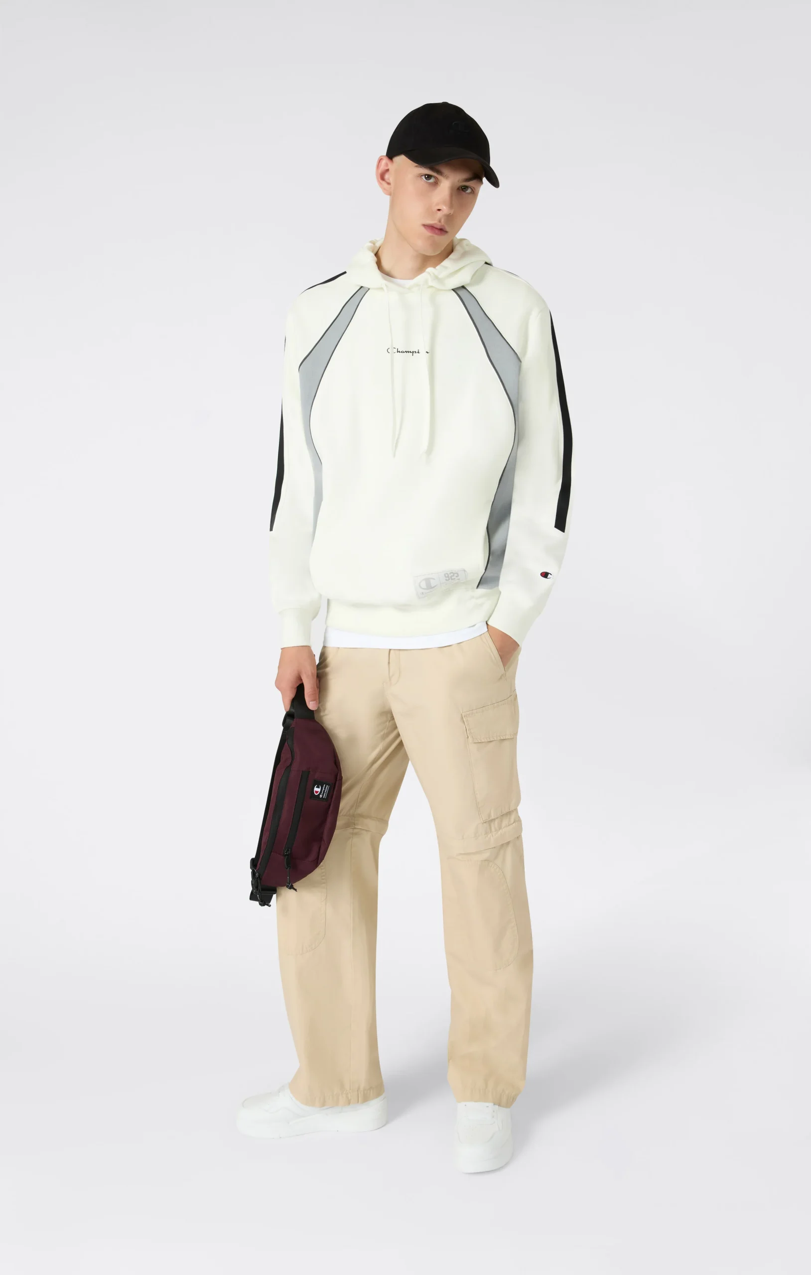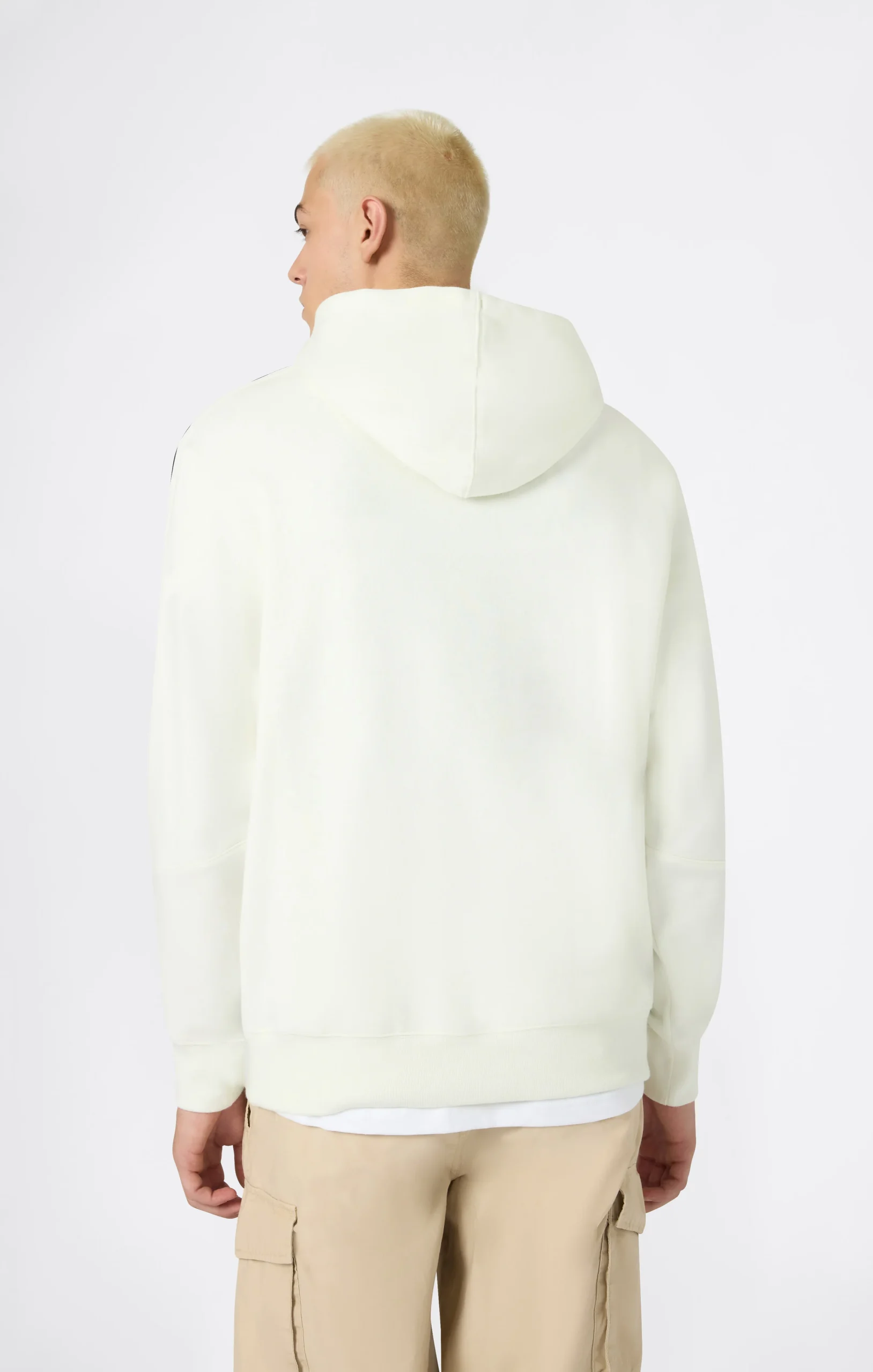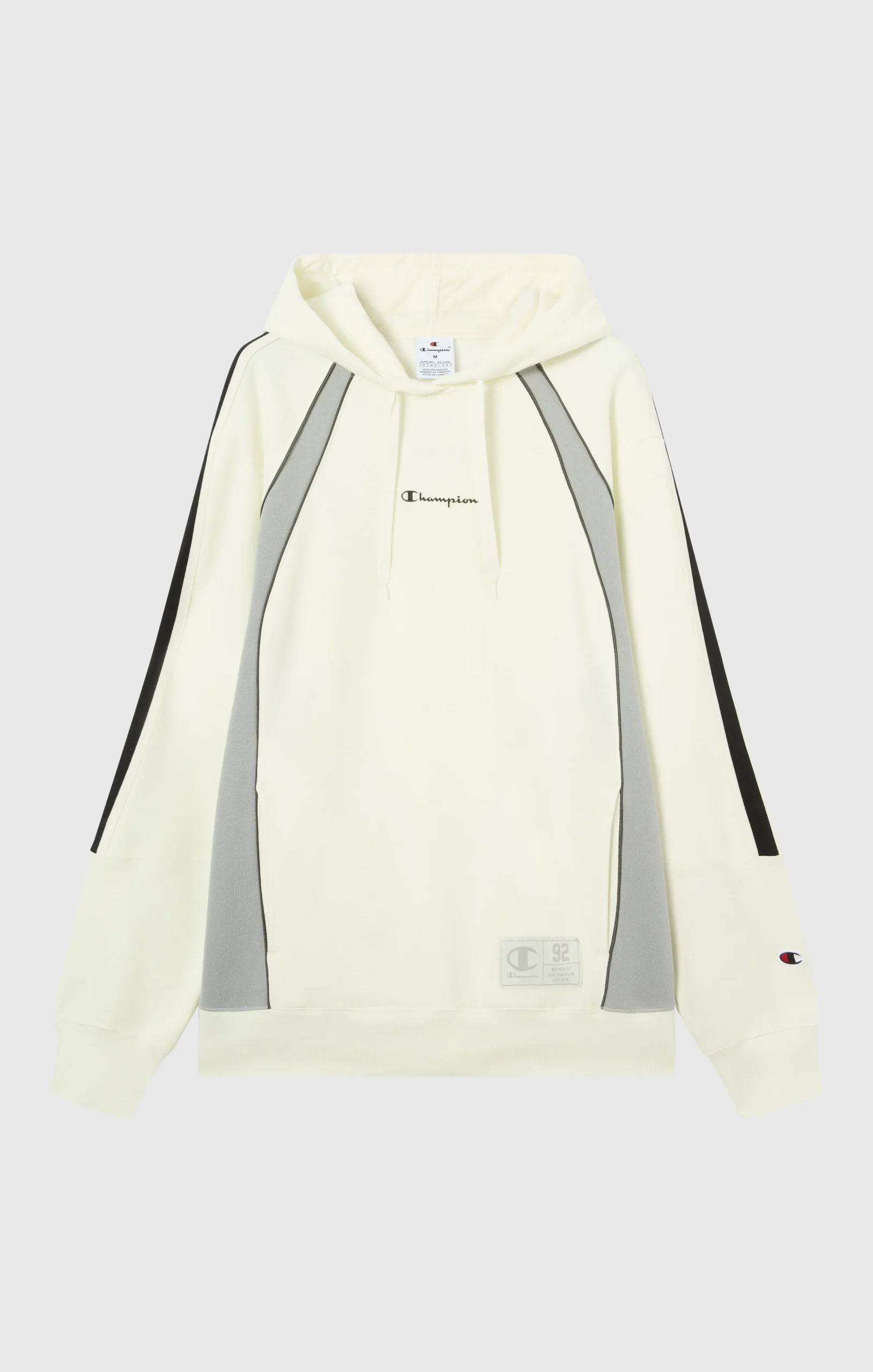 Inspired by basketball culture and American sportswear, this hoodie combines urban style with iconic details. Made from soft fleece with a brushed interior, it features shiny fabric inserts, contrasting tape on the sleeves and a printed logo on the chest. A perfect choice for those looking for a sporty and distinctive look for everyday wear.@@@Fabric: Compact and soft fleece + shiny knit inserts |Composition: 70% Cotton, 30% Polyester + 100% Polyester |Weight: 280 g/m² + 175 g/m² |Brushed interior |Front pockets |Adjustable hood with tubular drawstring |Shiny fabric inserts |Knit tape on the sleeves |Printed logo on the chest |Heritage patch applied |Fit: Relax Fit: Soft and comfortable fit, slightly loose at the chest, dropped shoulder, regular length.