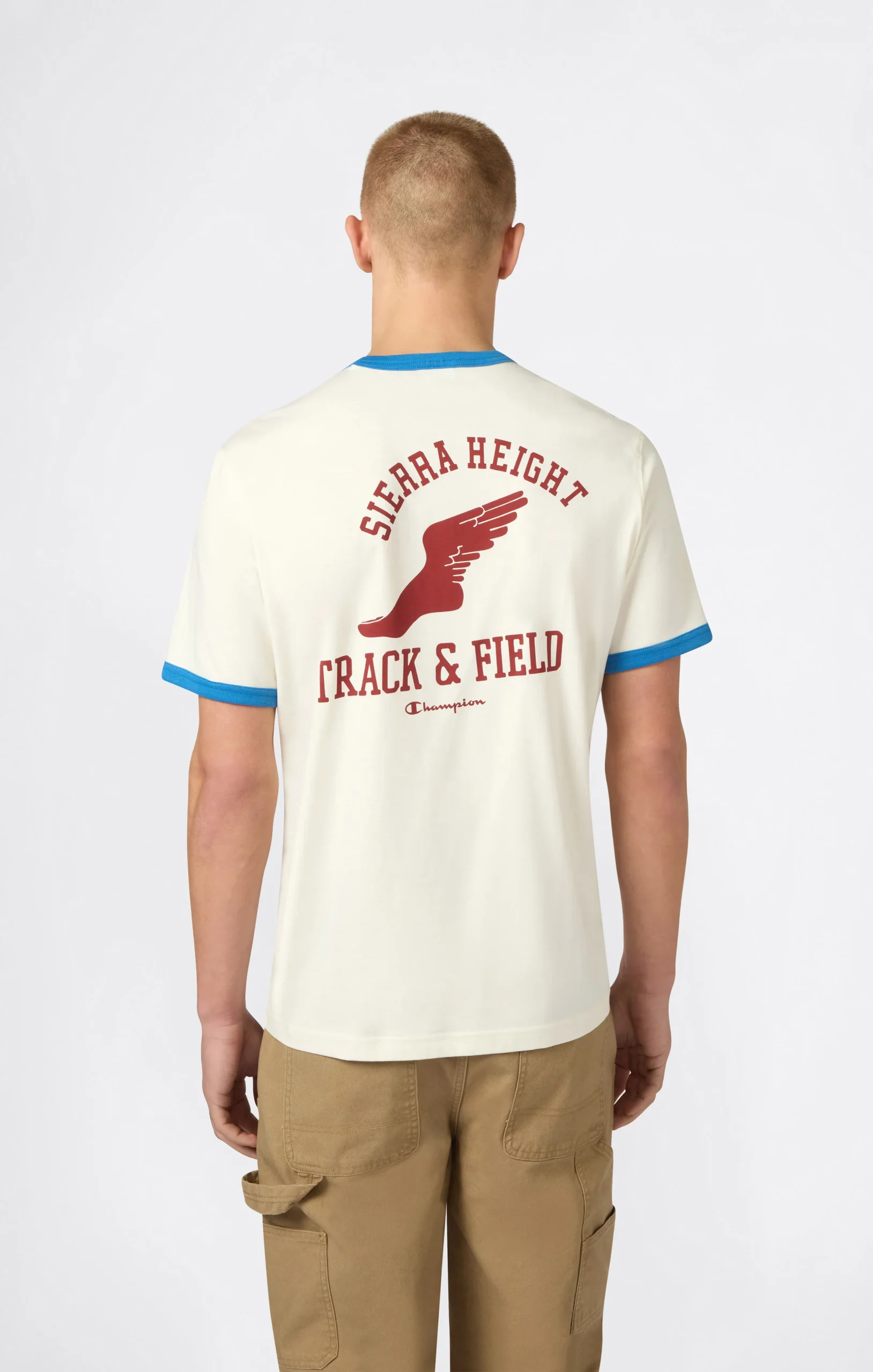 This men’s ringer T-shirt is inspired by American sportswear heritage, recalling garments worn in post-war collegiate athletic competitions. Made from lightweight cotton jersey, it features the iconic contrast ribbed collar and sleeve cuffs typical of ringer style. Collegiate and track & field–inspired graphics enhance the Americana aesthetic, while the garment wash treatment gives the T-shirt a slightly worn-in, authentic look. The Relax Fit offers a soft, easy silhouette for everyday wear.@@@Relax Fit, soft and slightly loose |Made from lightweight cotton jersey |Composition: 100% Cotton |Weight: 170 g/m² |Contrast ribbed collar and sleeve cuffs |Printed graphic on chest or back |Garment wash treatment |Champion logo applied on the sleeve