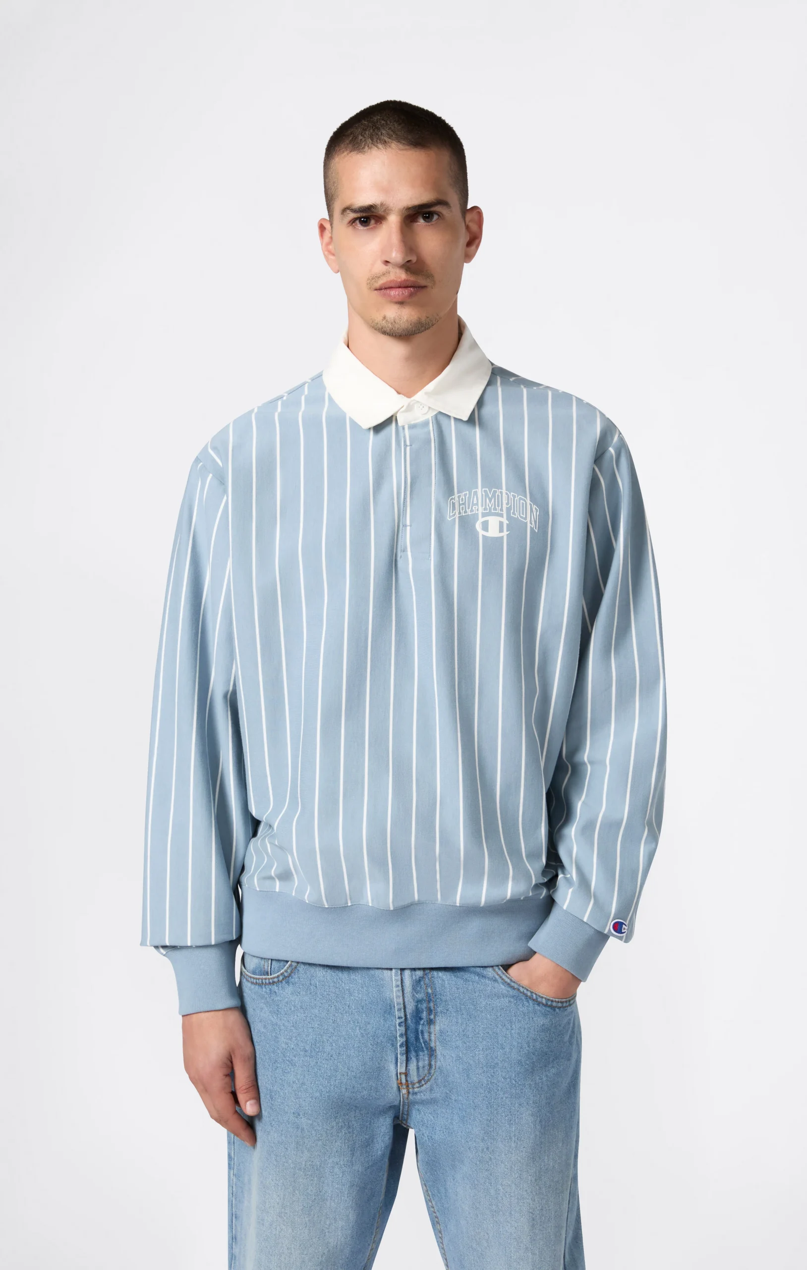 This striped polo blends sporty spirit with retro flair, crafted in heavyweight 280 g/m² jersey. The contrast collar and tonal embroidered logo evoke collegiate uniforms with a fresh, street-ready update.@@@Fabric: Heavy striped jersey, weight: 280 g/m² |Composition: 100% Cotton |Contrast polo collar |Tone-on-tone embroidered logo |Fit: Relax Fit – Relaxed and comfortable fit, slightly roomy on the chest, dropped shoulder, regular length.