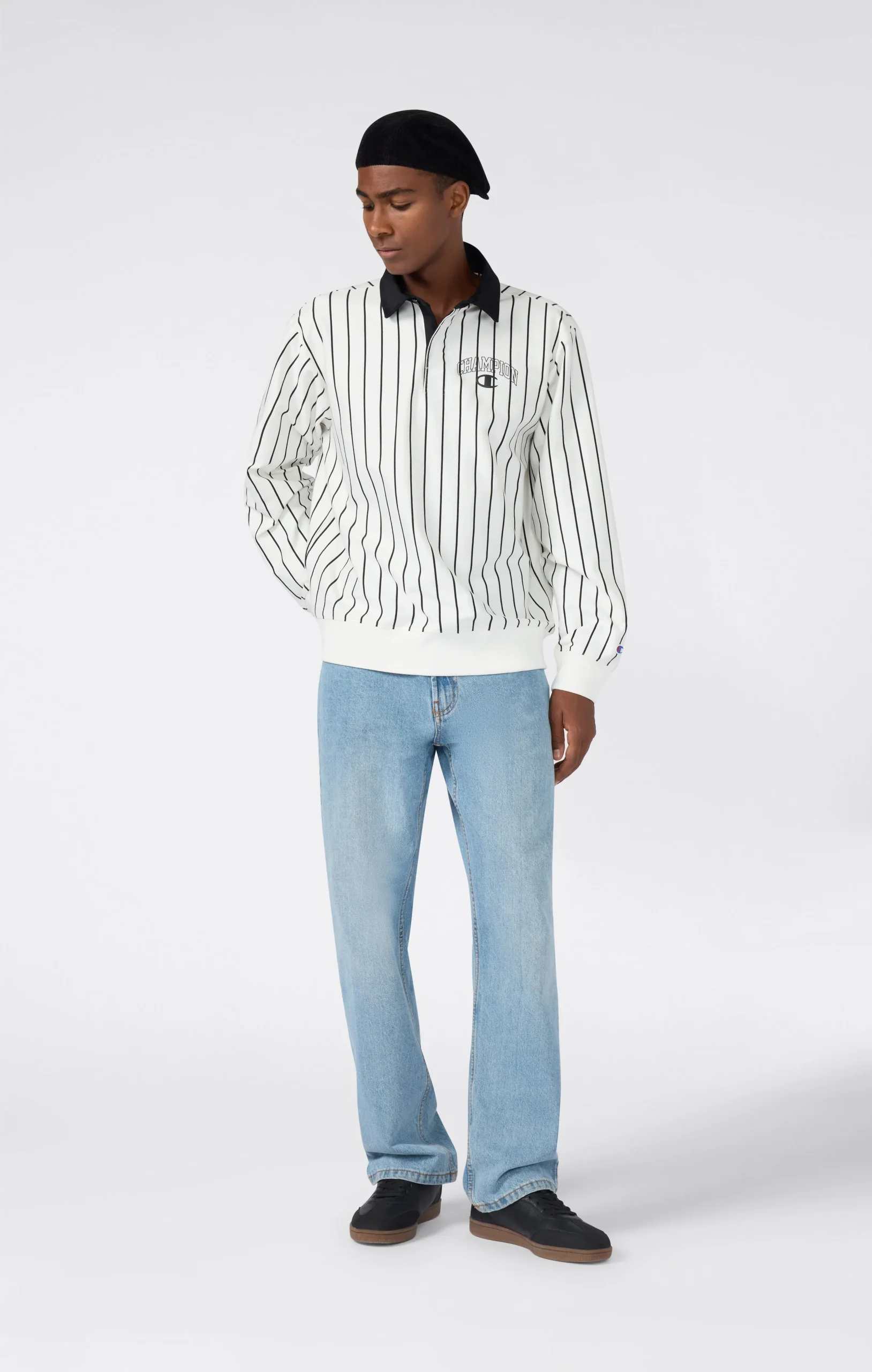 This striped polo blends sporty spirit with retro flair, crafted in heavyweight 280 g/m² jersey. The contrast collar and tonal embroidered logo evoke collegiate uniforms with a fresh, street-ready update.@@@Fabric: Heavy striped jersey, weight: 280 g/m² |Composition: 100% Cotton |Contrast polo collar |Tone-on-tone embroidered logo |Fit: Relax Fit – Relaxed and comfortable fit, slightly roomy on the chest, dropped shoulder, regular length.