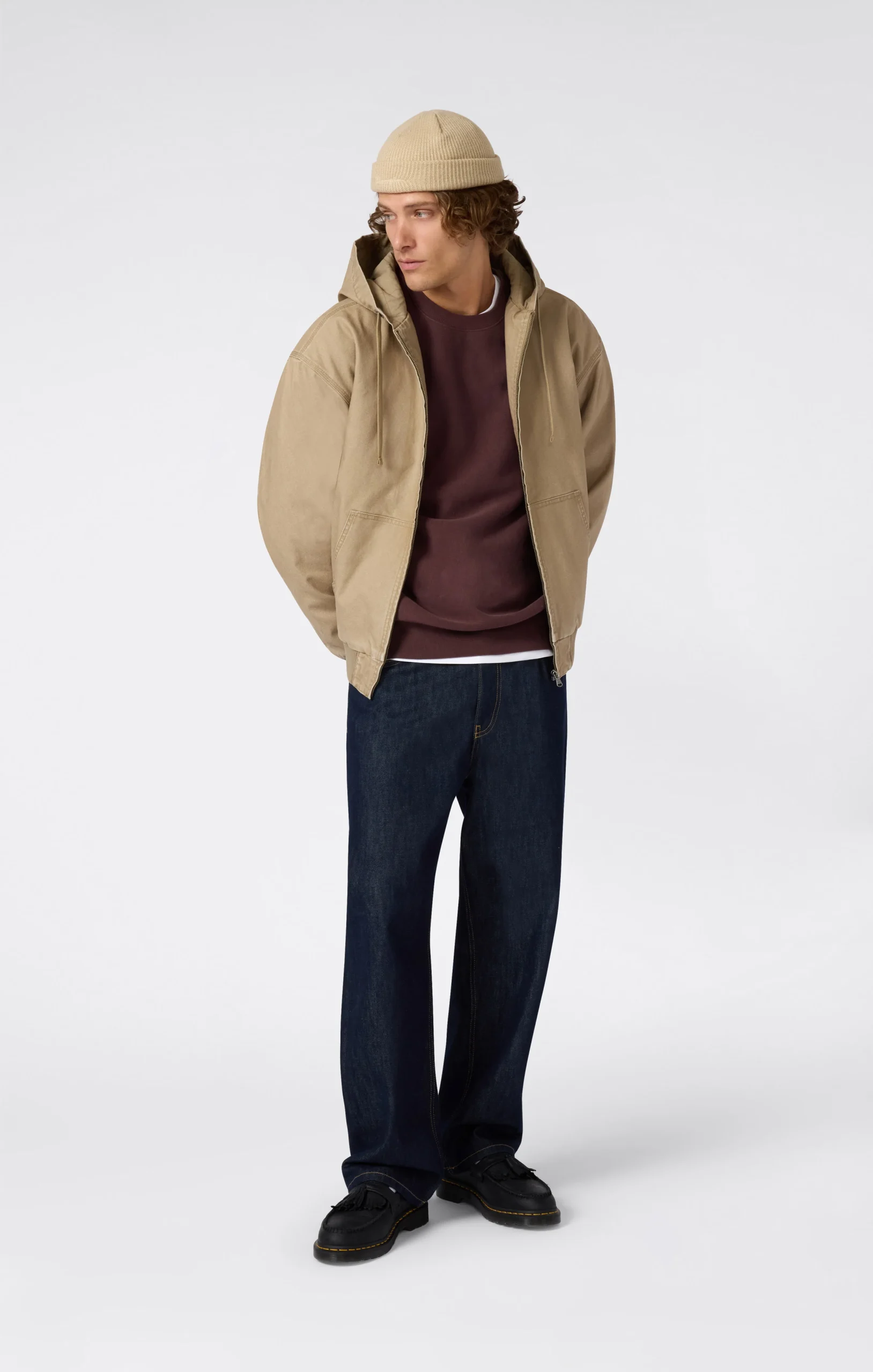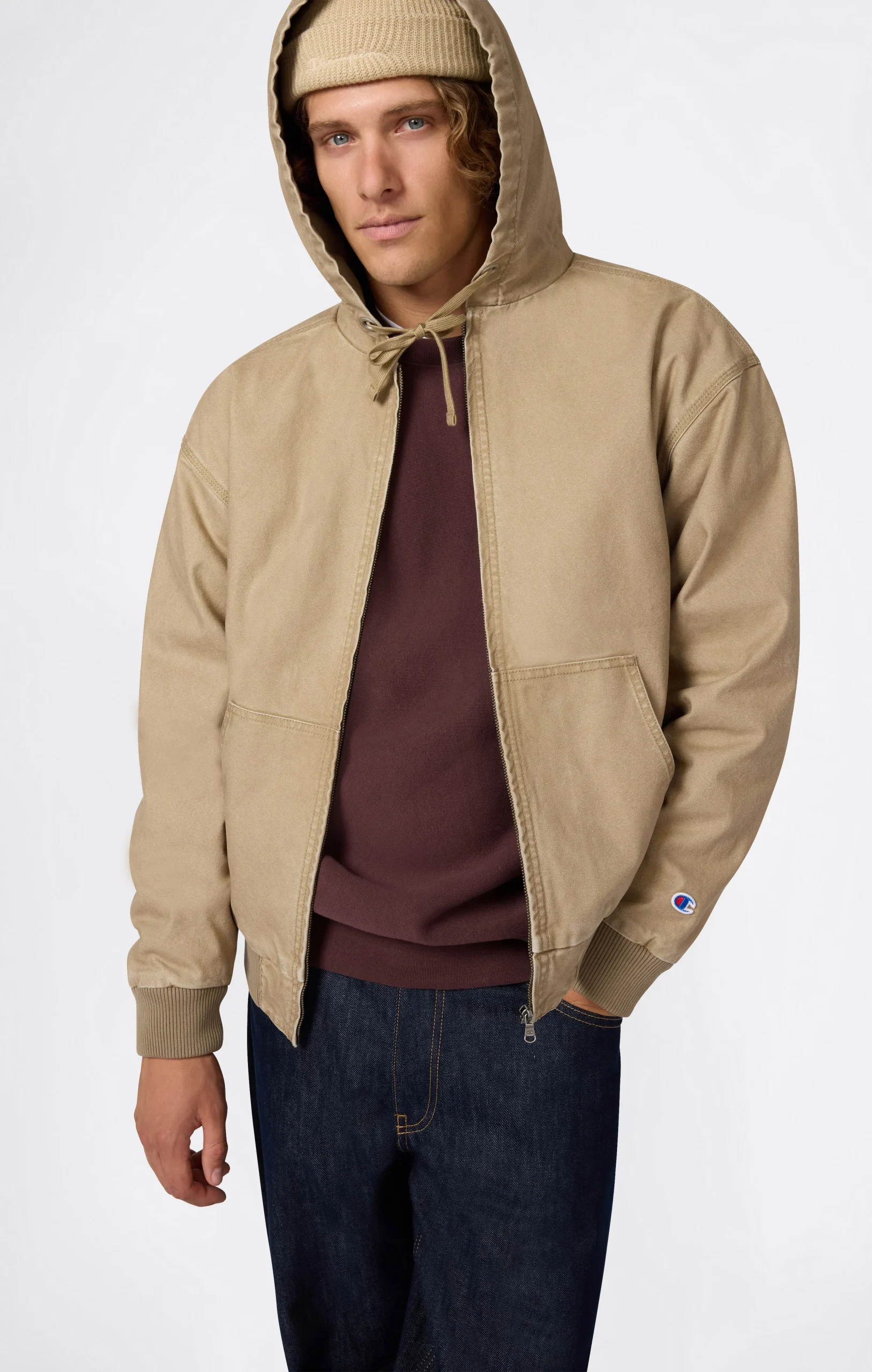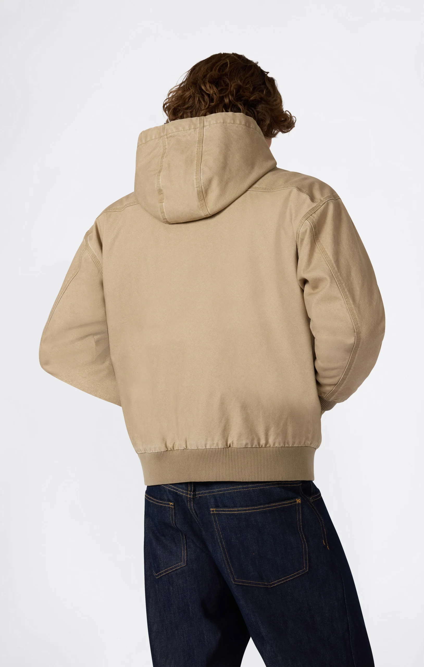 This hooded jacket blends utility aesthetics with functional design. Made from durable cotton canvas, it features inner padding and an adjustable hood to provide warmth and protection on colder days. The washed effect gives it an authentic, worn-in look, while front pockets add both practicality and style.@@@Fabric: Heavy cotton canvas with washed faded effect |Composition: 100% cotton |Weight: 385 g/m² |Style: Utility |Fit: Standard Fit: Versatile and comfortable with standard width and length. Close to the body with simple lines that do not shape the figure. Regular shoulder cut.