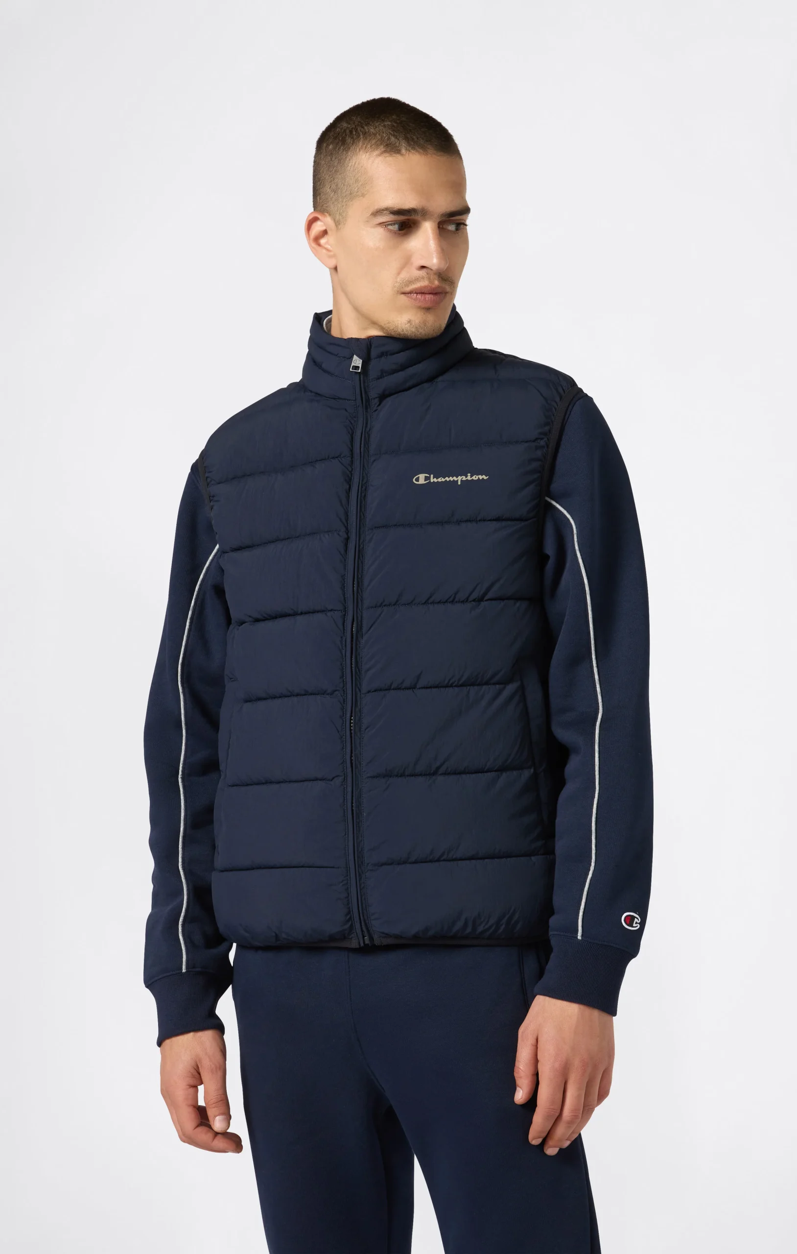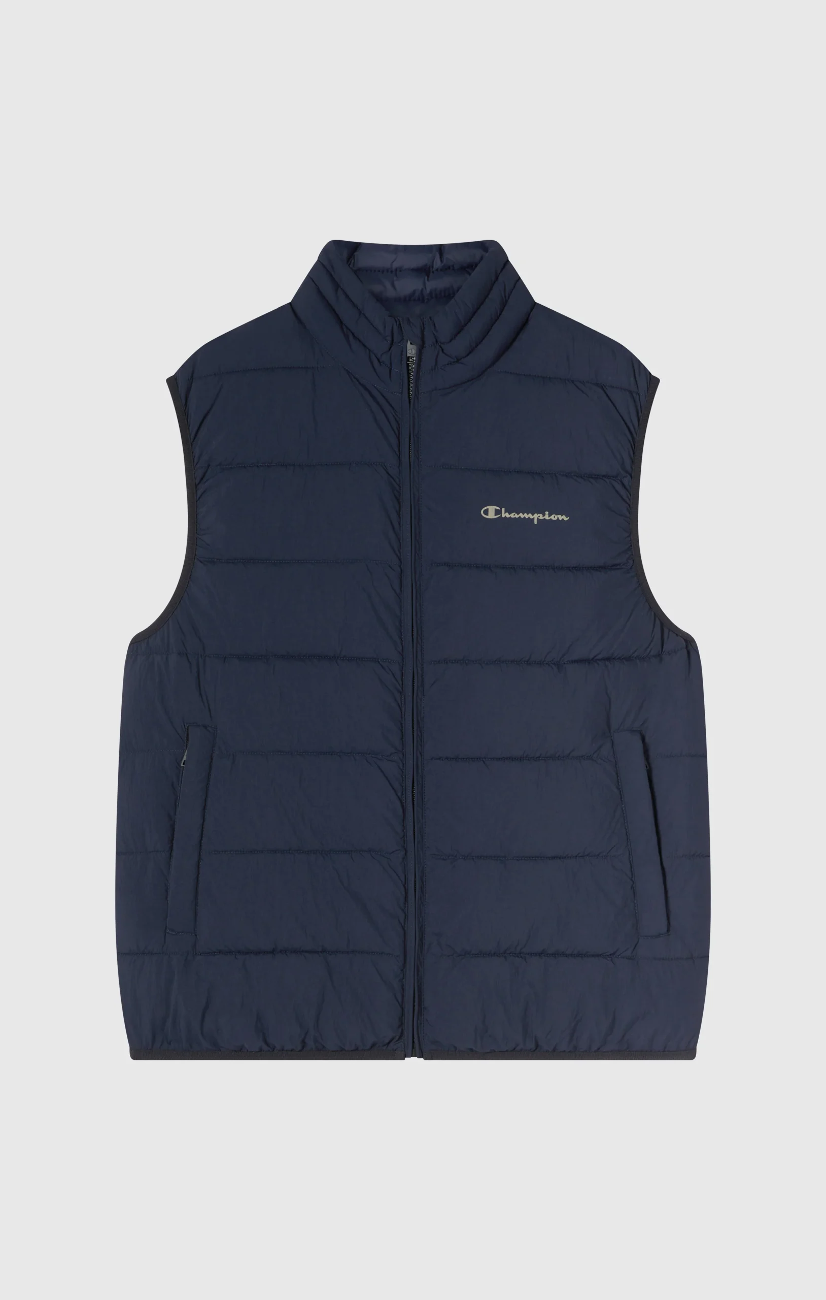 Designed to deliver warmth and comfort on the coldest days, this zip-up padded vest is made from water-resistant crinkle-effect nylon. Lightweight yet protective, it features zipped front pockets and sustainable Repreve padding. The high collar adds a clean, modern touch.@@@Fabric: Crinkle effect nylon, 70 g/m² |Composition: 100% Polyamide |Padding: Repreve |Details: Front zip pockets |Fit: Regular Fit – comfortable cut with a straight line, suitable for all body types