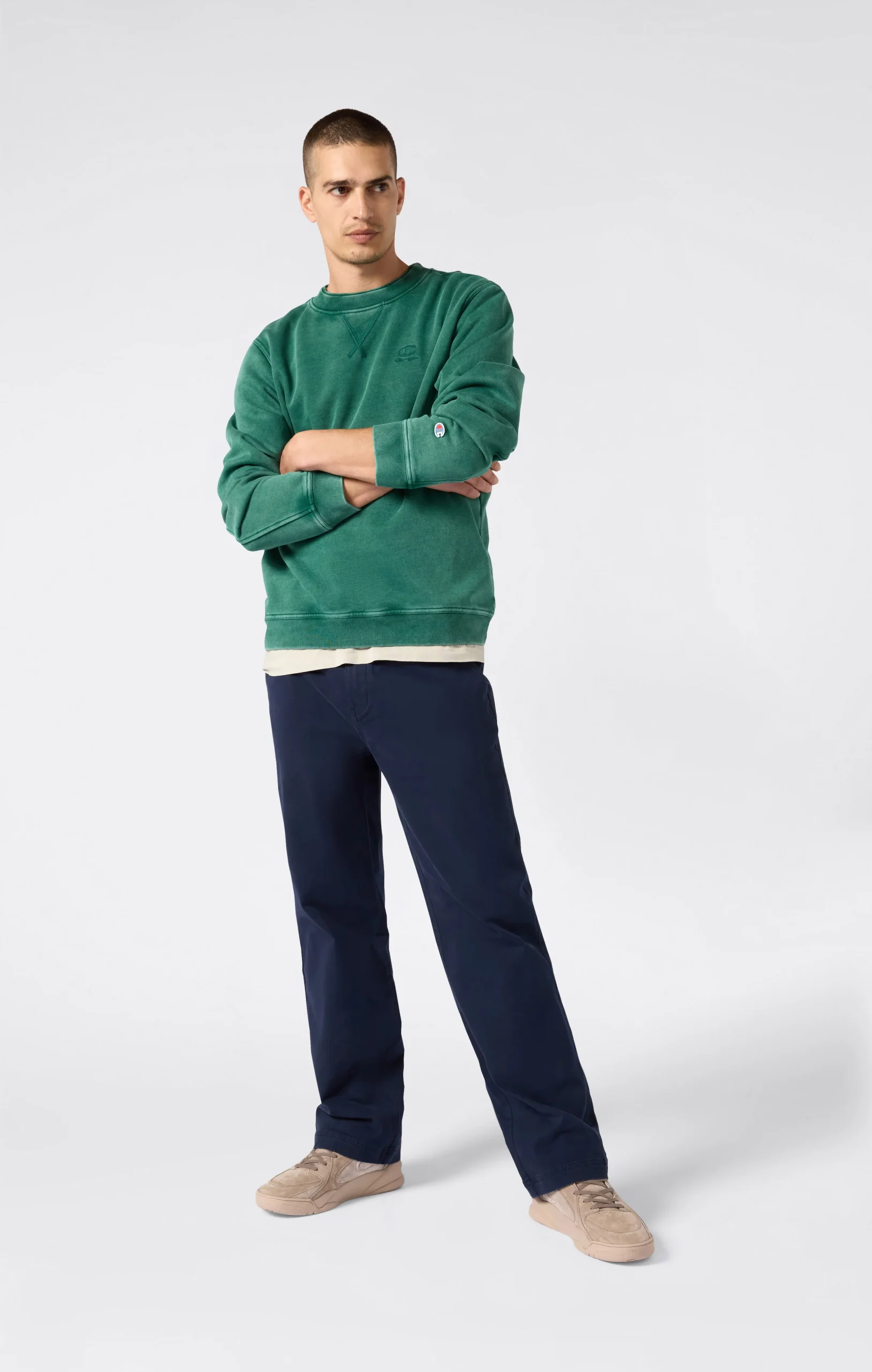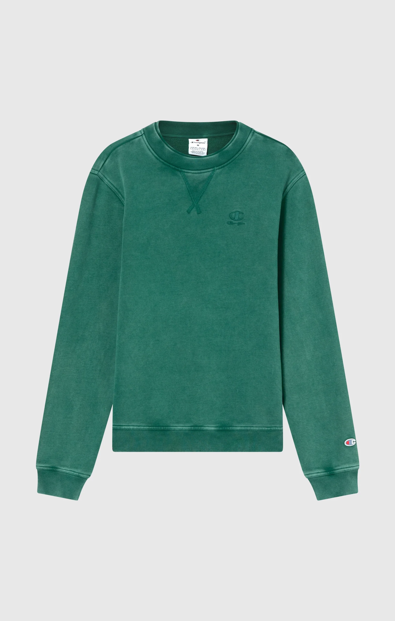 An iconic sweatshirt updated with a mineral wash finish, delivering a naturally faded look on seams and surface for a worn-in, authentic feel. The tonal embroidered logo on the chest adds a subtle yet distinctive Champion touch. Made from heavyweight fleece (310 g/m²), it offers comfort and structure, complete with a standard fit and premium details like a reinforced ribbed collar.@@@Fabric: Heavy compact and soft fleece – 310 g/m² |Composition: 70% Cotton / 30% Polyester |Brushed interior for superior thermal comfort |Mineral wash treatment for a faded effect |Double ribbed collar |Tone-on-tone embroidered logo |Elasticated finishes on cuffs and hem |Fit: Standard Fit – versatile and comfortable with standard widths and lengths. Follows the body without clinging. Regular shoulder cut.