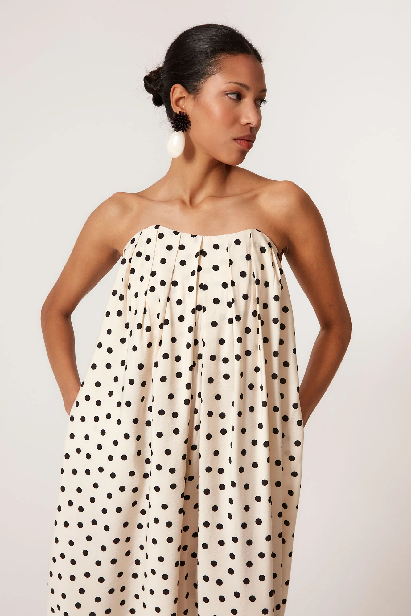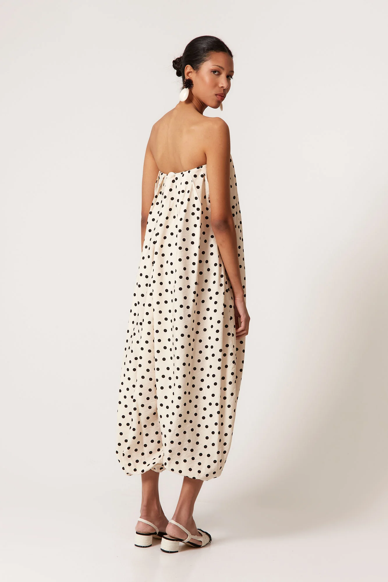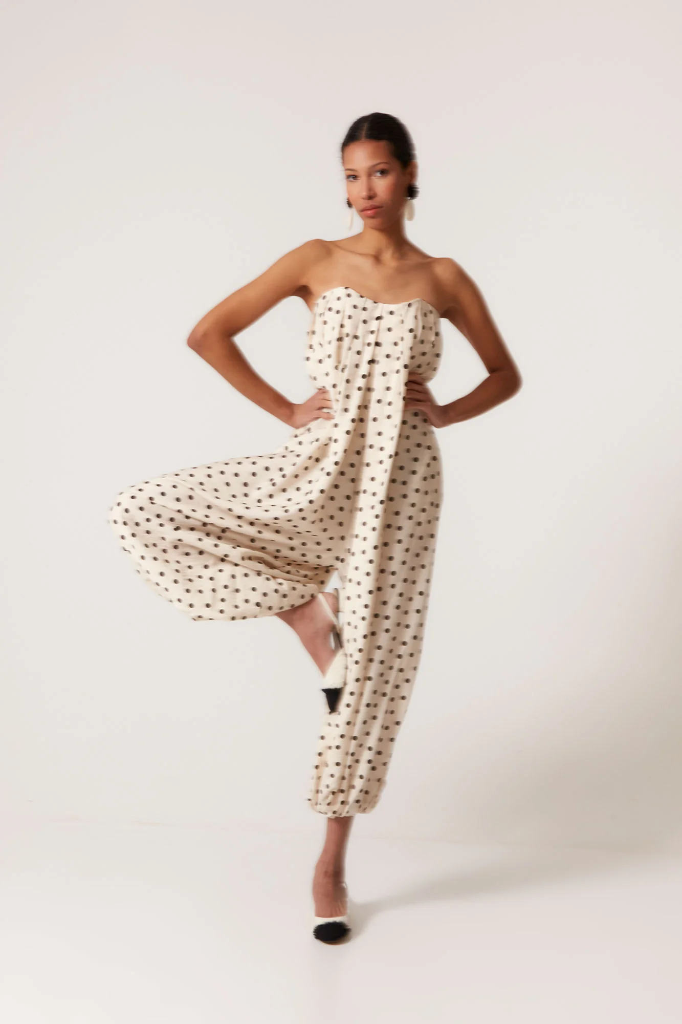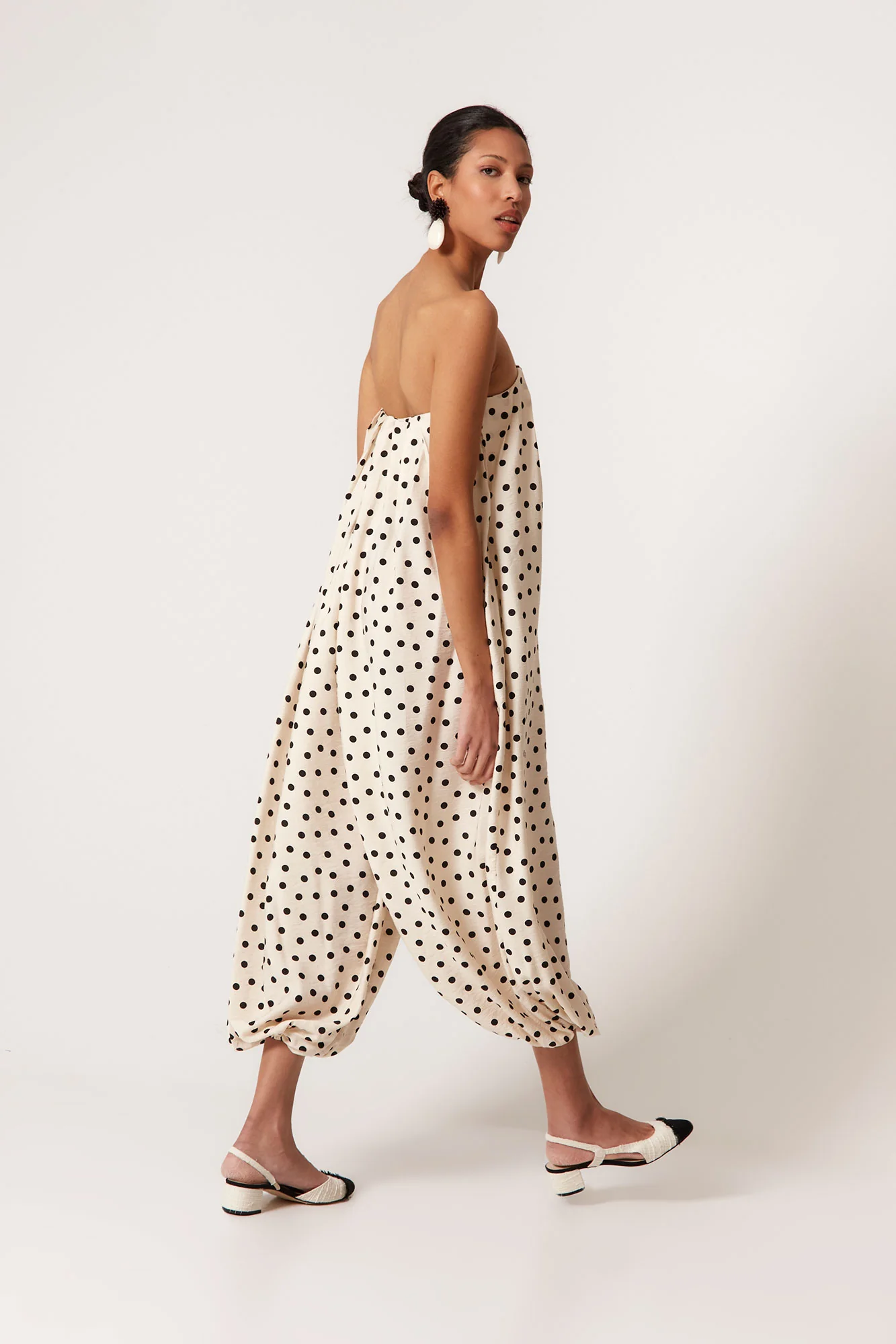 Confeccionado en un tejido ligero de caída envolvente, este mono largo palabra de honor destaca por su estampado de lunares negros sobre fondo crudo, un clásico atemporal reinterpretado en clave contemporánea. Su escote recto con frunce elástico aporta comodidad y sujeción, mientras que la silueta amplia y vaporosa crea un efecto vestido al caminar, aportando dinamismo y sofisticación.