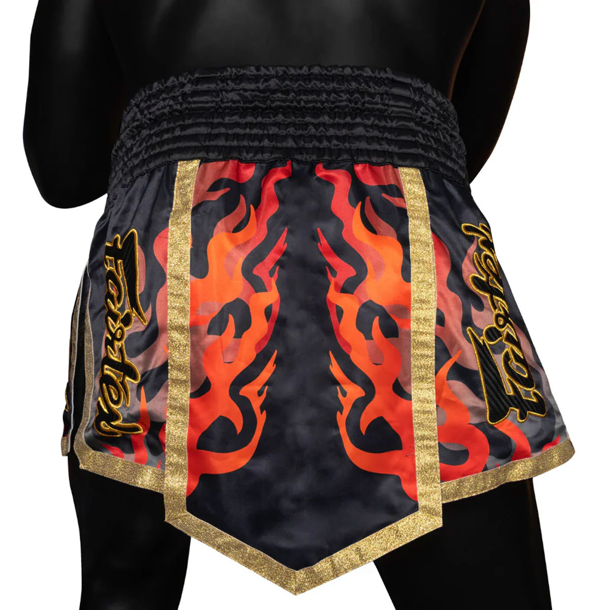 Los Pantalones cortos kick-thai Fairtex BS2501 Aquila Edición Limitada iluminan tu look con un diseño de llamas sobre raso negro y acabados dorados: estilo guerrero que se ve desde lejos. Diseñados para Muay Thai y Kickboxing, están hechos para quienes quieren presencia escénica y rendimiento. Este modelo sin forro interior, recomendamos combinarlo con Pantalones cortos de compresión.