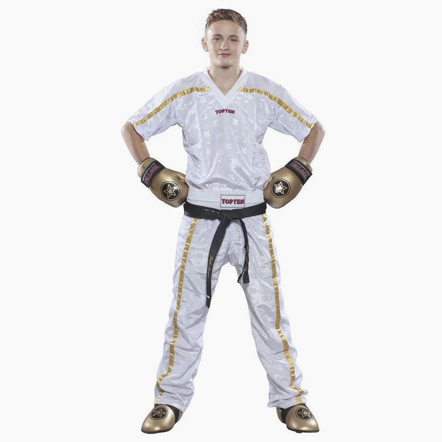 Los Pantalones de kick boxing Top Ten Mesh Star Collection están hechos de poliamida fina, un tejido ligero y resistente, con el logo Top Ten impreso en el tejido. En las piernas hay inserciones de malla que permiten la transpiración del sudor y la humedad, para mantener el cuerpo fresco y seco durante los entrenamientos. Tienen una cómoda banda elástica en la cintura, se secan en pocos minutos y no necesitan ser planchados. Adornados con detalles dorados tanto en la versión blanca como en la negra.