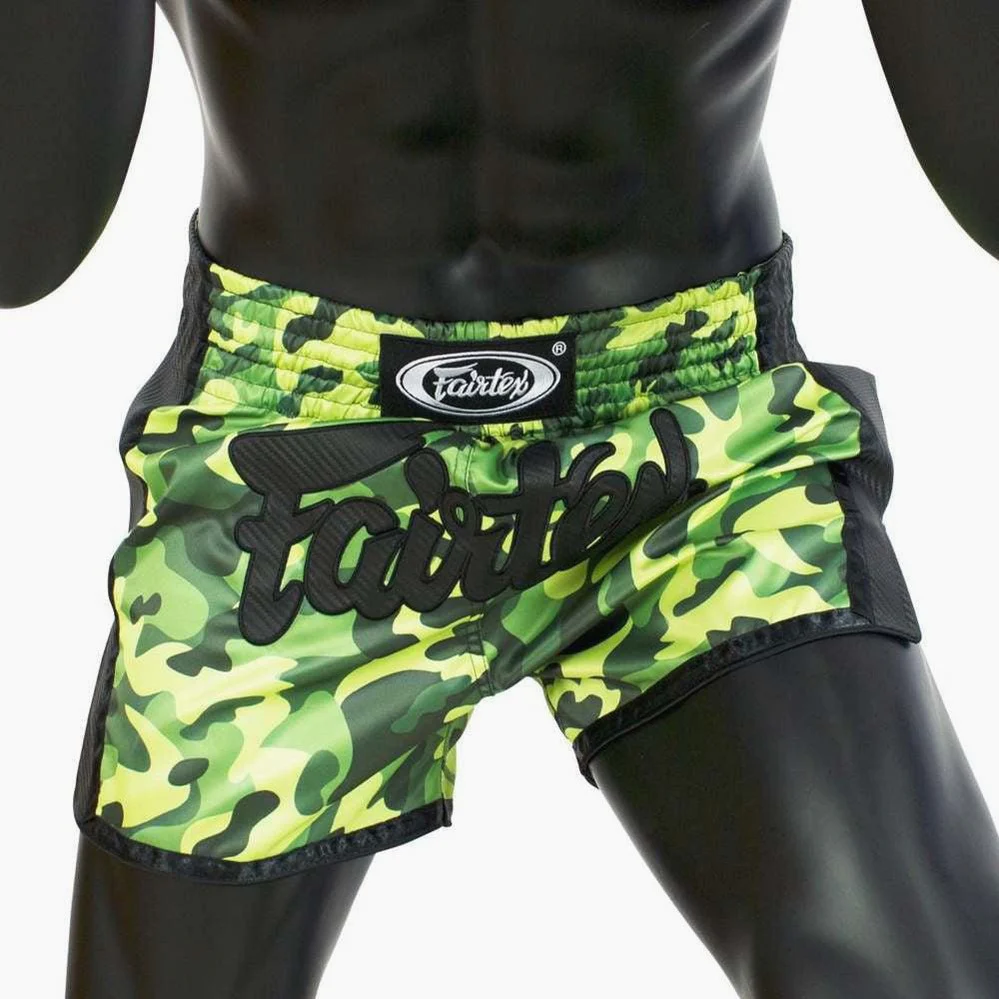 Los Pantalones cortos Fairtex BS1710 Green Camo son unos shorts de Muay Thai fabricados en Tailandia. Caracterizados por un nuevo diseño, tienen un corte ajustado y aberturas laterales profundas, que permiten realizar con total libertad técnicas de patadas y rodillazos. Resistente y con un aspecto brillante y elegante, el satén del pantalón corto se distingue por el estampado camuflaje en tonos verdes. De color negro encontramos el logo Fairtex, los insertos de malla transpirable y el ribete, que proporciona mayor resistencia.