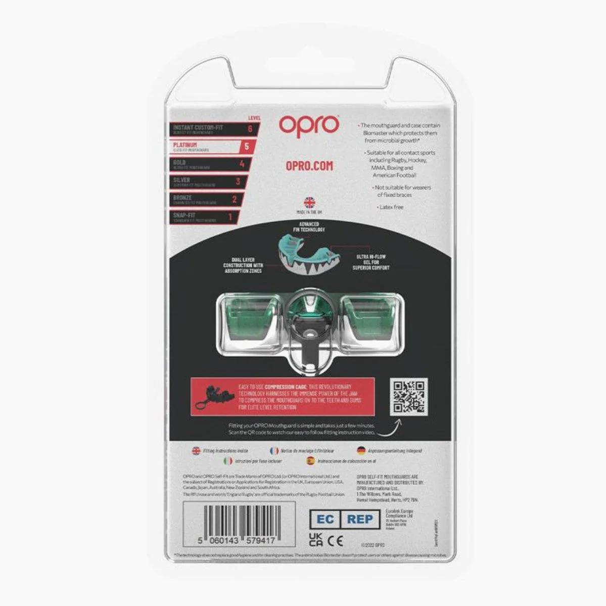 El Protector bucal Opro Platinum Fangz es ideal para quienes desean una protección de alto nivel para entrenamientos y competiciones. Fabricado en el Reino Unido, cuenta con una estructura de doble capa con zonas de absorción adicionales, protege eficazmente dientes y encías. Sencillo de moldear, está equipado con aletas internas que se moldean como desees, siguiendo el contorno de tus dientes y encías. Provisto de mango y jaula de compresión para el moldeado, resulta práctico de utilizar.