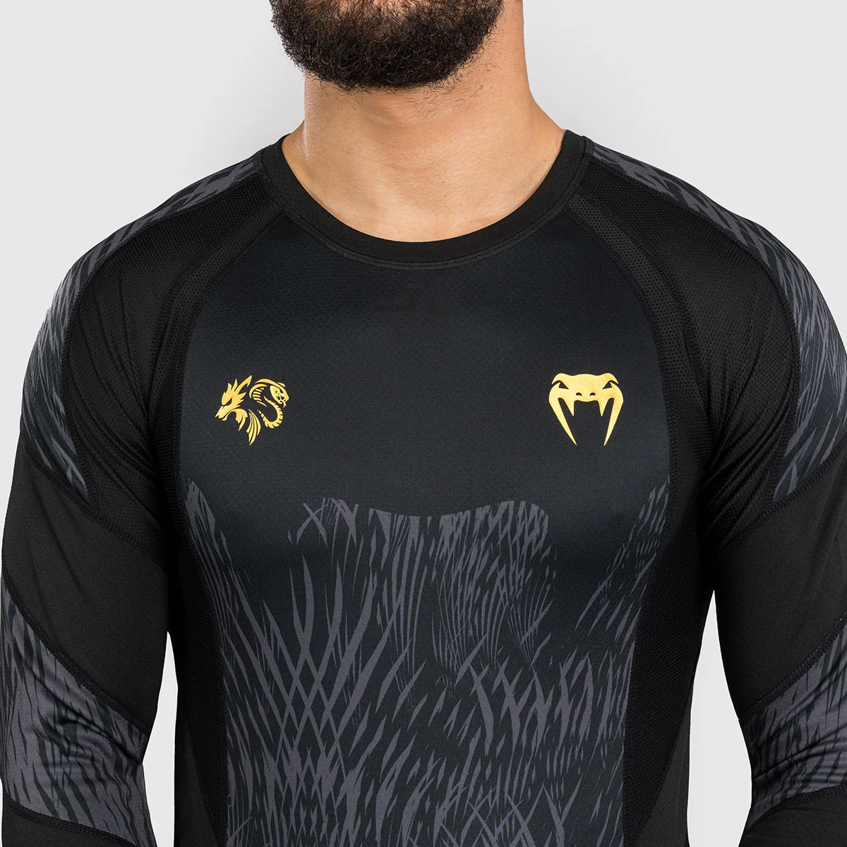 El diseño se inspira en la energía del Borz (lobo en checheno), símbolo de agresividad controlada y espíritu de depredador. Los gráficos negro-gris rinden homenaje al pelaje del animal, mientras que los detalles dorados Venum x Chimaev completan un estilo exclusivo y poderoso. Perfecta para entrenar con garra, tanto sola como primera capa bajo el gi.