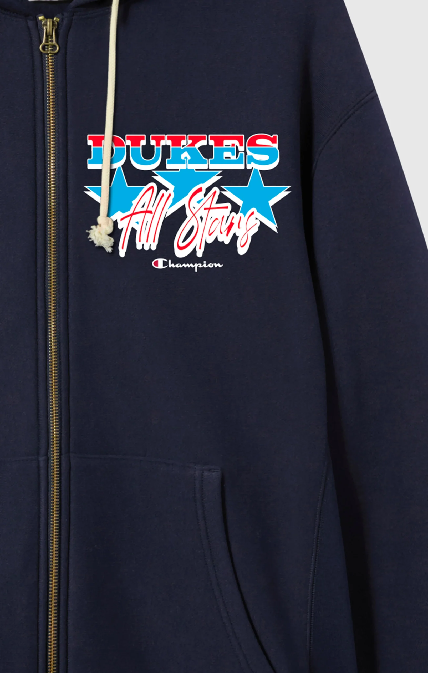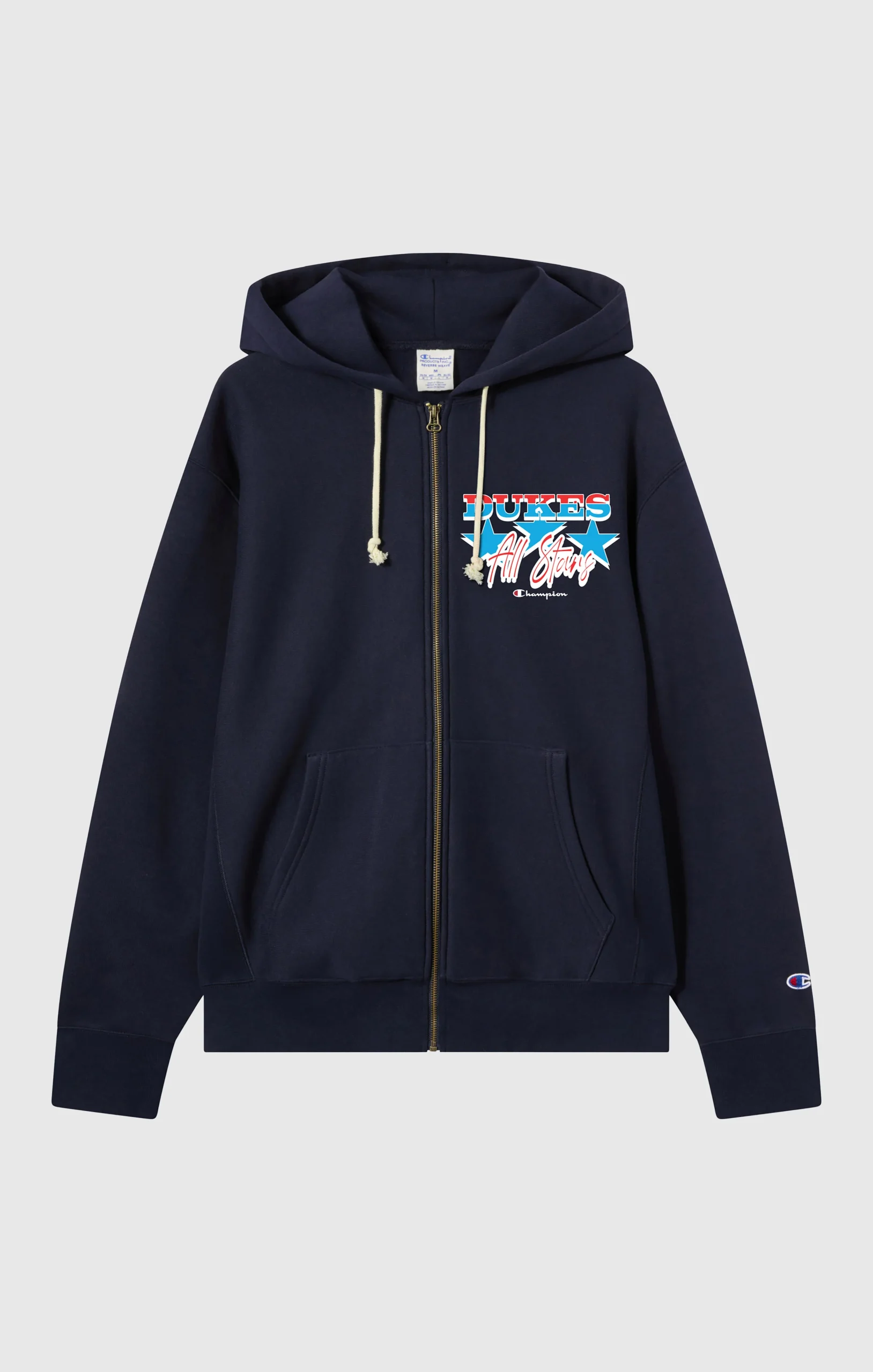 This oversized full-zip hoodie, made from durable Reverse Weave fabric, is designed to last and provide maximum comfort. It is part of an exclusive capsule created by Champion & Dukes Cupboard, a vintage streetwear specialist and go-to destination for stylists, collectors, and enthusiasts in search of unique and authentic pieces. The capsule celebrates a series of Champion x Dukes Cupboard All Star basketball games — events staged across Amsterdam, London, and Paris starting May 2, bringing together creators and talent from local communities. The pieces deliver Champion’s authentic basketball aesthetic, enhanced by original Dukes Cupboard graphics.@@@Loose Fit: relaxed fit featuring extra fullness for peak comfort and style, designed to sit loosely without clinging |400 gsm heavyweight Reverse Weave fleece fabric with a brushed interior, soft and warm |82% Cotton, 18% Polyester |Iconic C logo patch embroidery to left sleeve |Country of origin: imported