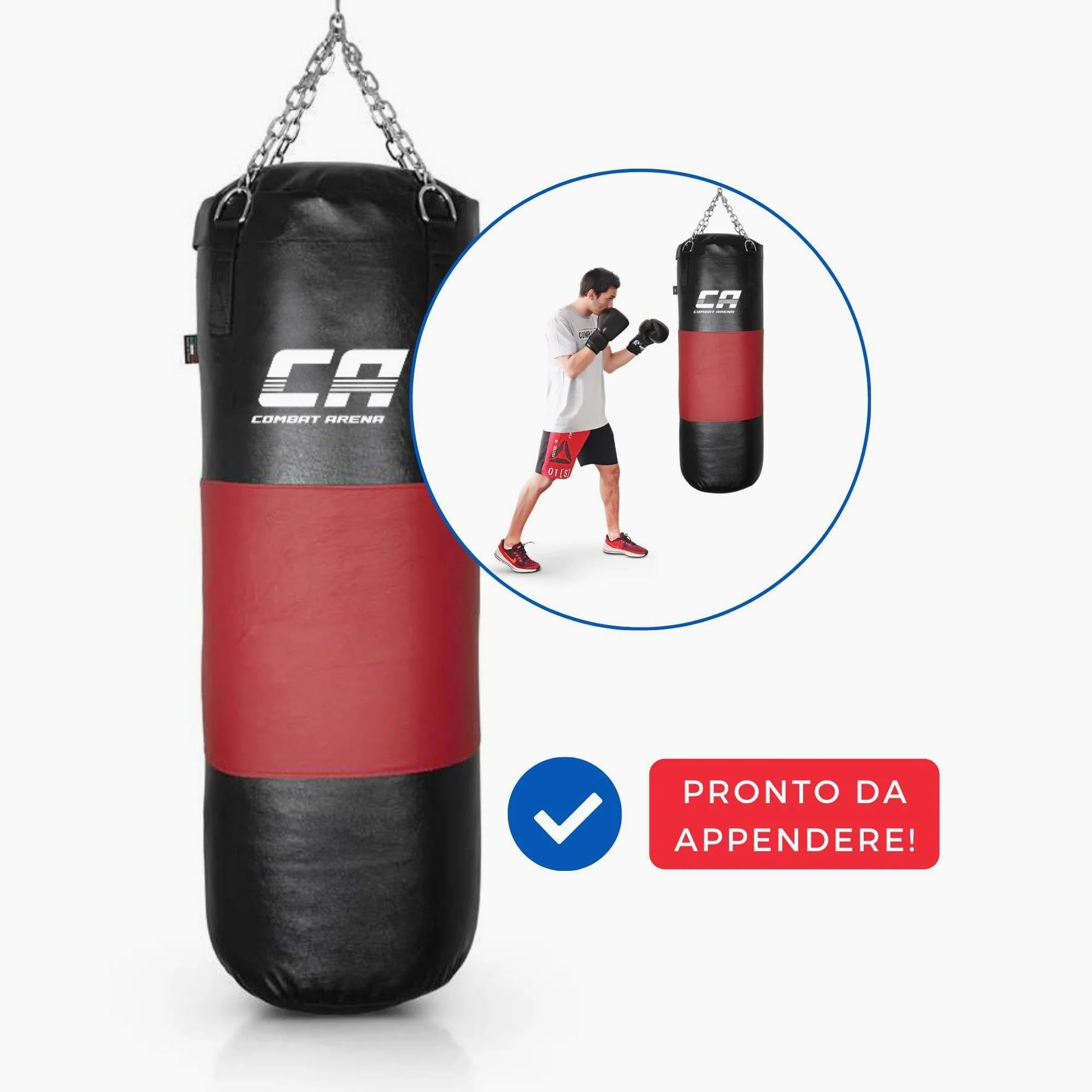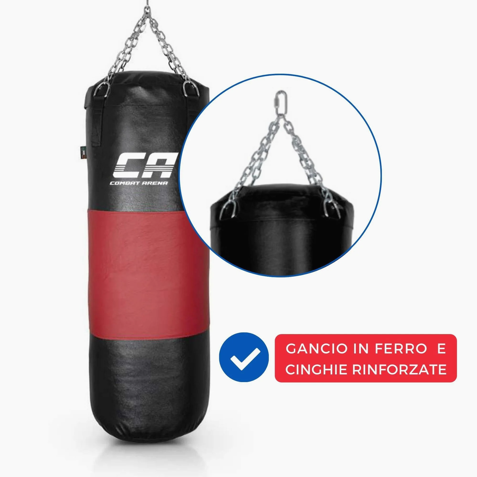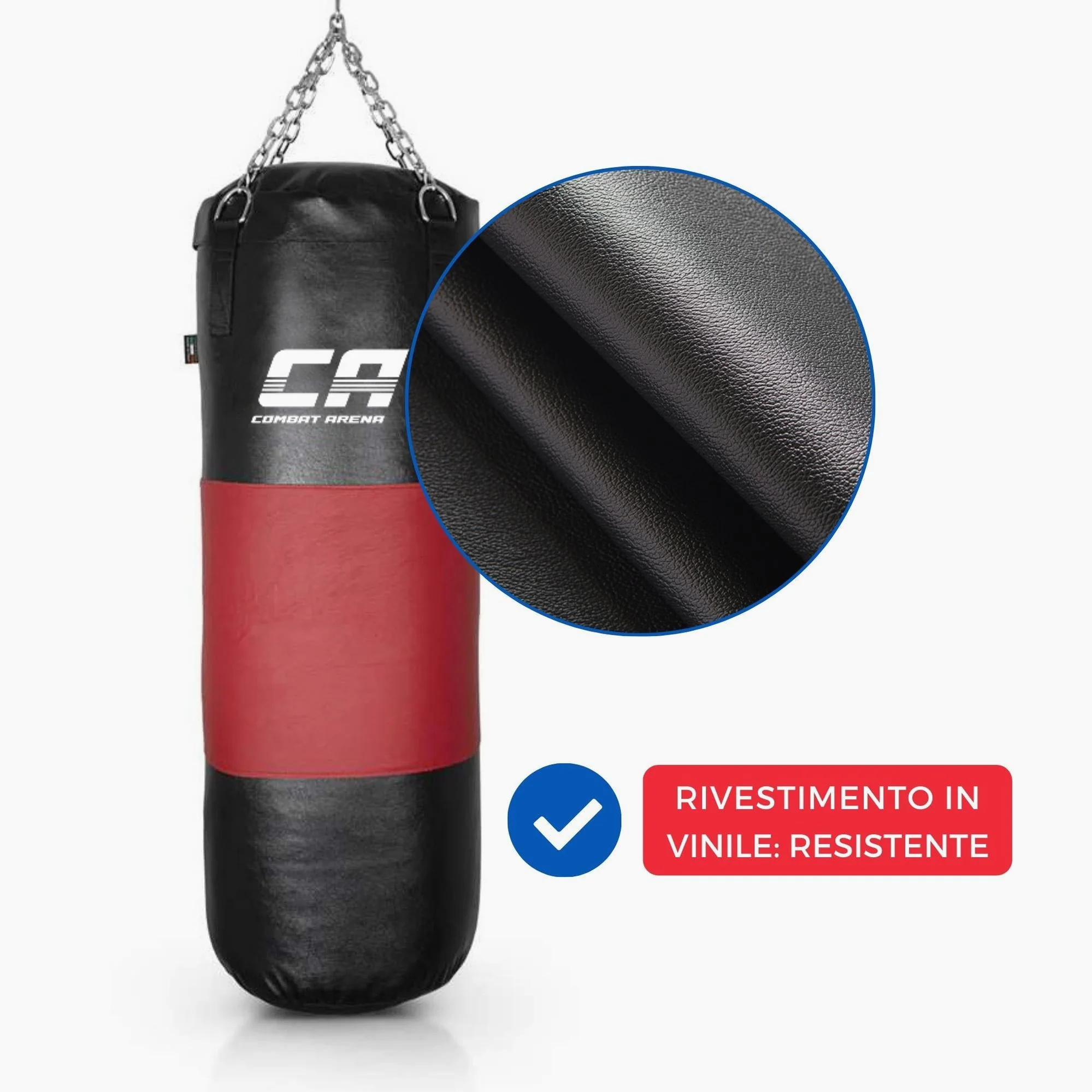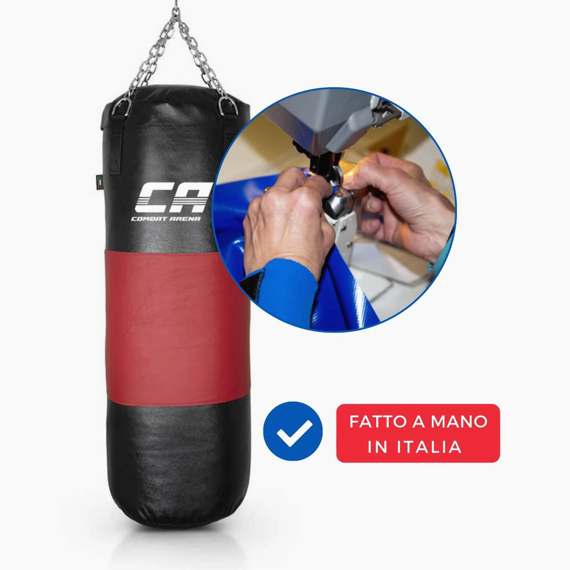 El Saco Combat Arena con Correa de cuero tiene un peso de 40 kg y una altura de 100 cm. Producido artesanalmente en Italia, es un Saco de Entrenamiento avanzado. Se distingue por la correa central de cuero y el relleno de tela con la adición de una bolsa de arena. El Saco absorbe eficazmente los golpes y mantiene la forma con el tiempo.