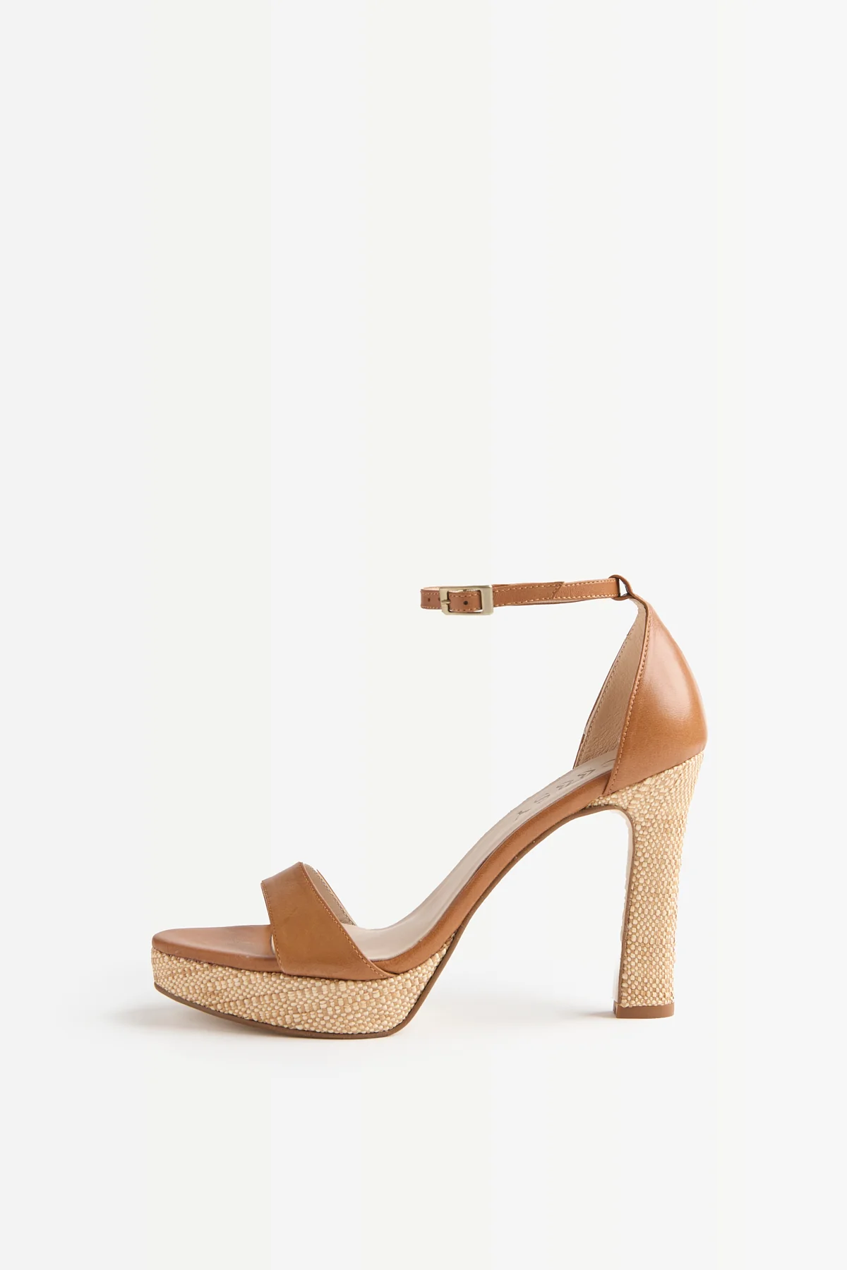 Su plataforma y tacón alto revestidos en rafia natural crean un contraste cálido con el acabado en tono camel, evocando un estilo mediterráneo y atemporal. Además de aportar altura, la plataforma mejora la comodidad y estabilidad, convirtiéndola en una opción perfecta para eventos, looks de invitada o estilismos estivales más relajados.