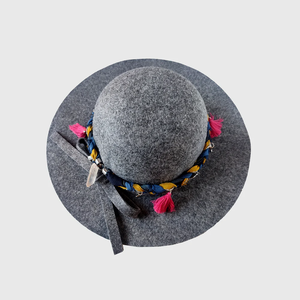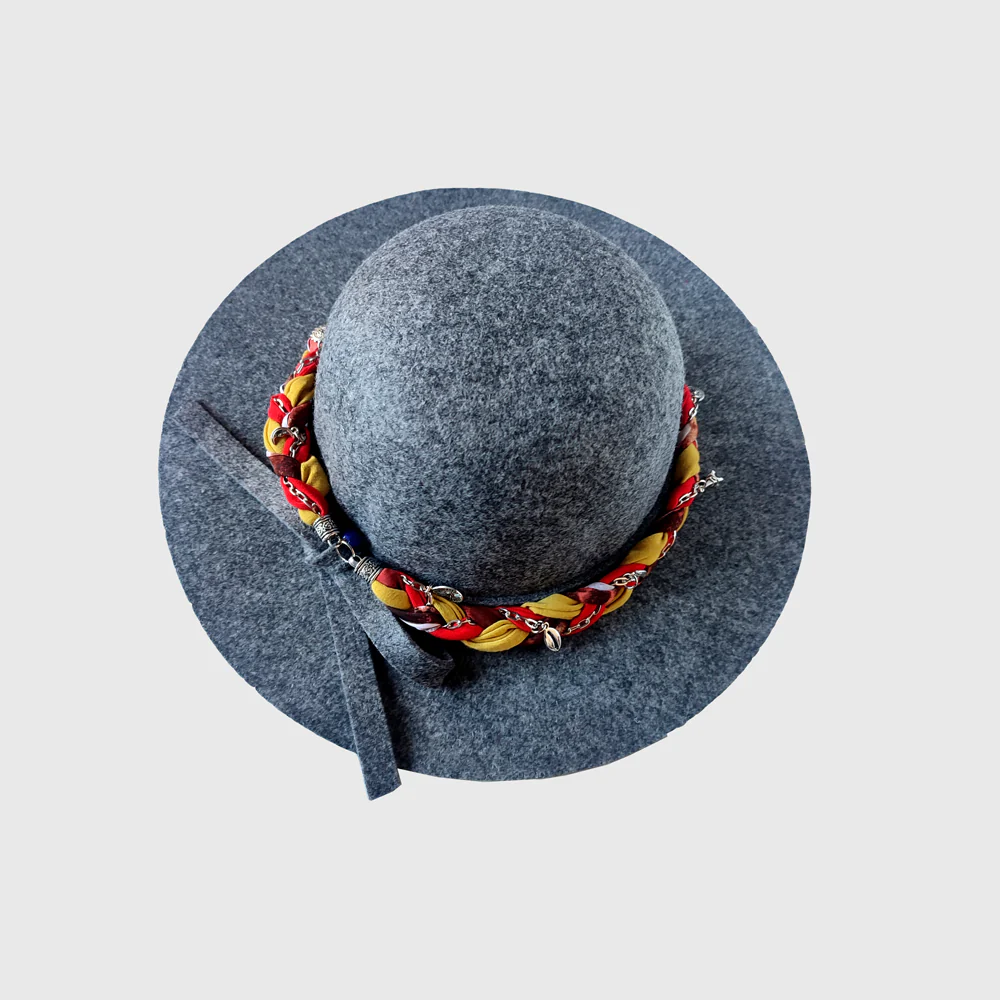 Terminación hecha a mano con tela reutilizada en color gris con amarillo, tiene aplicaciones metalicas y borlas rojizas que rodean todo el sombrero y un dige en la parte de atrás.