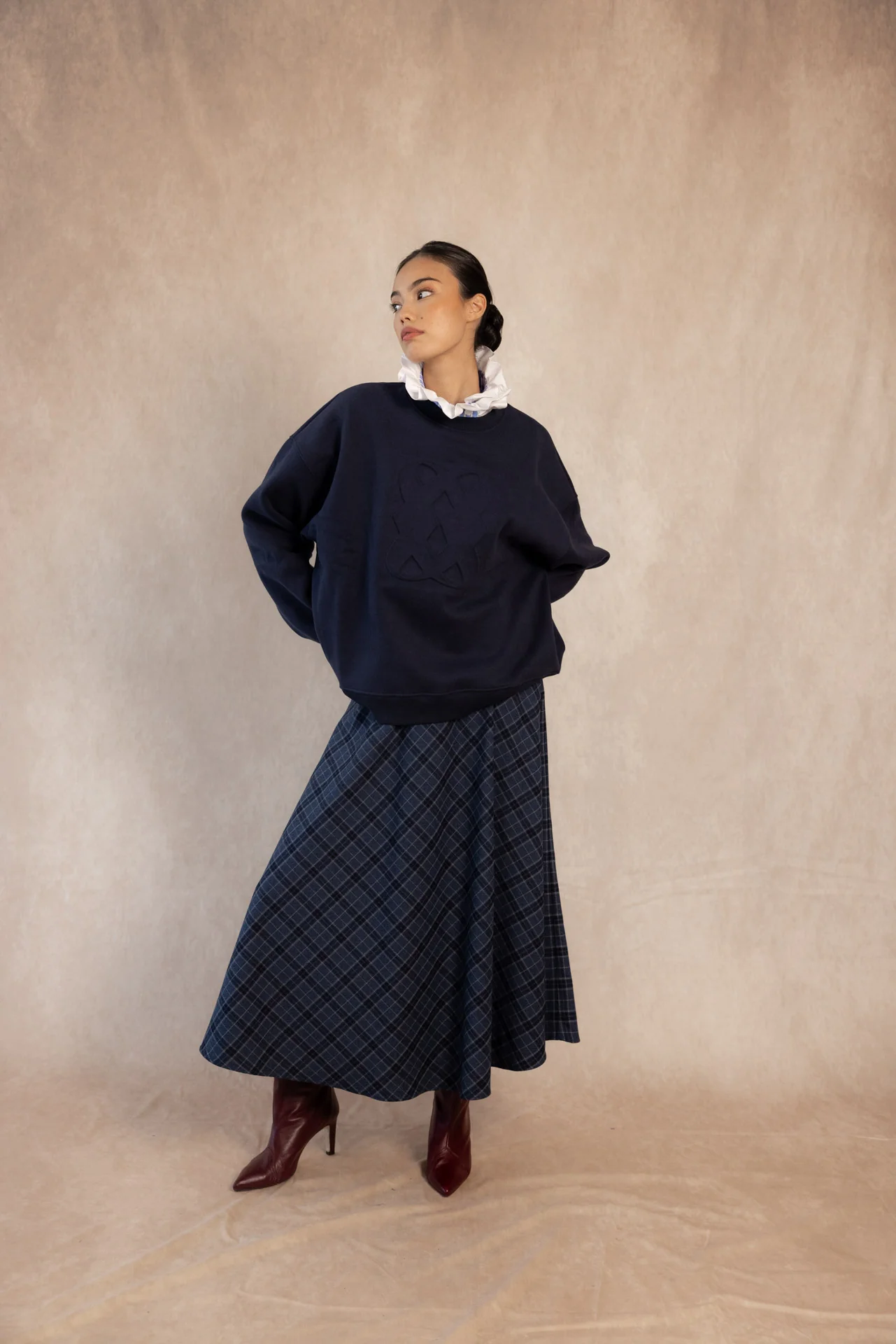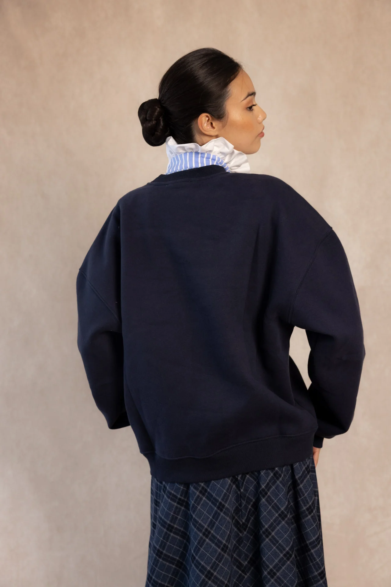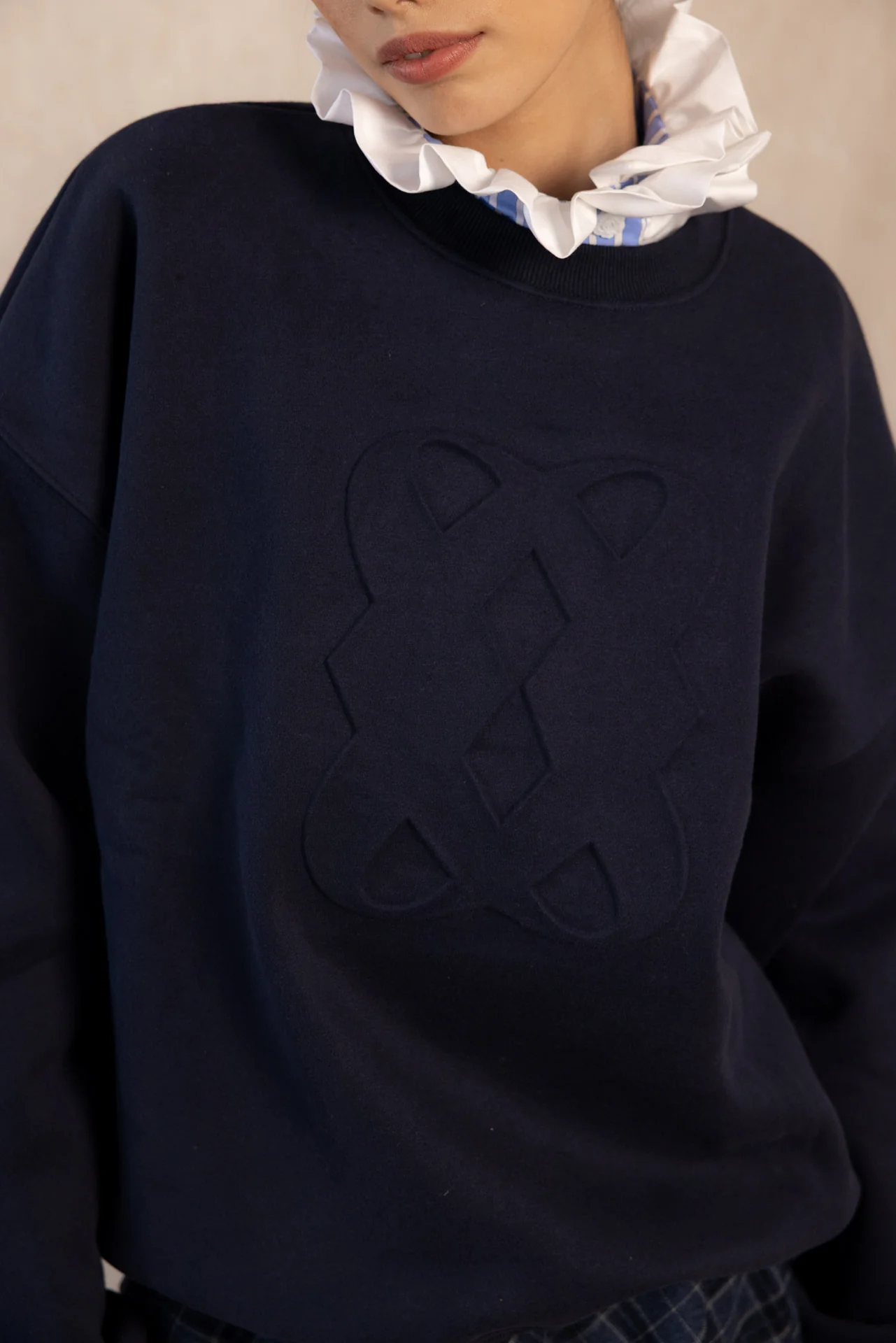 Su diseño oversize, de corte relajado y cuello redondo, la convierte en una pieza versátil y atemporal. Ideal para combinar con camisas de cuello volante, faldas midi o tus jeans favoritos, logrando un look effortless con personalidad.