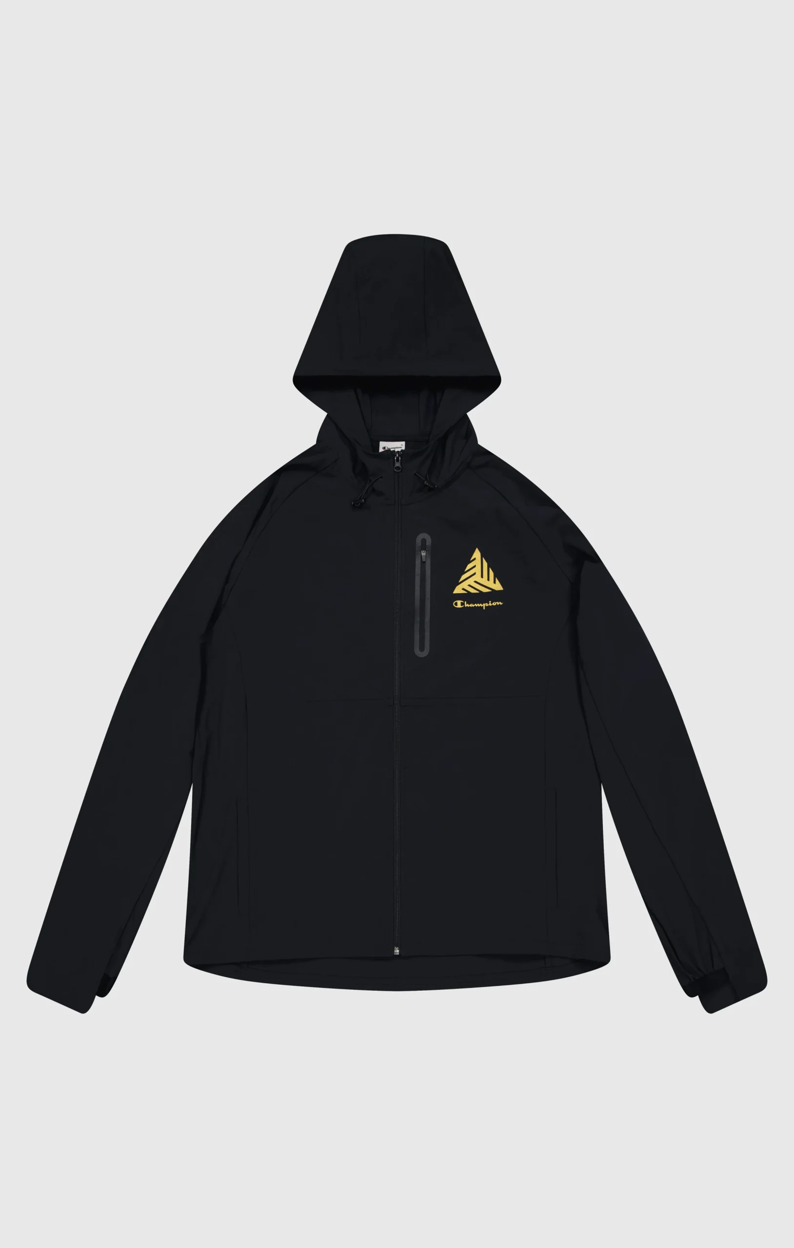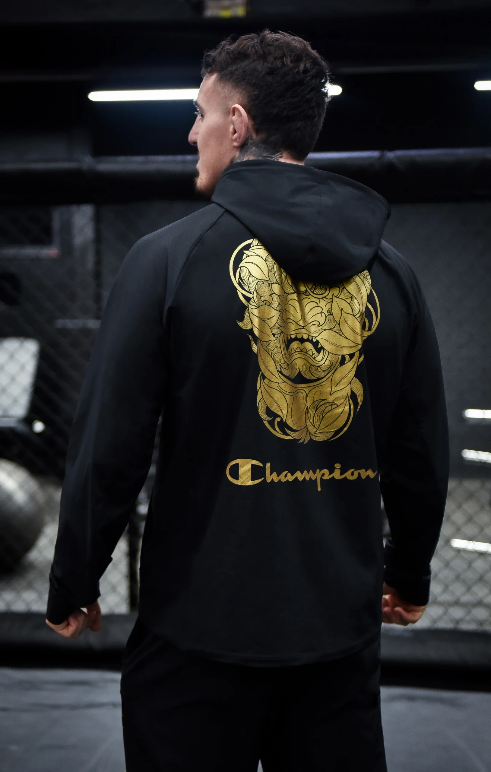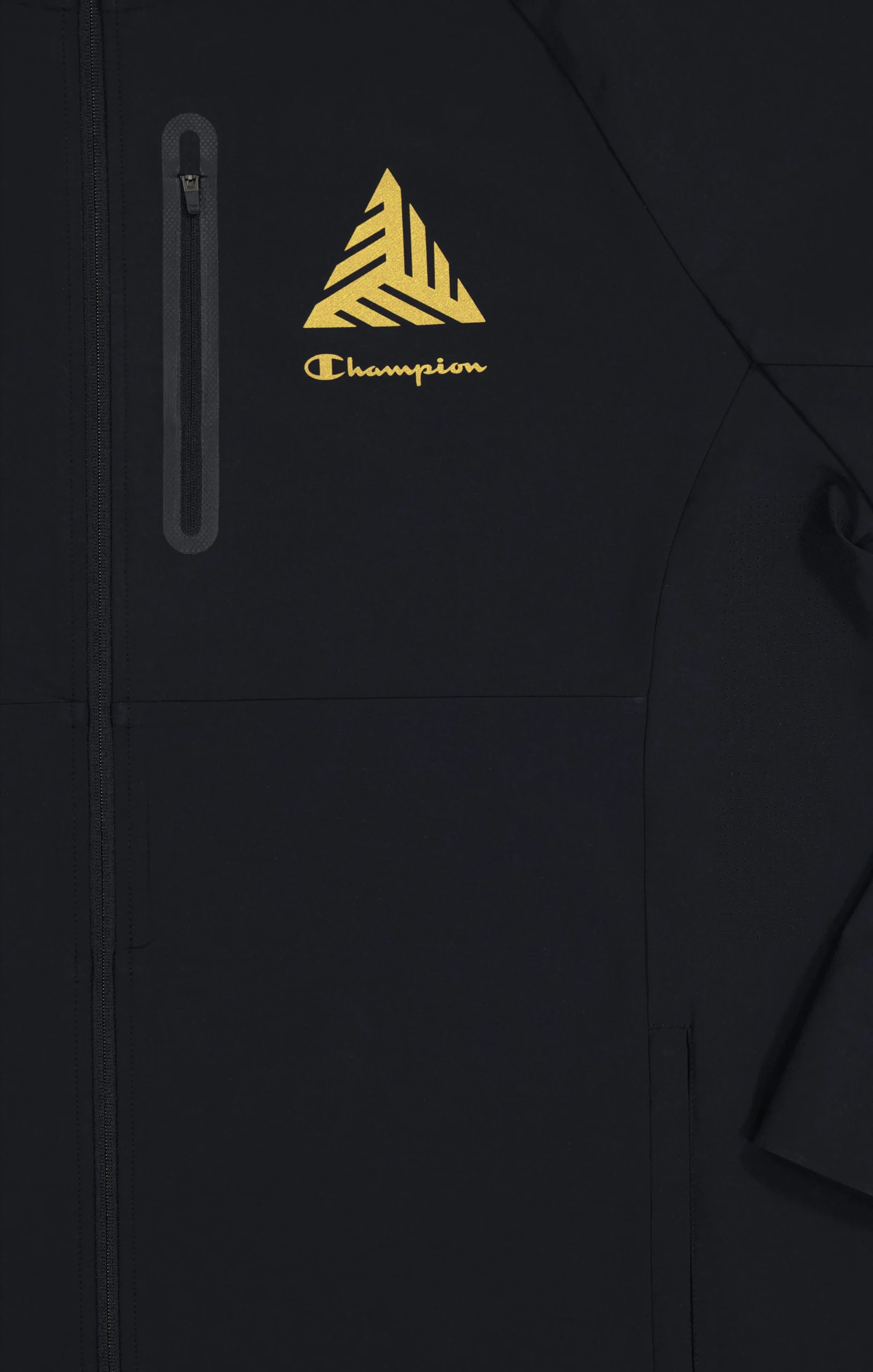 This hooded track top is the result of the exclusive collaboration between Champion and Tom Aspinall, blending performance, style, and a bold visual identity. Crafted from woven stretch fabric, it ensures comfort, durability, and full freedom of movement, adapting perfectly to the body thanks to its slim fit. The design features a range of functional details: ergonomic sleeves with an asymmetric construction (longer on top and elasticated underneath), a rounded hem for a dynamic silhouette, and a heat-sealed chest pocket that adds a clean, technical finish. But it’s the back graphic that truly stands out: a striking gold print inspired by one of Tom Aspinall’s personal tattoos — a symbol of protection rooted in Japanese artistic tradition — turning the garment into a powerful visual statement of strength, focus, and fighter spirit. The front branding celebrates the meeting of two worlds: the relentless athlete and the legacy of Champion sportswear.@@@Fabric: Stretch Poly Woven 115 g/m² |Composition: 88% polyester – 12% elastane |Adjustable hood for enhanced protection |Full front zip for practicality and comfort |Chest pocket with zip closure |Ergonomic lines for optimal freedom of movement |Technical and modern design suitable for multiple occasions |Fit: Slim Fit – Close-fitting but not tight. The garment follows the body’s natural shape for a streamlined silhouette.