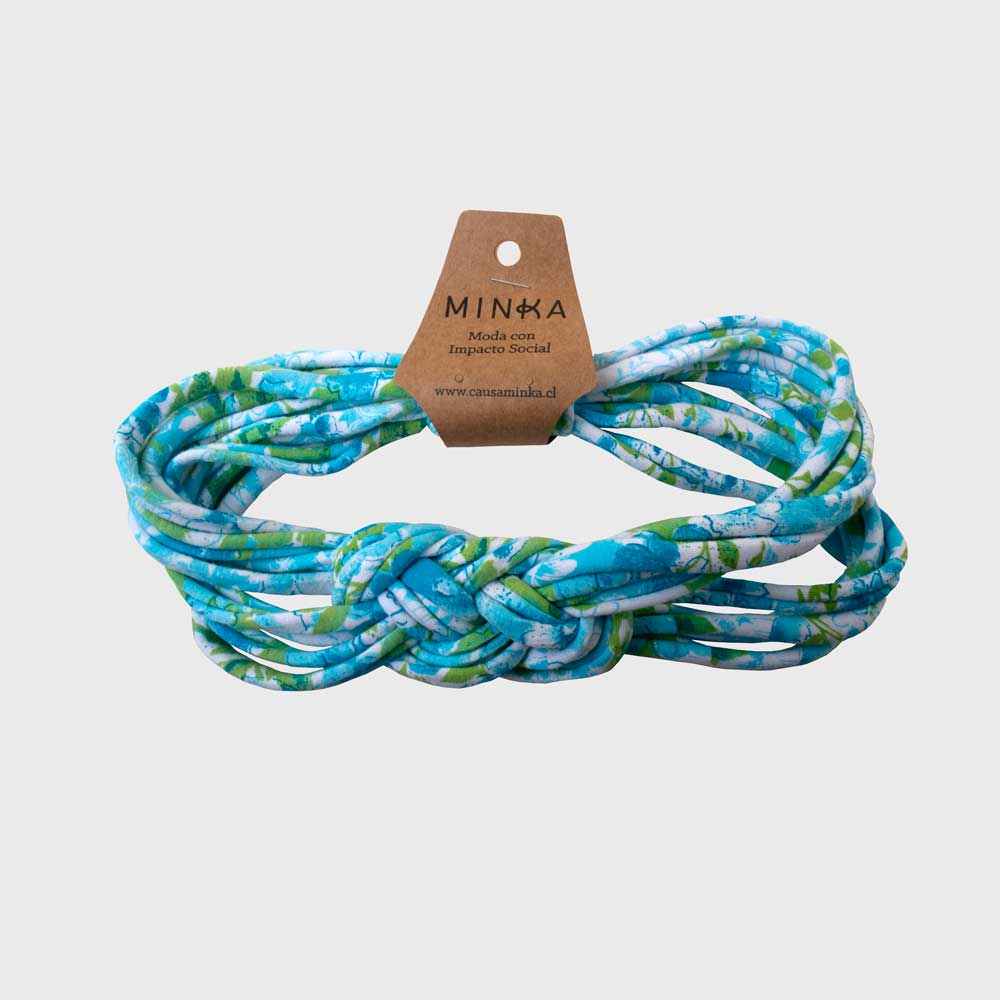 Está hecho a mano por nuestras artesanas en Recoleta, Maipú, Peñalolén y Estación Central, usando tela reutilizada que proviene de excedentes de la industria textil.