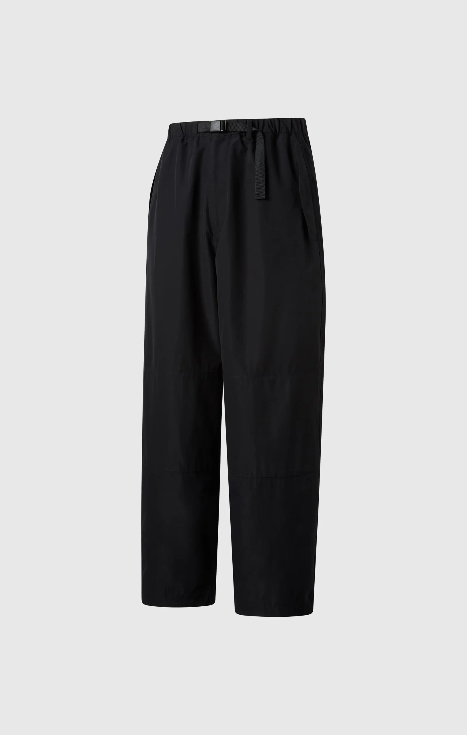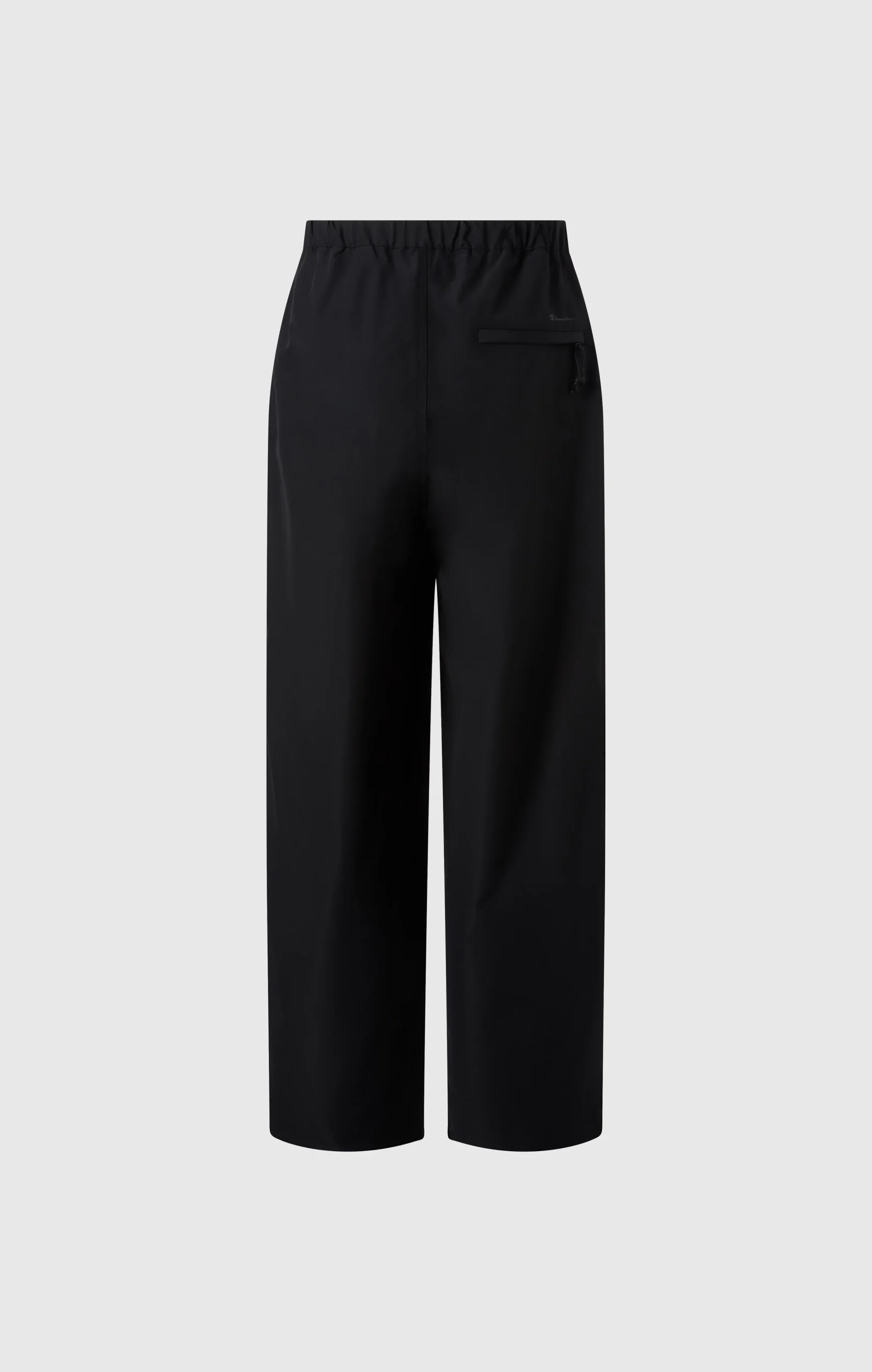 Made from 100% polyester fabric with high stretch and a firm structure, these long pants offer comfortable wear and ease of movement across a wide range of situations. Inspired by military overpants, they feature a full-length straight wide silhouette. Designed as a unisex item with a flexible size range, they can be worn true to size or styled oversized, allowing for versatile styling according to individual preference. Double-knee construction at the knees adds a distinctive military-inspired detail. In addition to flap pockets on both sides, a zippered pocket is placed on the right hip to enhance storage capacity. The hem is equipped with a drawcord for adjustable size and silhouette. The elasticated waist provides comfort, while the front webbing belt allows for an adjustable fit. A tonal matte rubber Champion® logo is printed above the right hip pocket, and a transfer-printed Champion® label is applied on the interior. These understated details are characteristic elements that express the minimal and refined style of CHAMPION BLACK EDITION.@@@Waist Waving Belt |Side Flap Pockets | Right Back Zip Pockets |Double Knee |Hem Drawcord Adjustment |Matt Rubber Print |Transfer Print Name Label |Composition: 100% Polyester |Weight: 140 g/m²