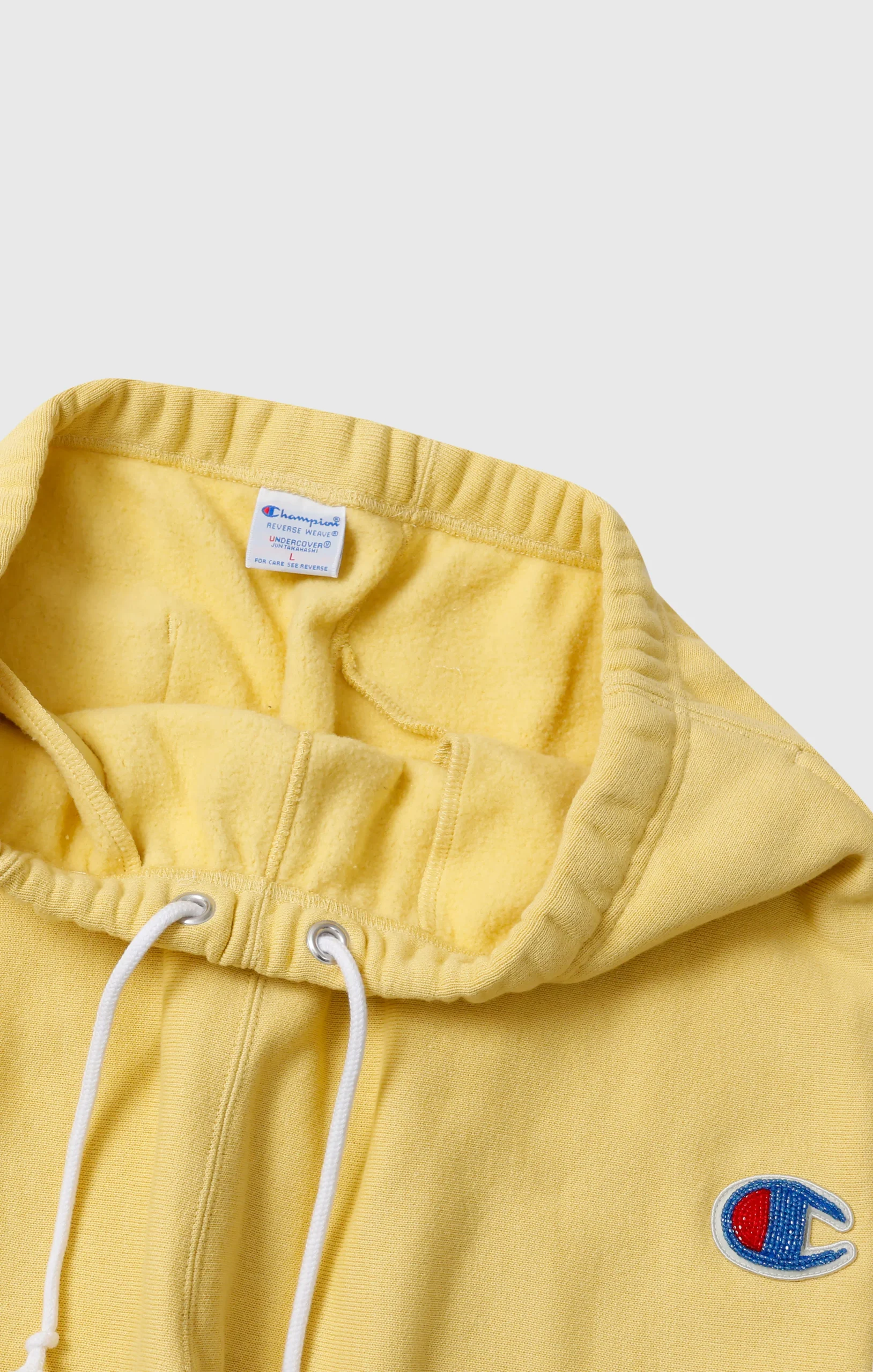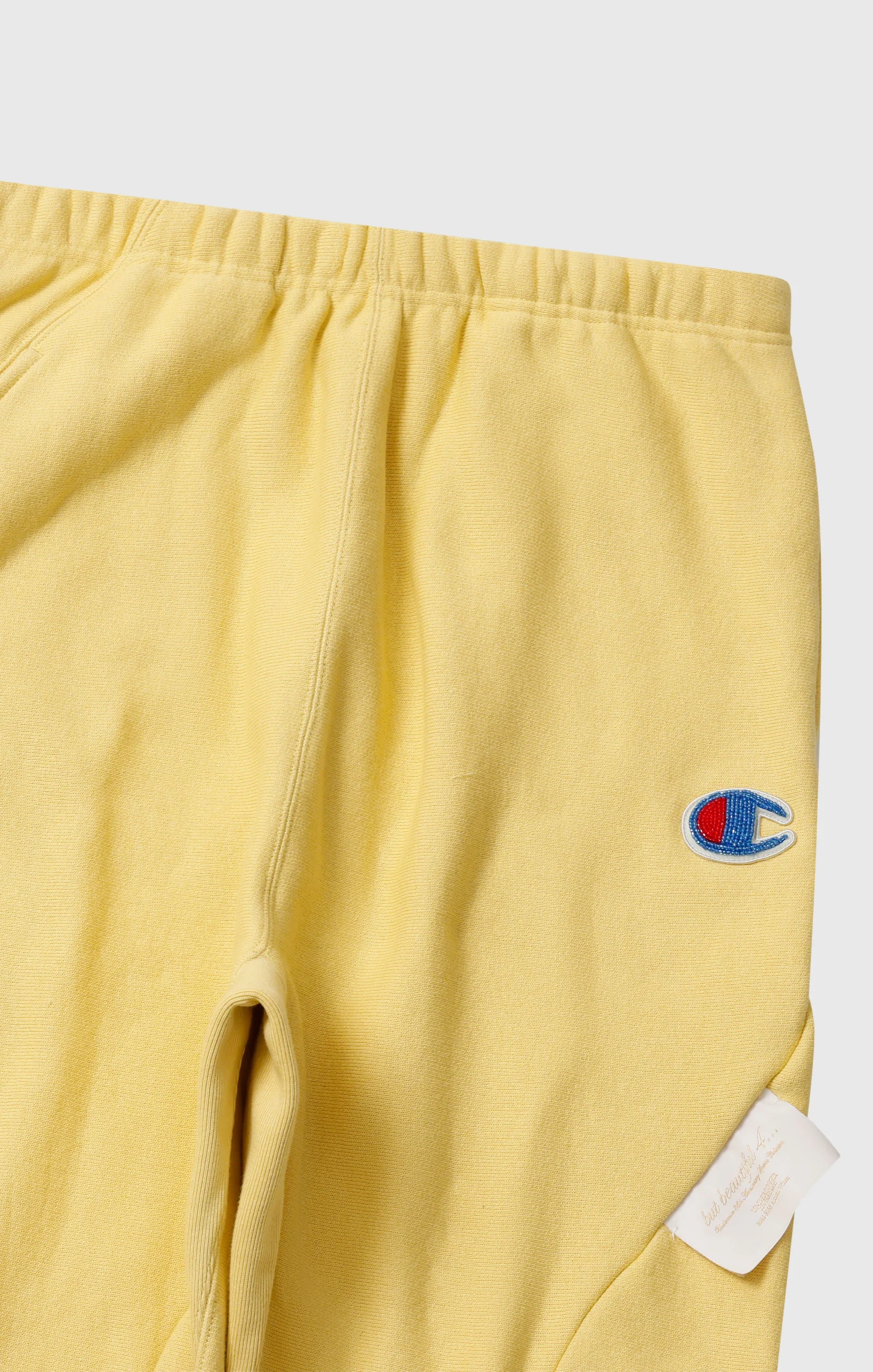 This is the second collaboration with UNDERCOVER by Jun Takahashi. As with the previous collection, it features Champion’s signature “REVERSE WEAVE®” construction. This sweatpant is made from a substantial 11.5oz heavyweight fabric offering a soft and comfortable feel while maintaining durability. It features a brushed fleece back that becomes tougher with each wash and develops a unique texture and character the more it’s worn. The joggers incorporates distinctive details inspired by the concept of the collection, “but beautiful 4…”, such as exposed tags and intentionally distorted stitching lines. The C logo on the left thigh is expressed with luxurious bead embroidery, while the jock tag on the right hip is crafted with metallic threads, adding a touch of elegance. A special woven label featuring the logos of both brands symbolizes this collaboration.@@@Reverse Weave® Technology: Champion’s iconic construction designed to reduce vertical shrinkage and ensure maximum durability. |Fabric: 11.5oz (≈ 390 g/m²) CVC Terry Fleece — a heavyweight fabric that combines comfort, softness, and long-lasting durability. |Brushed interior: warm and soft. |Padded “C” logo patch: embroidered with beads for a three-dimensional effect. |Elastic waistband: with adjustable drawstring for a comfortable and customizable fit. |Elastic ankle cuffs: for better fit and thermal insulation. |Front pockets and back pocket. |Design details: intentionally irregular stitching and exposed tags inspired by UNDERCOVER’s “But Beautiful 4…” concept. |Collaborative label: Champion × UNDERCOVER by Jun Takahashi.