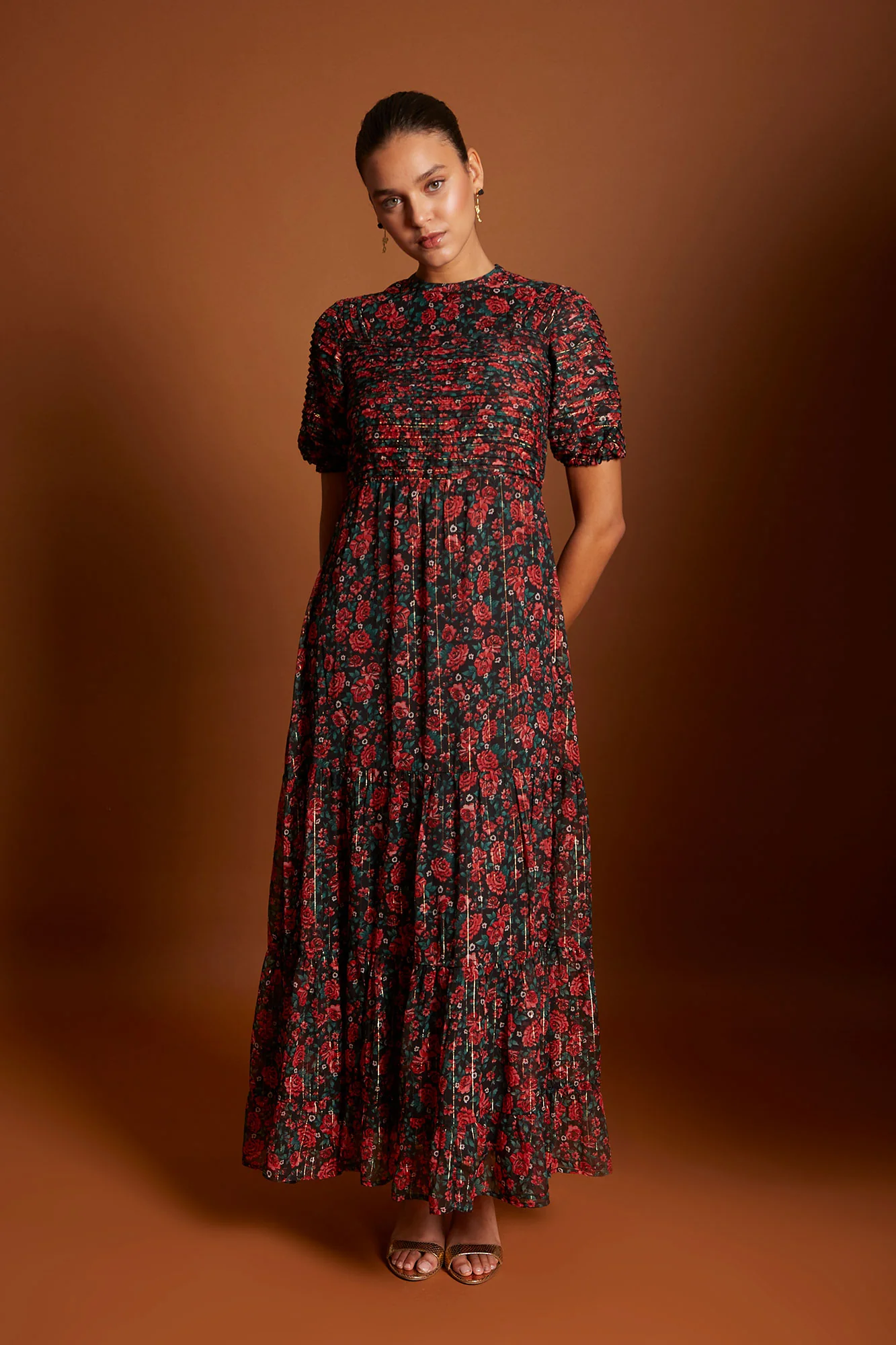 Su diseño de corte largo y fluido estiliza la silueta, mientras que el cuerpo fruncido con nido de abeja realza la figura de manera delicada. Las mangas cortas abullonadas completan el look, aportando volumen y un toque chic muy actual.