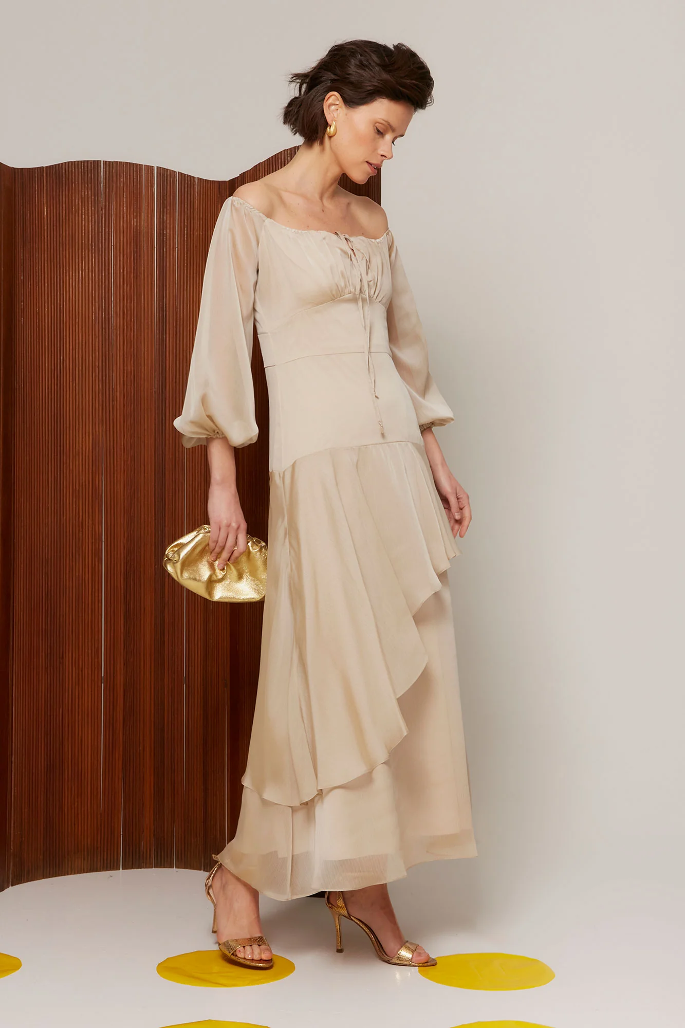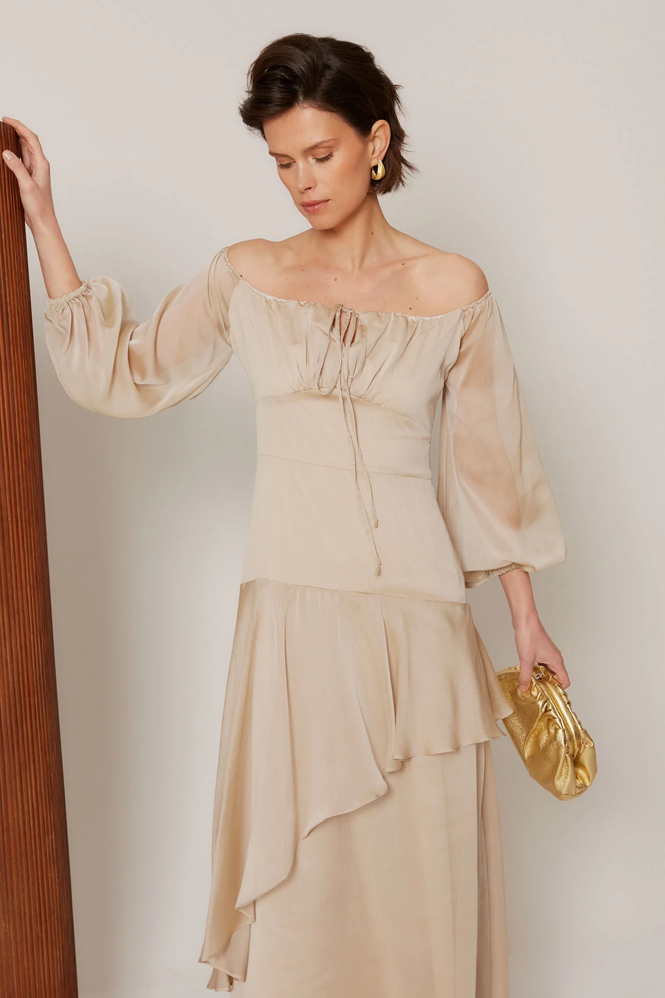Su diseño off-shoulder realza los hombros y el escote de forma sutil, mientras que las mangas abullonadas aportan un aire romántico y refinado. El cuerpo se ajusta delicadamente a la silueta, estilizando la figura, y se completa con un volante asimétrico en la falda que añade dinamismo y un acabado elegante al conjunto.