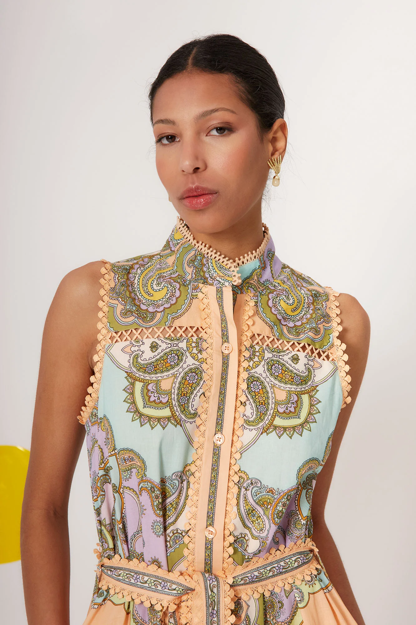Su diseño sin mangas y cuello ligeramente subido estiliza la silueta, mientras que el cinturón a juego define la cintura aportando equilibrio y estructura. El tejido ligero y fluido aporta movimiento natural, y la falda con vuelo añade un aire romántico y elegante que realza cada paso. Los detalles decorativos en contraste enmarcan el diseño y elevan la prenda con un acabado cuidado y distintivo.
