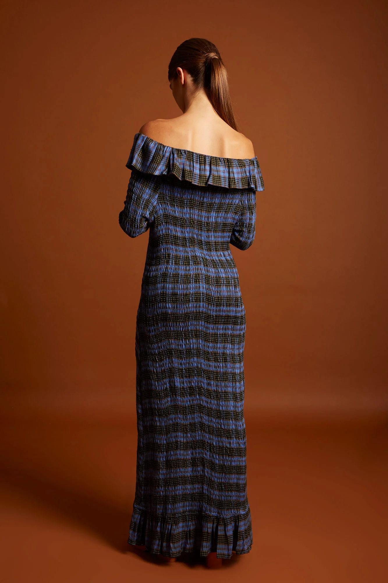 El vestido Charlotte azul es la elección perfecta para destacar en cualquier ocasión. Su diseño largo con estampado de cuadros en azul y negro combina estilo contemporáneo y sofisticación, mientras que el escote bardot con volante aporta feminidad y un aire romántico irresistible.