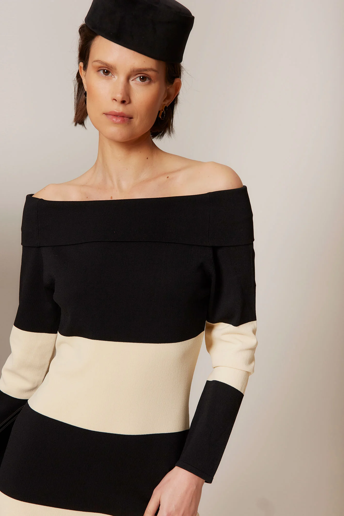 Su escote bardot con hombros descubiertos aporta un aire femenino y contemporáneo, equilibrado con mangas largas que estilizan la silueta. El diseño de rayas horizontales en contraste blanco y negro crea un efecto visual elegante y gráfico, convirtiéndolo en una pieza protagonista perfecta para eventos, cenas o looks de invitada urbana.