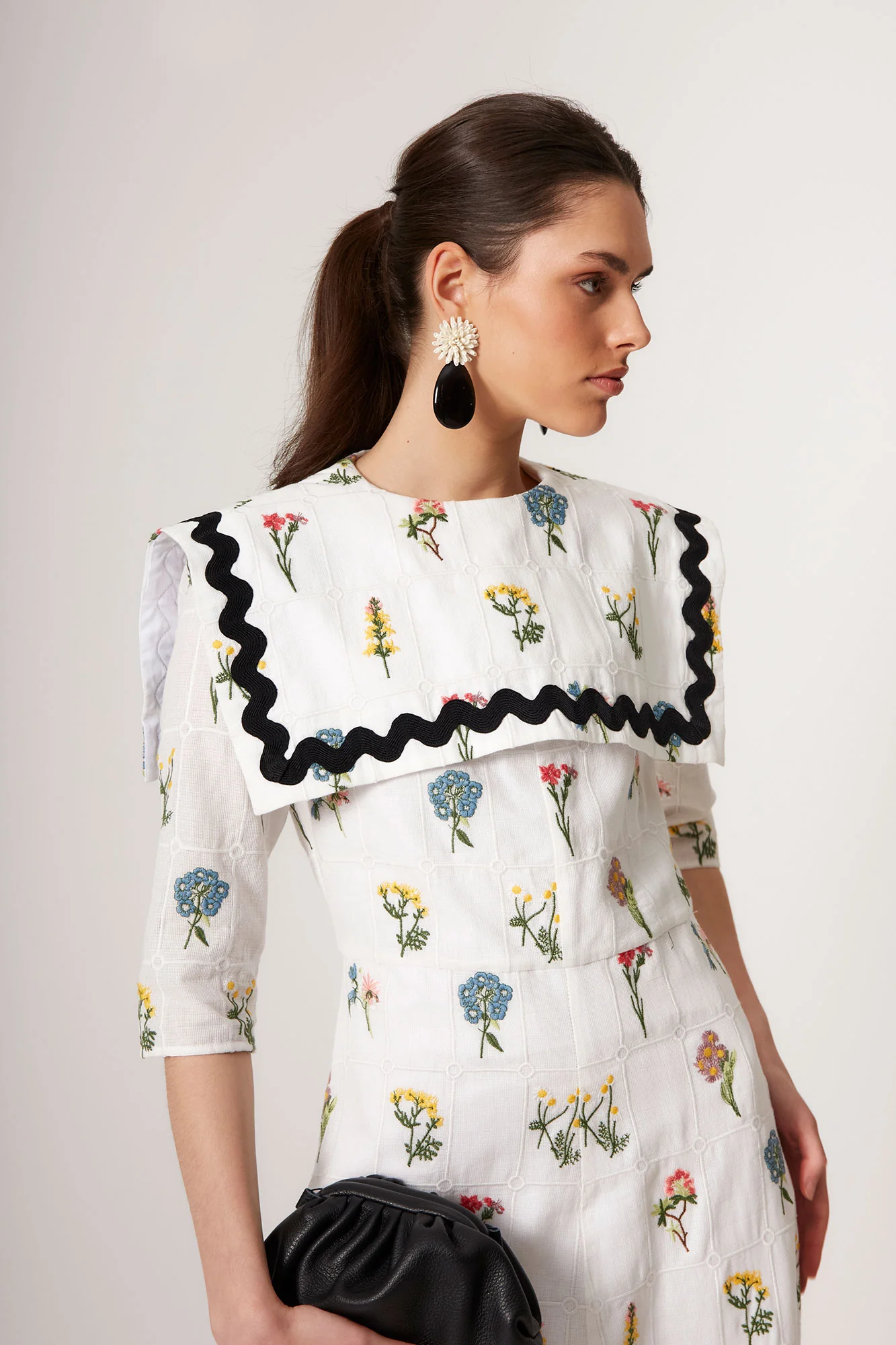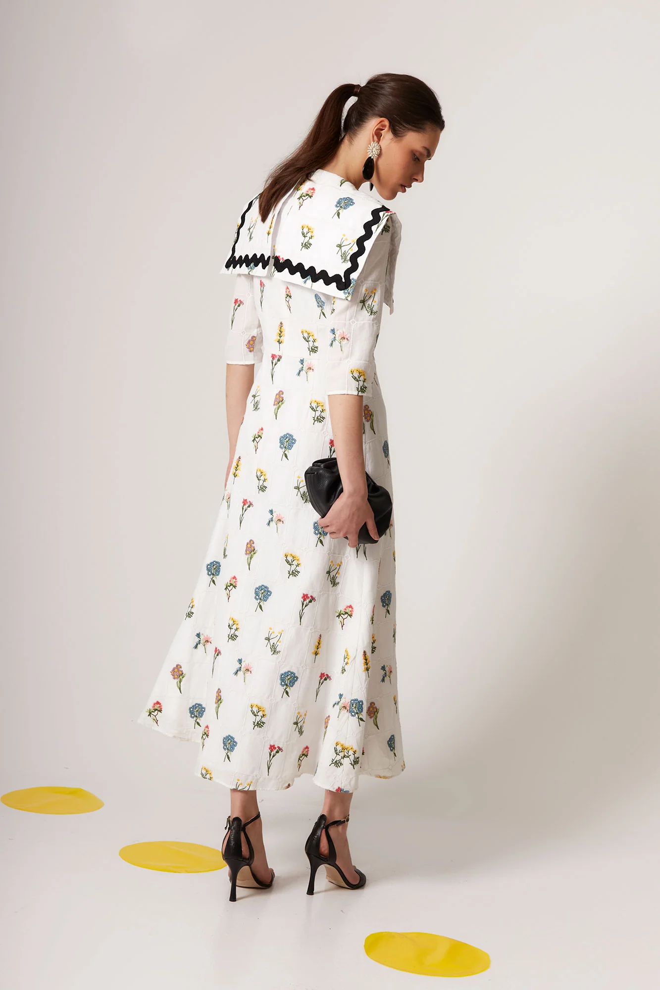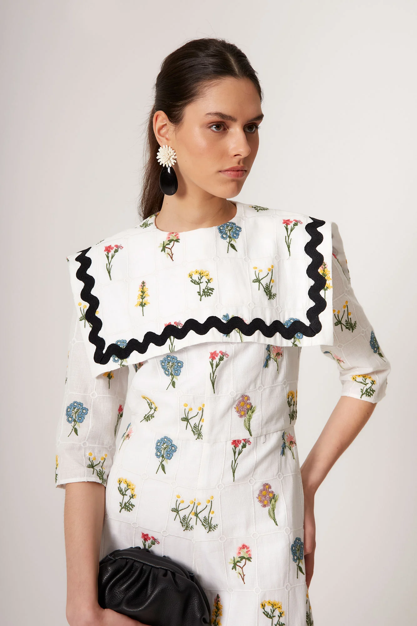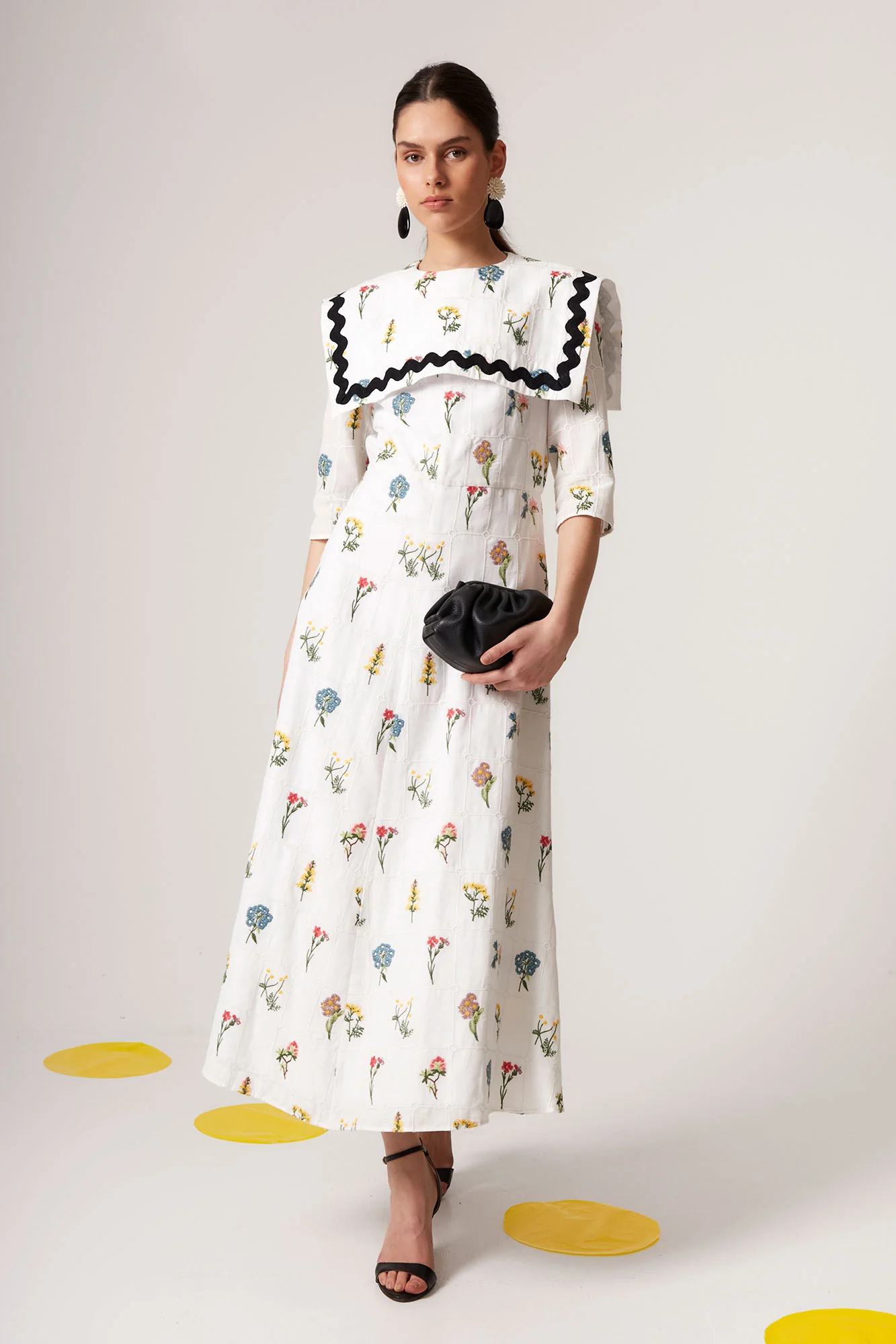 Confeccionado en tejido ligero con estampado floral multicolor sobre fondo blanco, este vestido midi largo de mujer destaca por su gran cuello bobo estructurado con acabado en contraste negro ondulado, un detalle distintivo que aporta personalidad y un aire retro reinterpretado en clave contemporánea.