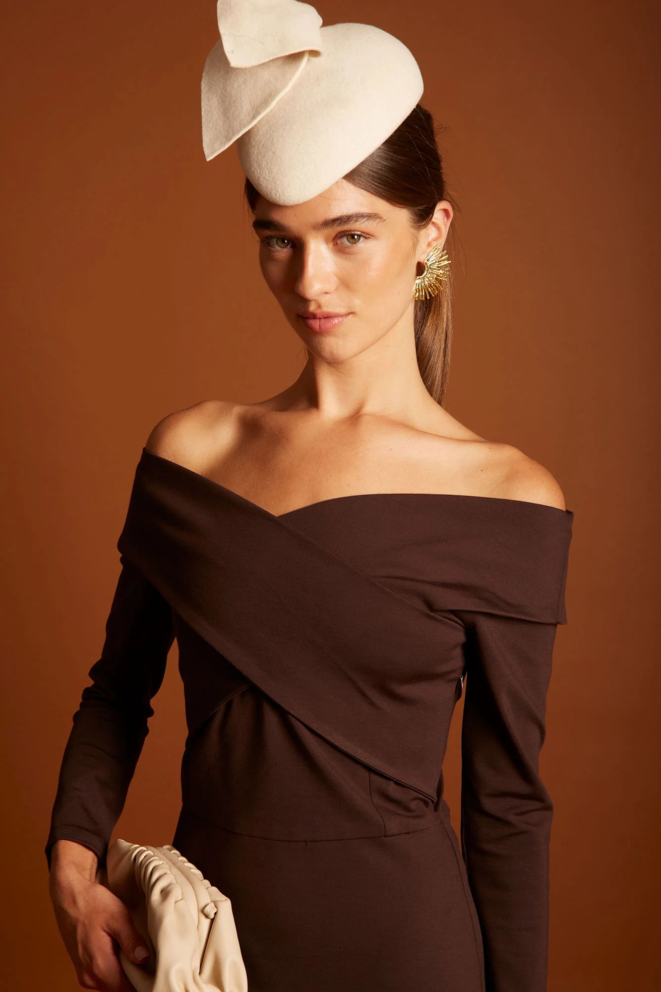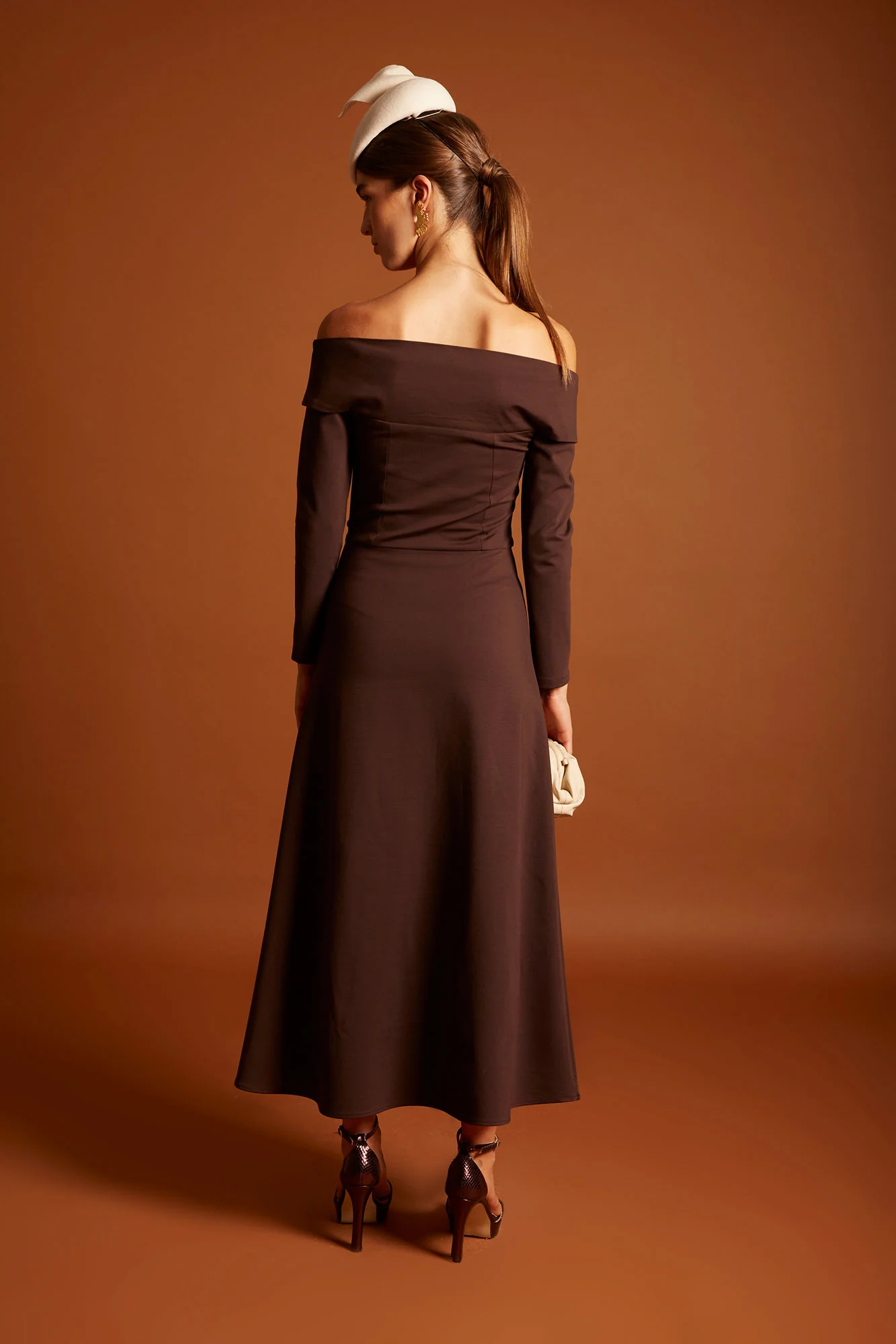 Deslumbra con el Vestido Loria en tono chocolate, ideal para bodas, eventos especiales y ocasiones elegantes. Su diseño midi de líneas limpias en tejido con caída fluida aporta movimiento y sofisticación, mientras el escote bardot cruzado realza los hombros y enmarca el cuello con un aire femenino y atemporal. La manga larga estiliza, el cuerpo entallado define la silueta y la falda evasé acompaña cada paso con naturalidad. Una opción cómoda y muy favorecedora para invitadas que buscan equilibrio entre estilo y confort.
