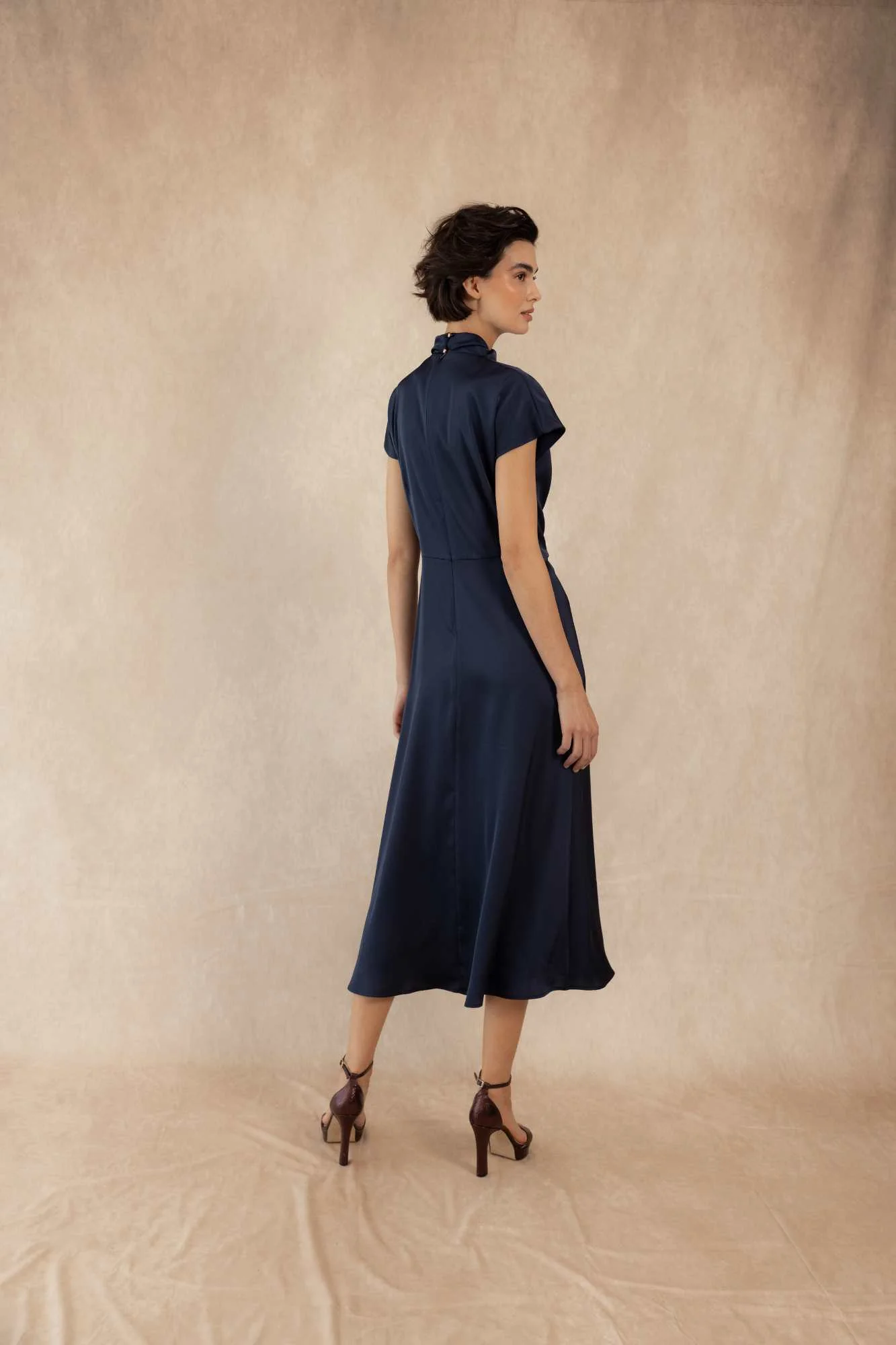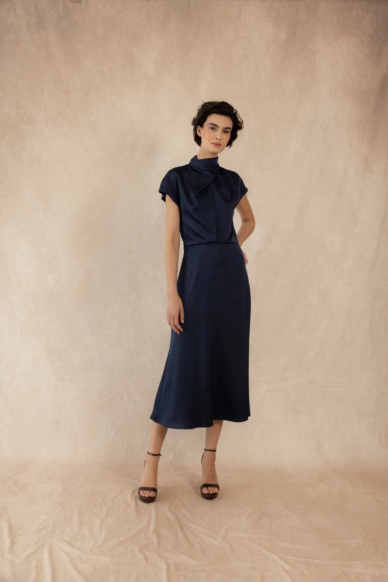 El Vestido Minerve Marino es una prenda elegante y atemporal diseñada para realzar la silueta femenina con sofisticación y sencillez. Confeccionado en un tejido fluido de alta calidad, destaca por su caída impecable y su tono azul marino profundo, un color versátil y favorecedor para cualquier ocasión.