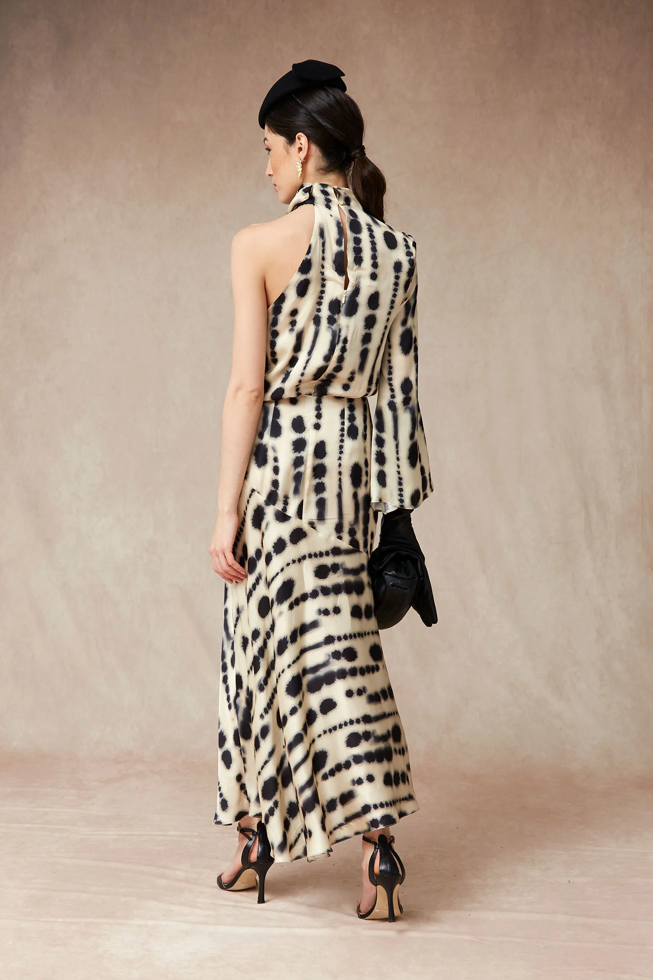 Su diseño halter con cuello drapeado estiliza la silueta y aporta sofisticación, mientras que la falda midi de corte evasé crea movimiento y ligereza en cada paso. Un vestido versátil y atemporal, pensado para bodas de invierno, celebraciones especiales y eventos de día o de tarde.
