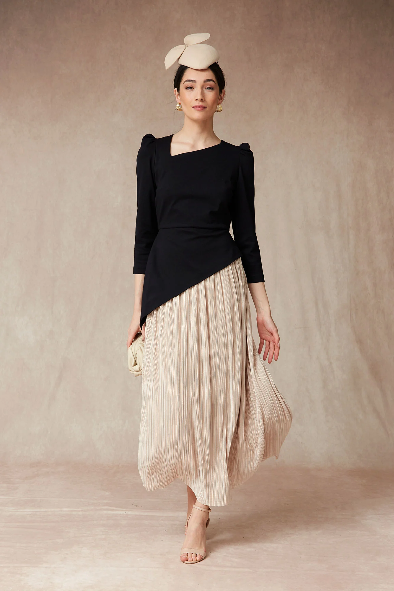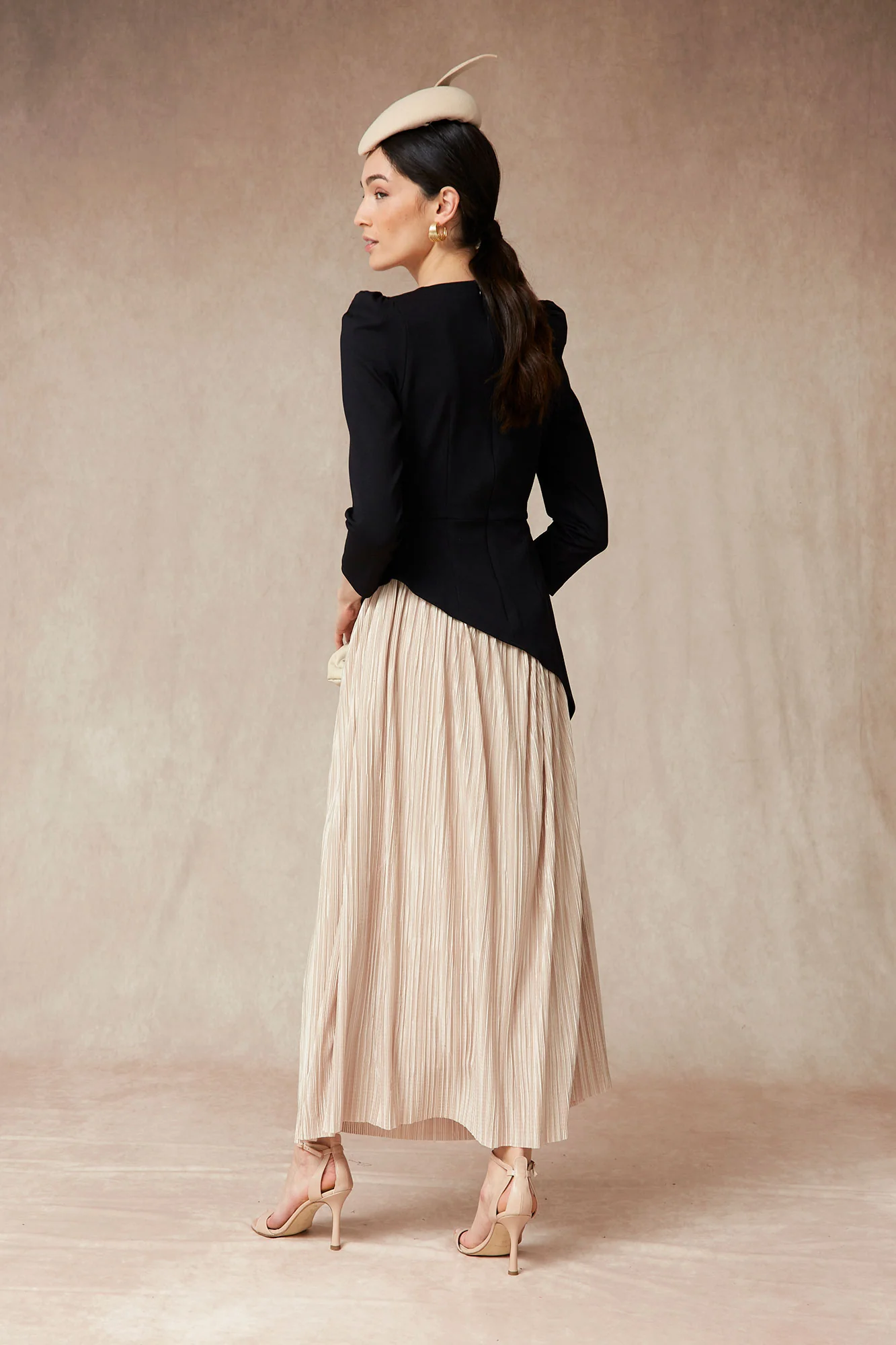 Este vestido midi de invitada combina sofisticación y diseño atemporal en una silueta que estiliza la figura. Confeccionado en un elegante cuerpo negro de manga larga y escote asimétrico, destaca por su original corte diagonal que da paso a una falda plisada satinada en tono champán, aportando movimiento y luz al look.