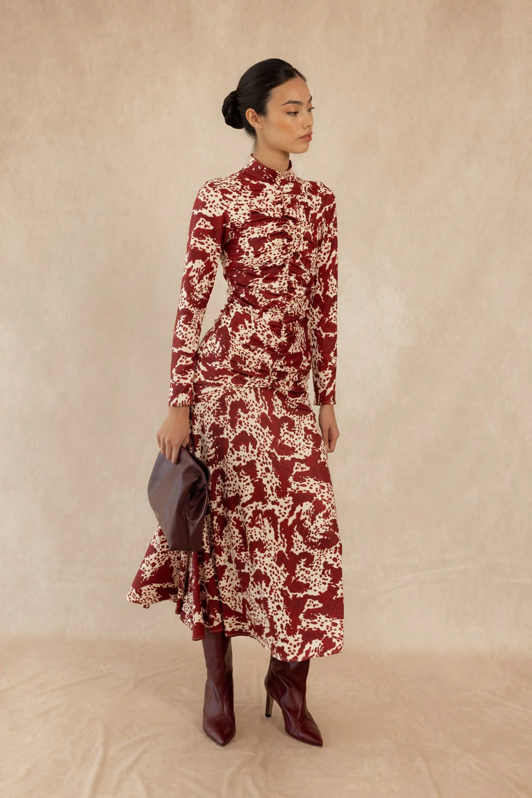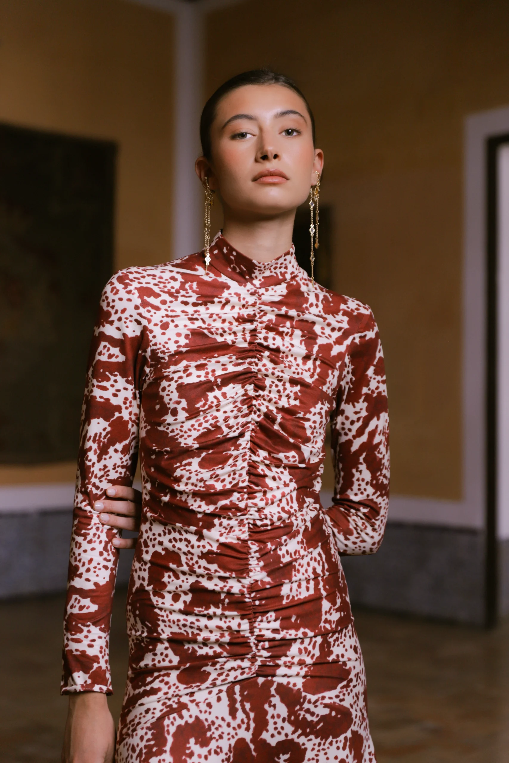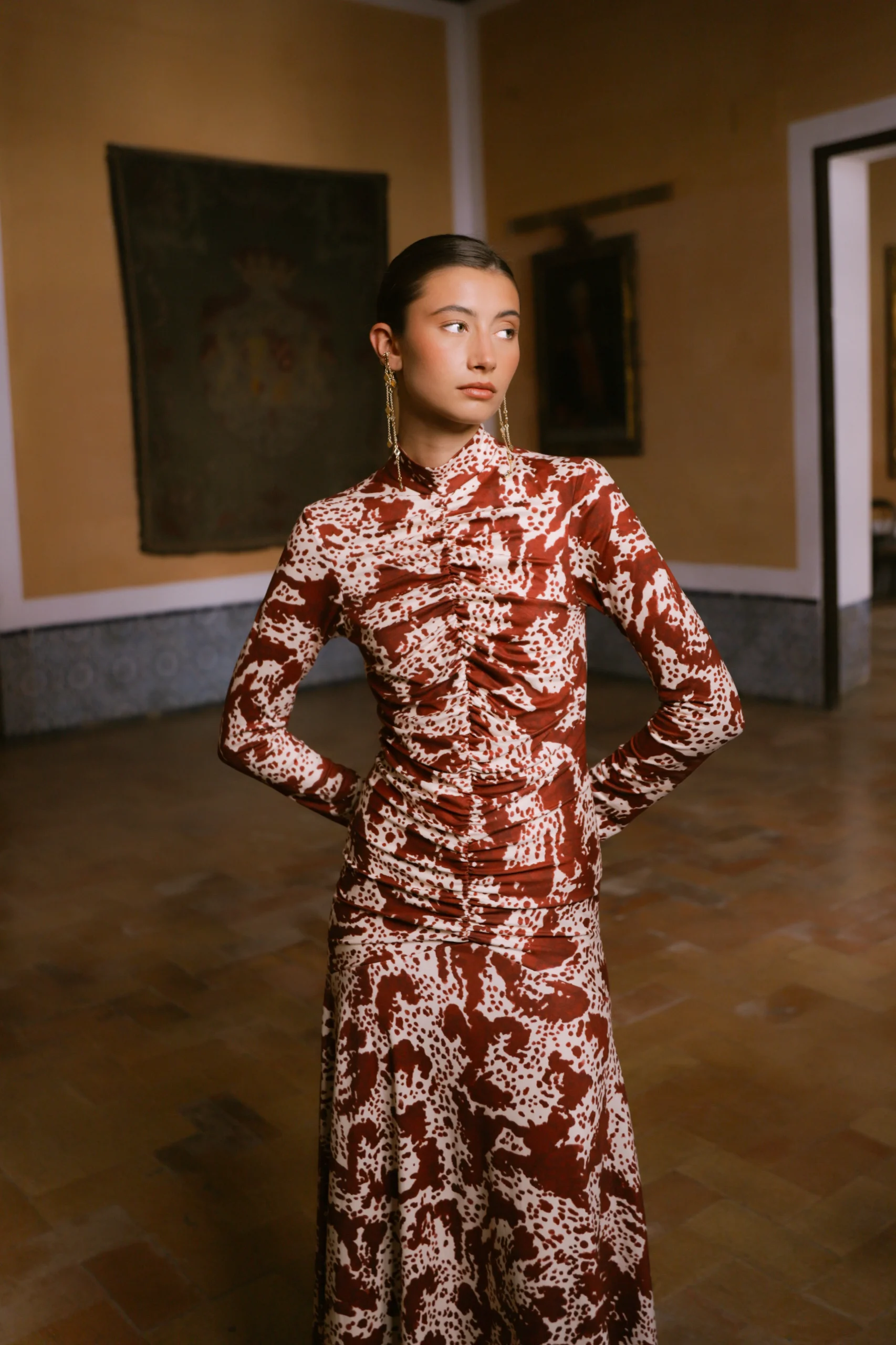El vestido Sora de Coosy es una declaración de estilo que une sofisticación, feminidad y carácter. Confeccionado en un tejido fluido con un exquisito estampado en contraste marfil, esta pieza destaca por su cuello subido, corte entallado y falda con vuelo sutil, que aportan movimiento y armonía a la silueta.
