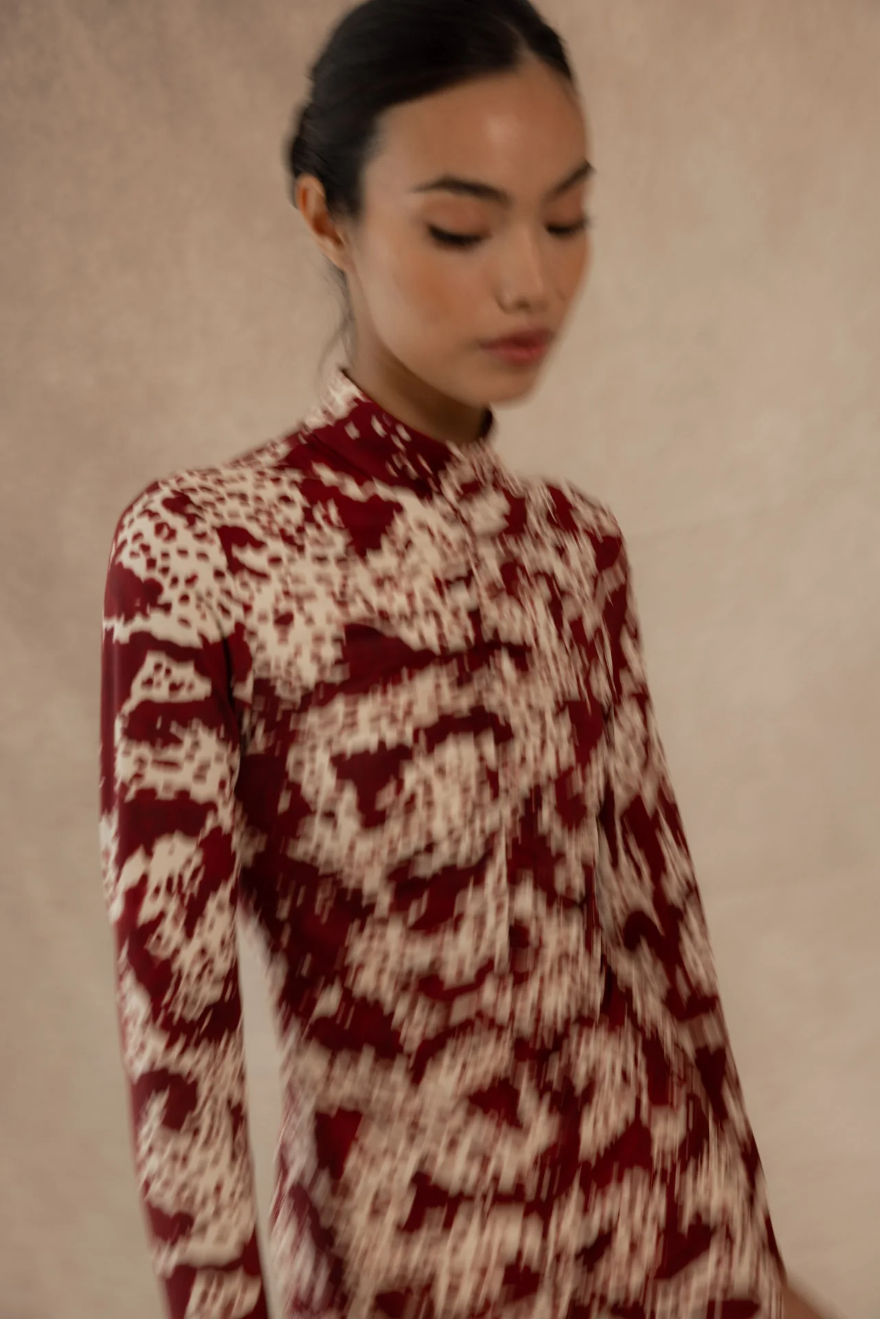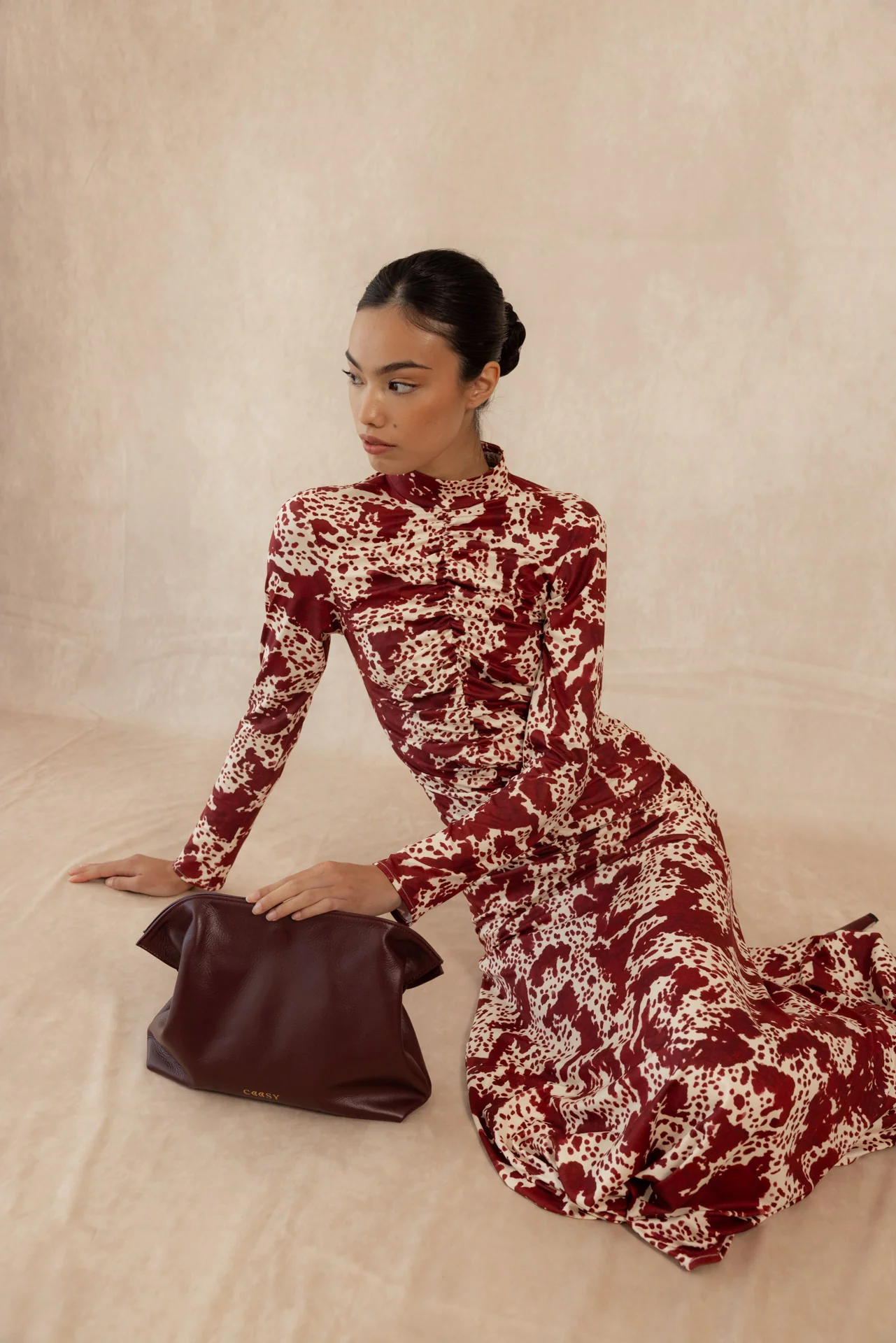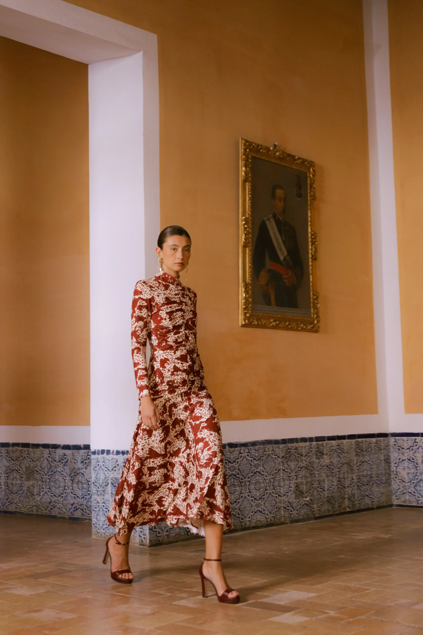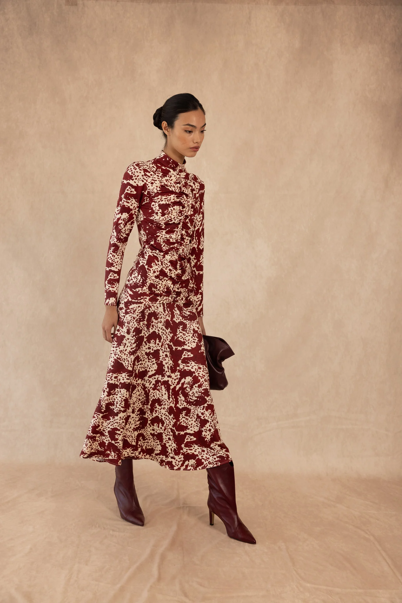 El vestido Sora de Coosy es una declaración de estilo que une sofisticación, feminidad y carácter. Confeccionado en un tejido fluido con un exquisito estampado en contraste marfil, esta pieza destaca por su cuello subido, corte entallado y falda con vuelo sutil, que aportan movimiento y armonía a la silueta.