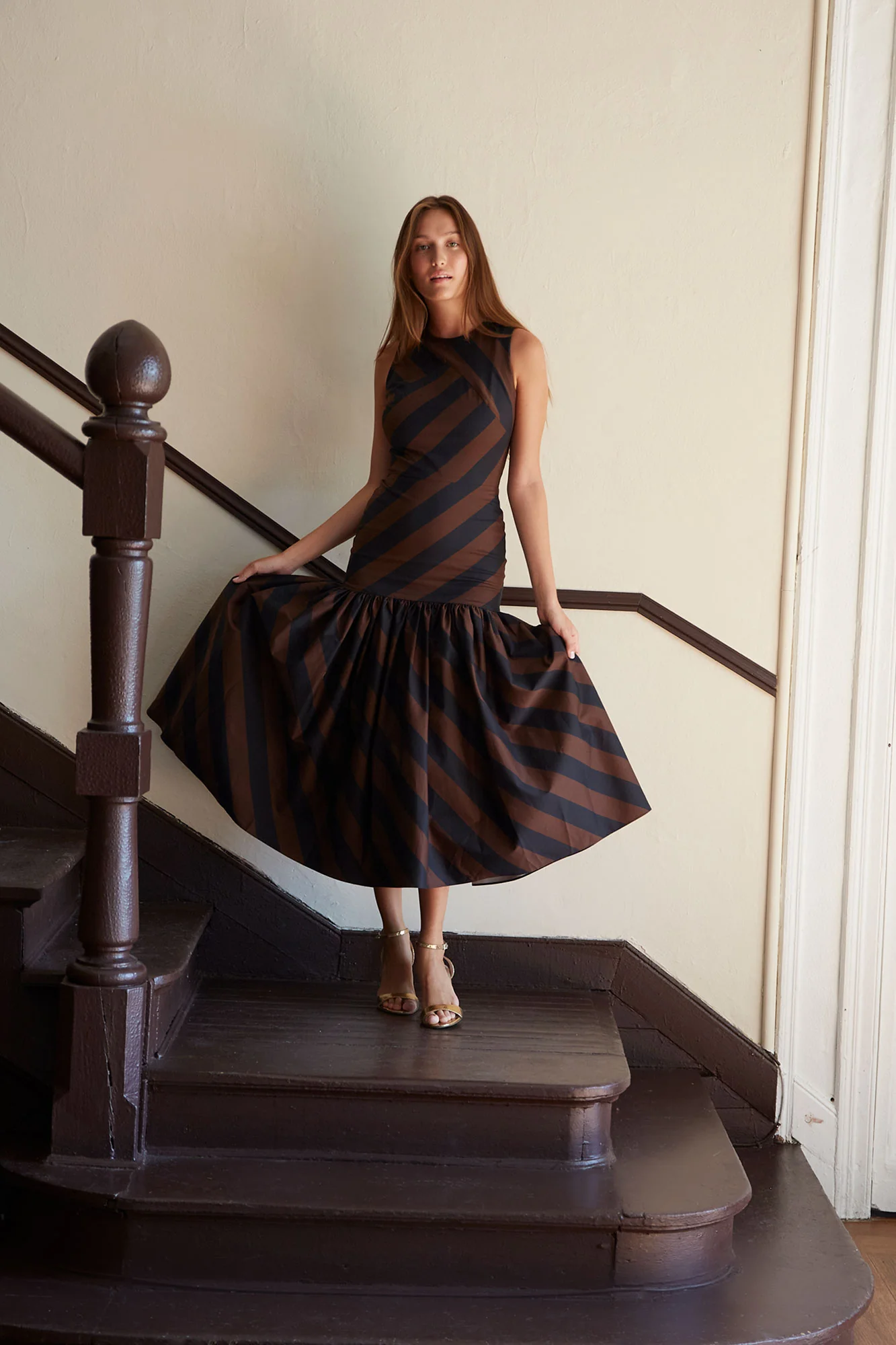 El vestido midi de rayas diagonales es la definición de elegancia contemporánea. Confeccionado en un tejido estructurado que aporta cuerpo y movimiento, este diseño combina la atemporalidad de los tonos chocolate y negro con un patrón de rayas que estiliza la silueta.