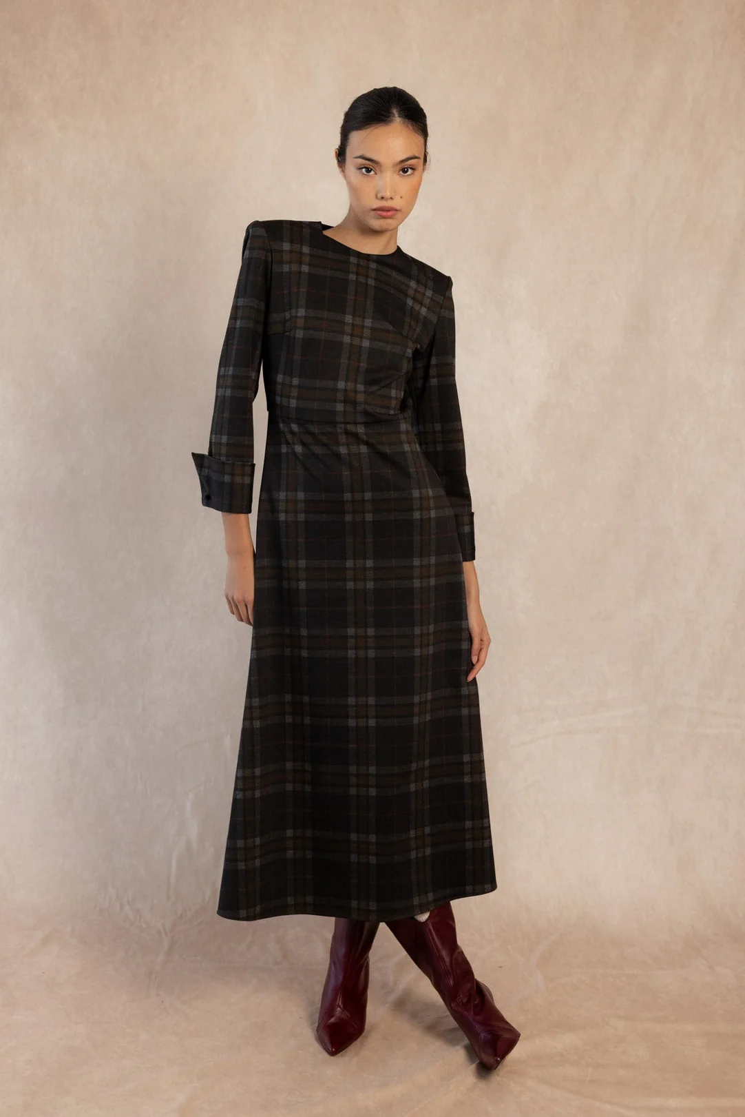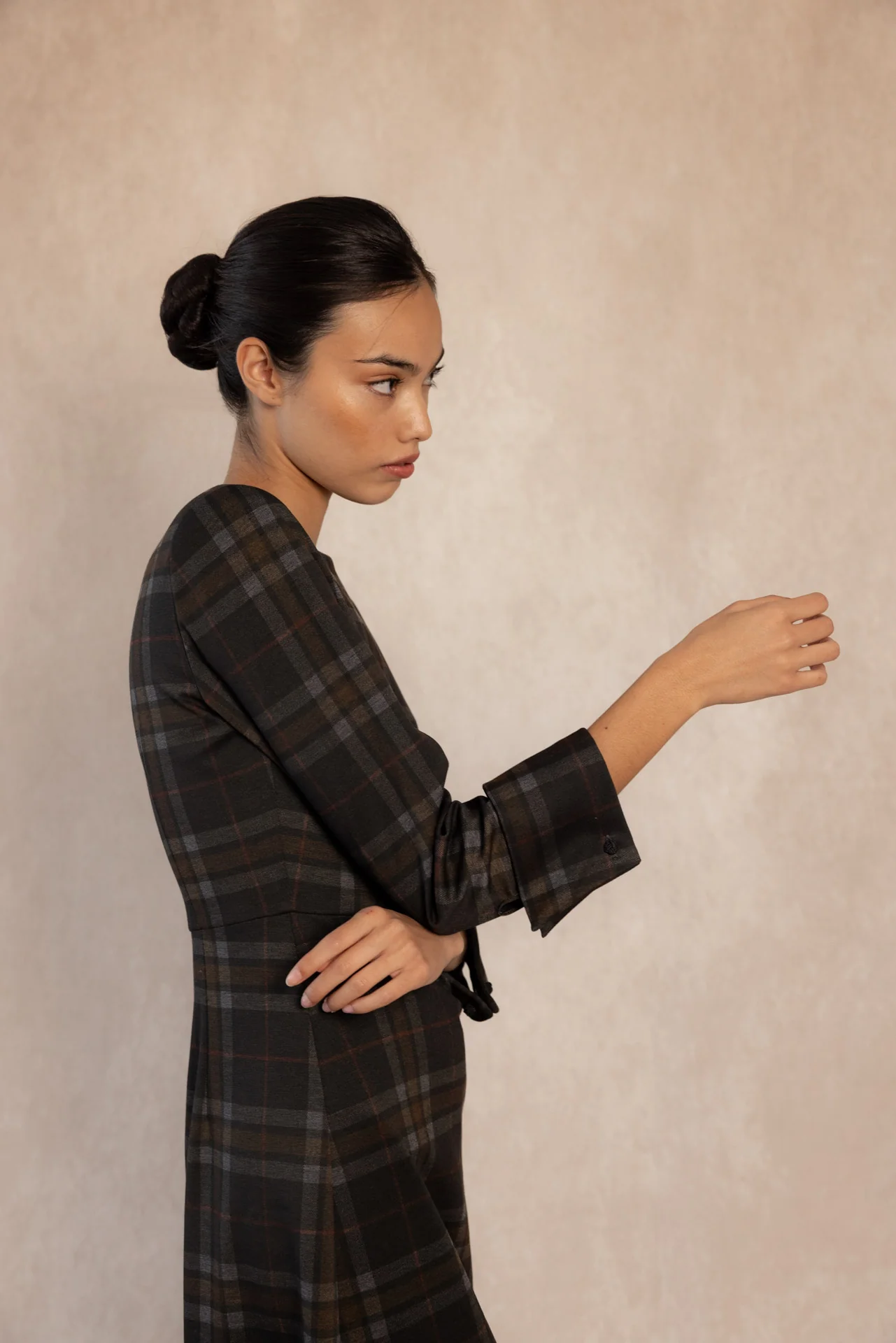 Confeccionado en un tejido cálido de alta calidad, su estampado de cuadros finos aporta un aire clásico y refinado, mientras que el detalle fruncido lateral realza la silueta femenina con sutileza.