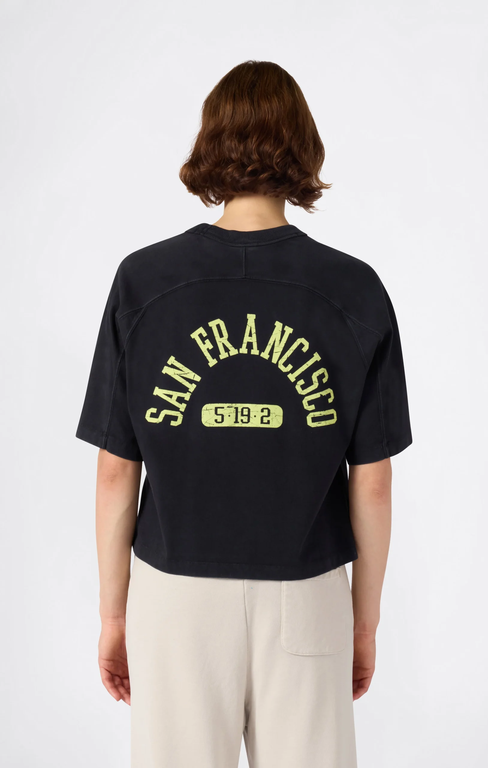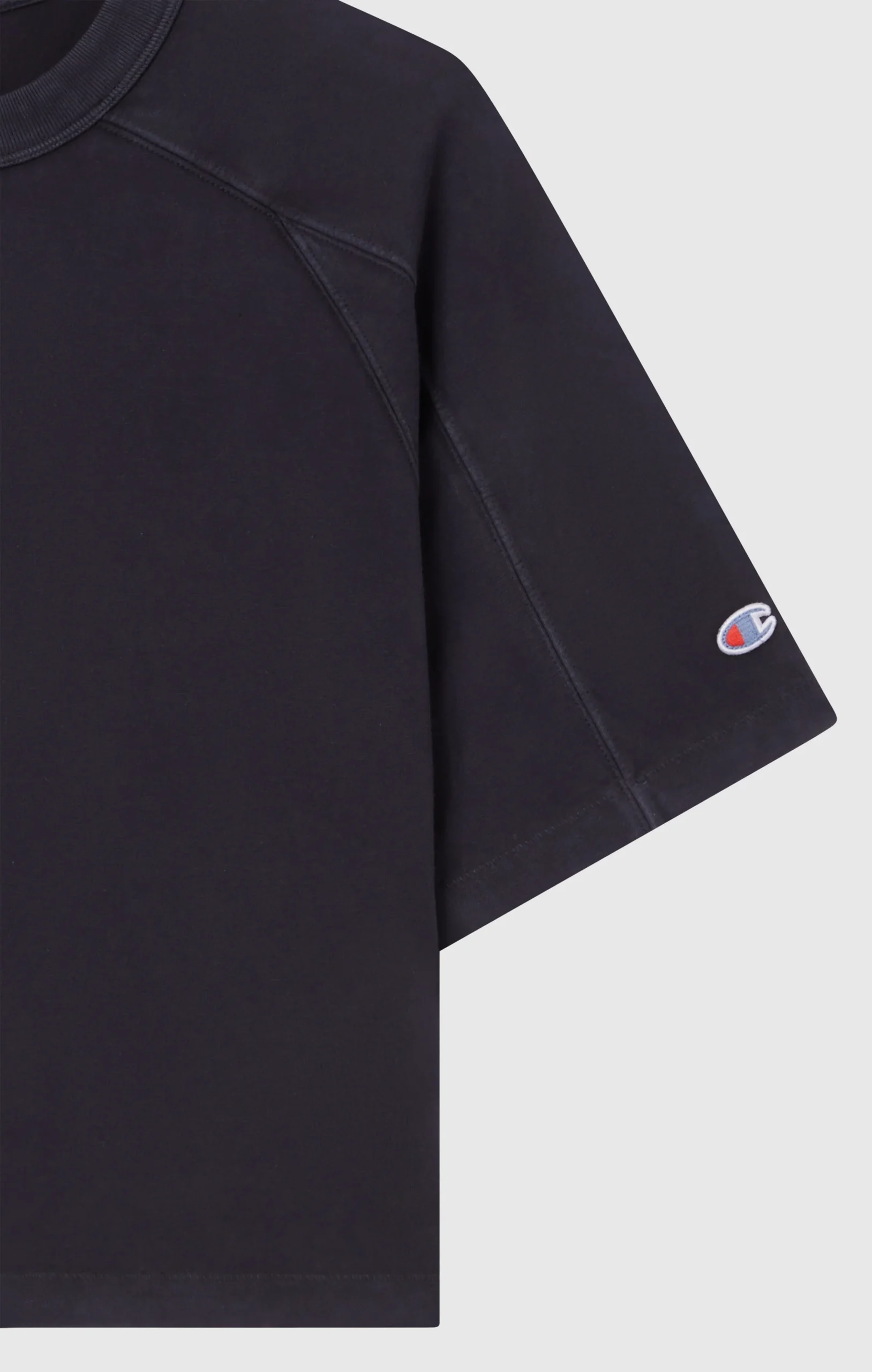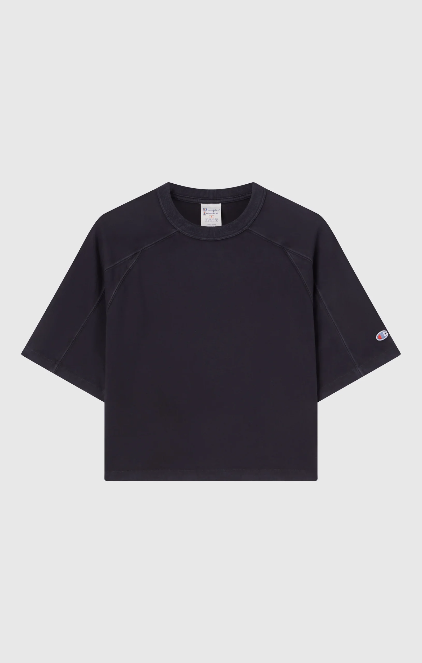 An authentic tribute to American style, this cropped t-shirt from the Time Capsule line reinterprets Champion’s archival graphics with a contemporary flair. The shortened fit and raglan sleeves add a modern touch to the classic crewneck, while the print on the back celebrates the collection’s heritage spirit.@@@Fabric: Compact combed cotton jersey 220 g/m² |Composition: 100% Cotton |Flock graphic on the back |Raglan shoulders |Straight hem and cropped cut |Fit: Standard Fit – versatile and comfortable with standard widths and lengths. Close to the body with simple lines that don’t cling. Regular shoulder cut.