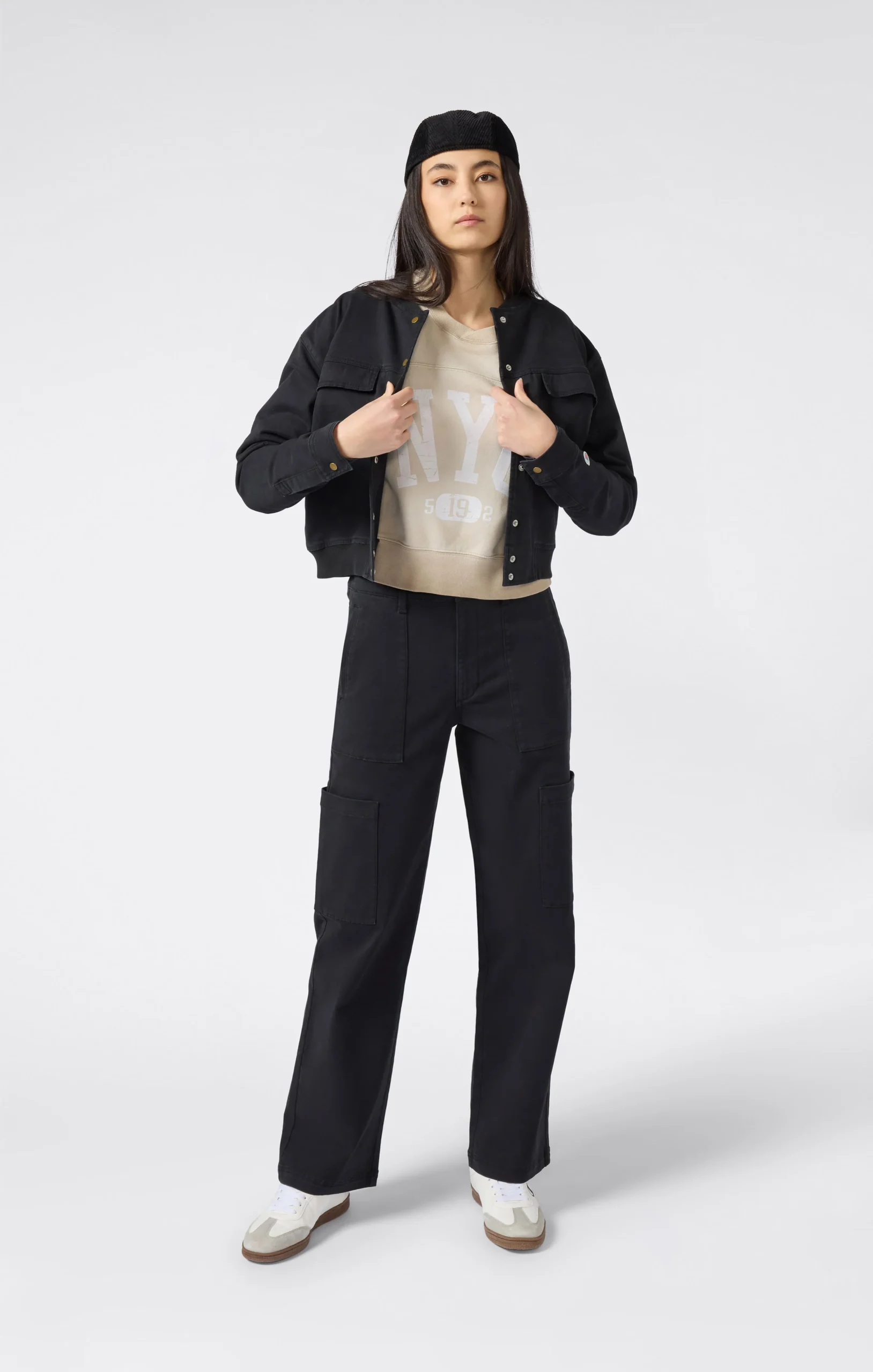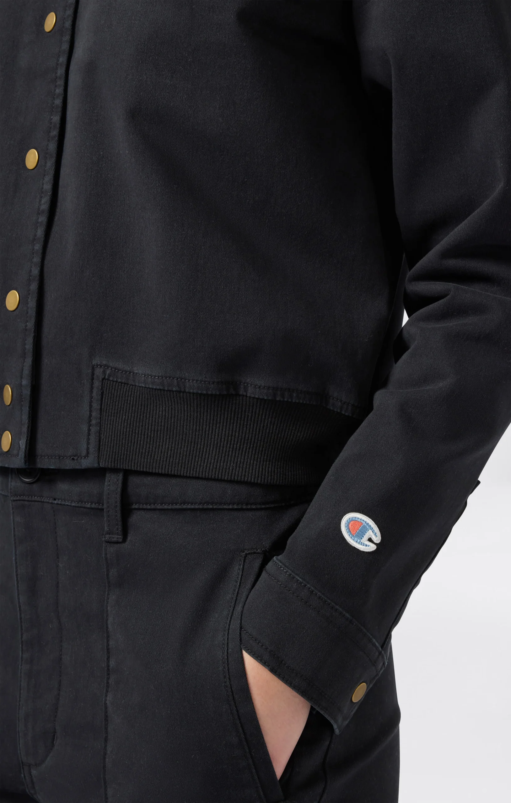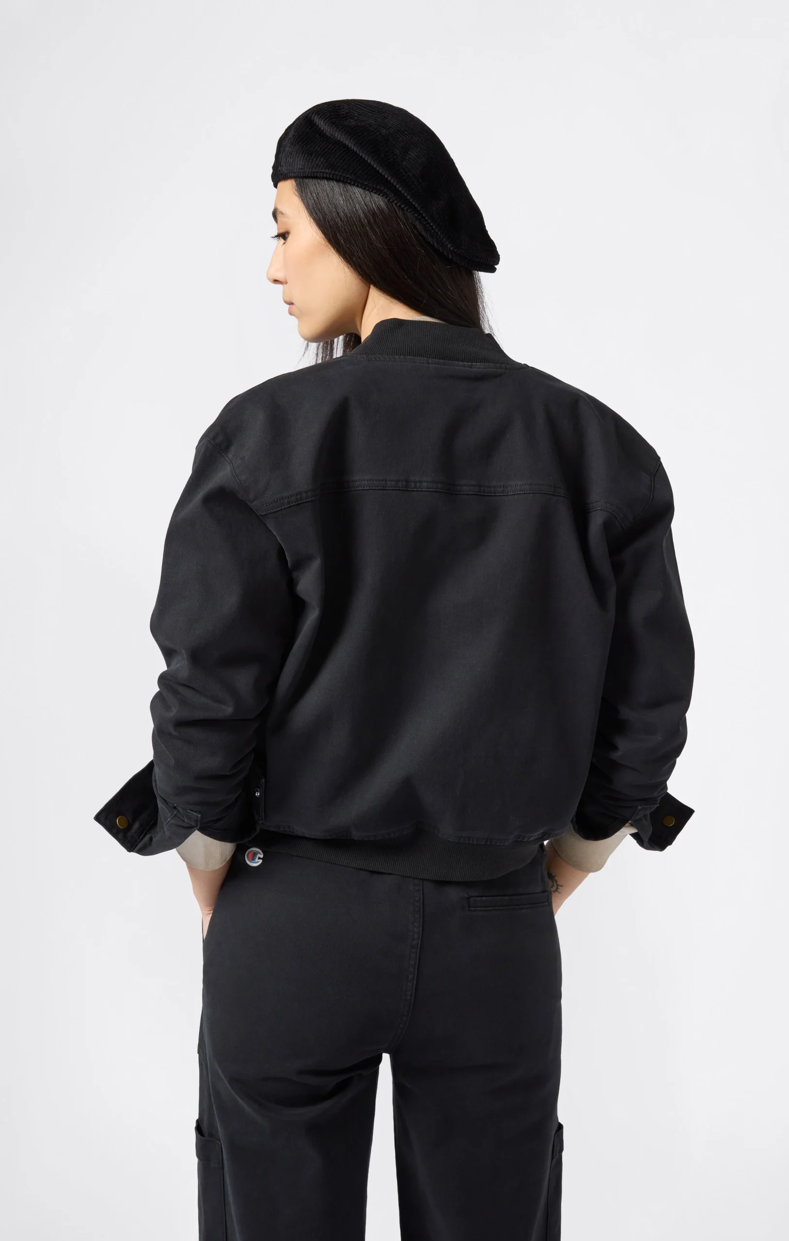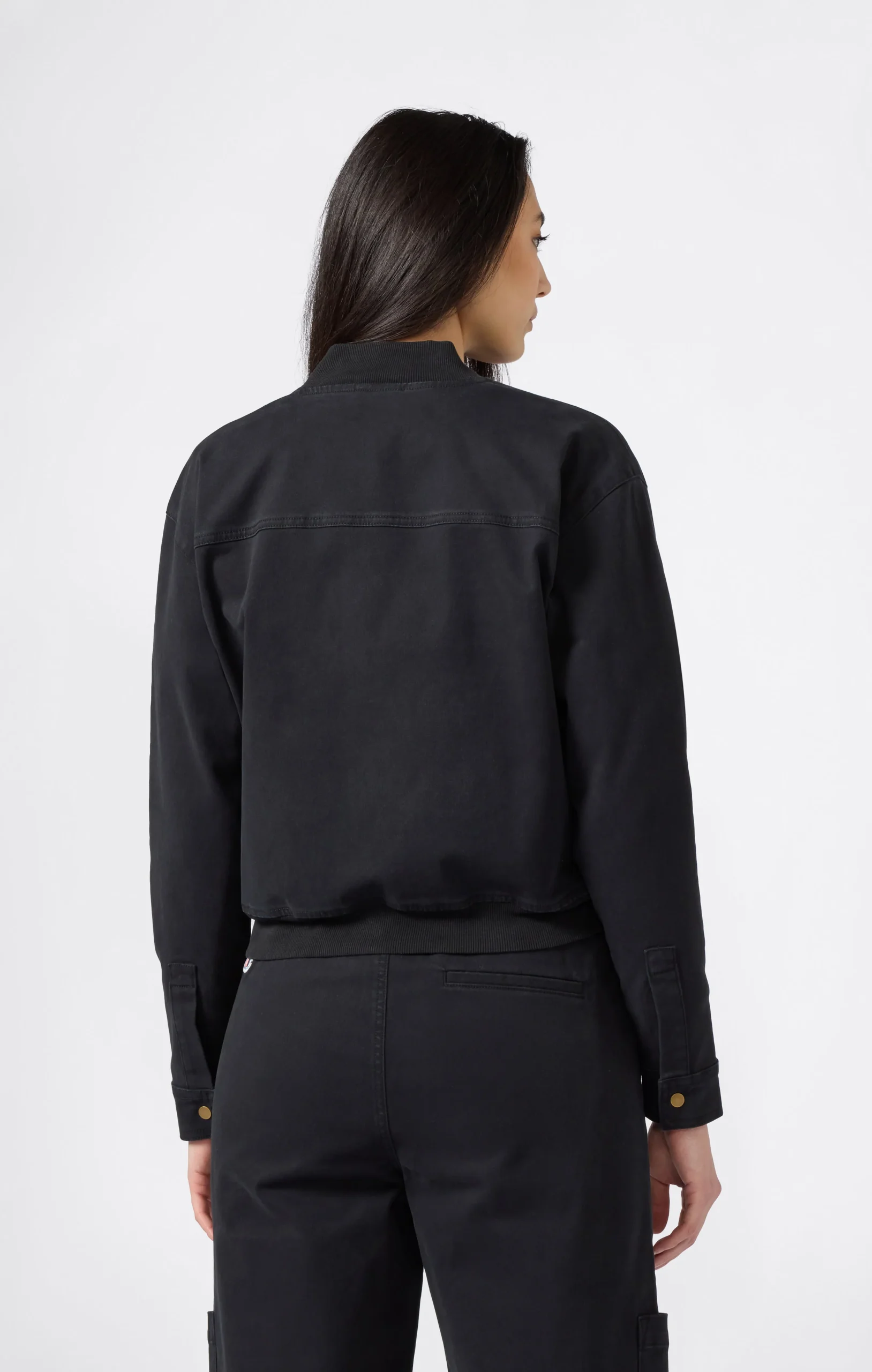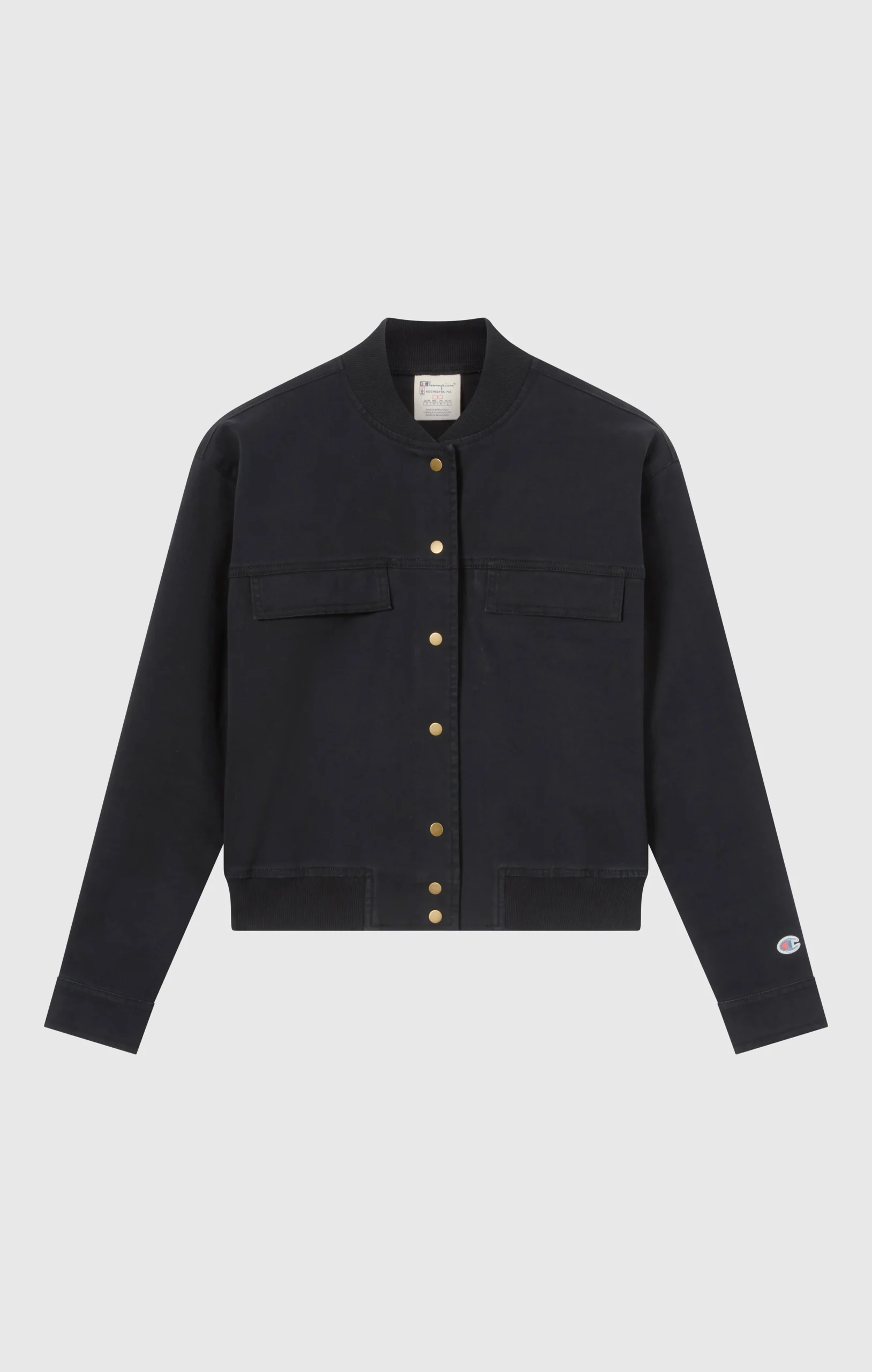 This heavy stretch twill utility jacket is part of the Time Capsule collection, which reinterprets heritage style with a contemporary twist. The short, boxy cut, gold snap buttons, and flap pockets on the chest recall American work uniforms, updated with a feminine and versatile silhouette. The slightly stretch cotton twill provides structure and comfort, perfect for facing the city with style.@@@Fabric: Heavy stretch cotton twill with soft-touch surface – 335 g/m² |Composition: 98% Cotton, 2% Elastane |Gold snap buttons |Front flap pockets |Ribbed bomber-style collar |Embroidered C logo on the sleeve |Fit: Standard Fit – versatile and comfortable fit with standard width and length. Skims the body with simple lines and a regular shoulder cut.