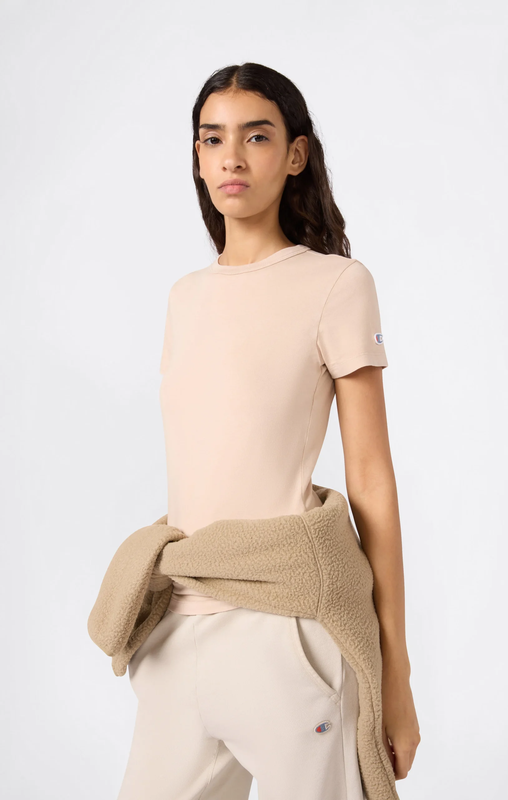 Essential and versatile, this fine stretch jersey t-shirt from the Icons line is designed for those seeking a slim fit and defined silhouette. The lightweight and stretchy fabric offers comfort and freedom of movement, while the embroidered C logo on the sleeve adds an iconic and discreet detail. Perfect worn alone or under a sweatshirt, it’s a must-have with a clean and feminine character.@@@Fabric: Lightweight stretch jersey 165 g/m² |Composition: 95% Cotton, 5% Elastane |Embroidered C logo on the sleeve |Ribbed collar |Fit: Fitted – Slim and body-hugging fit.
