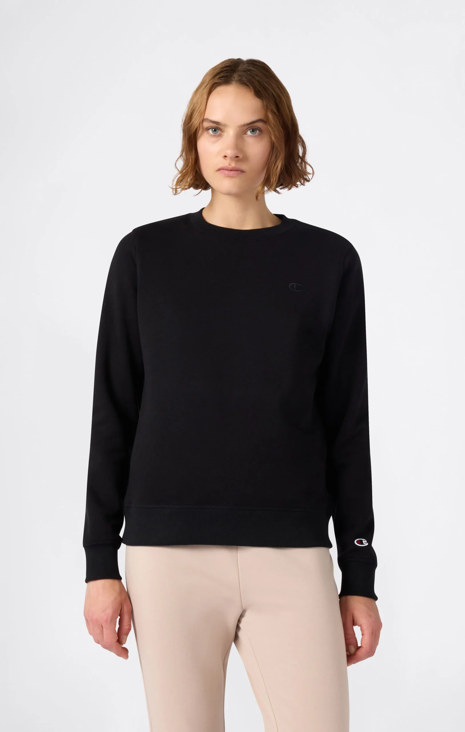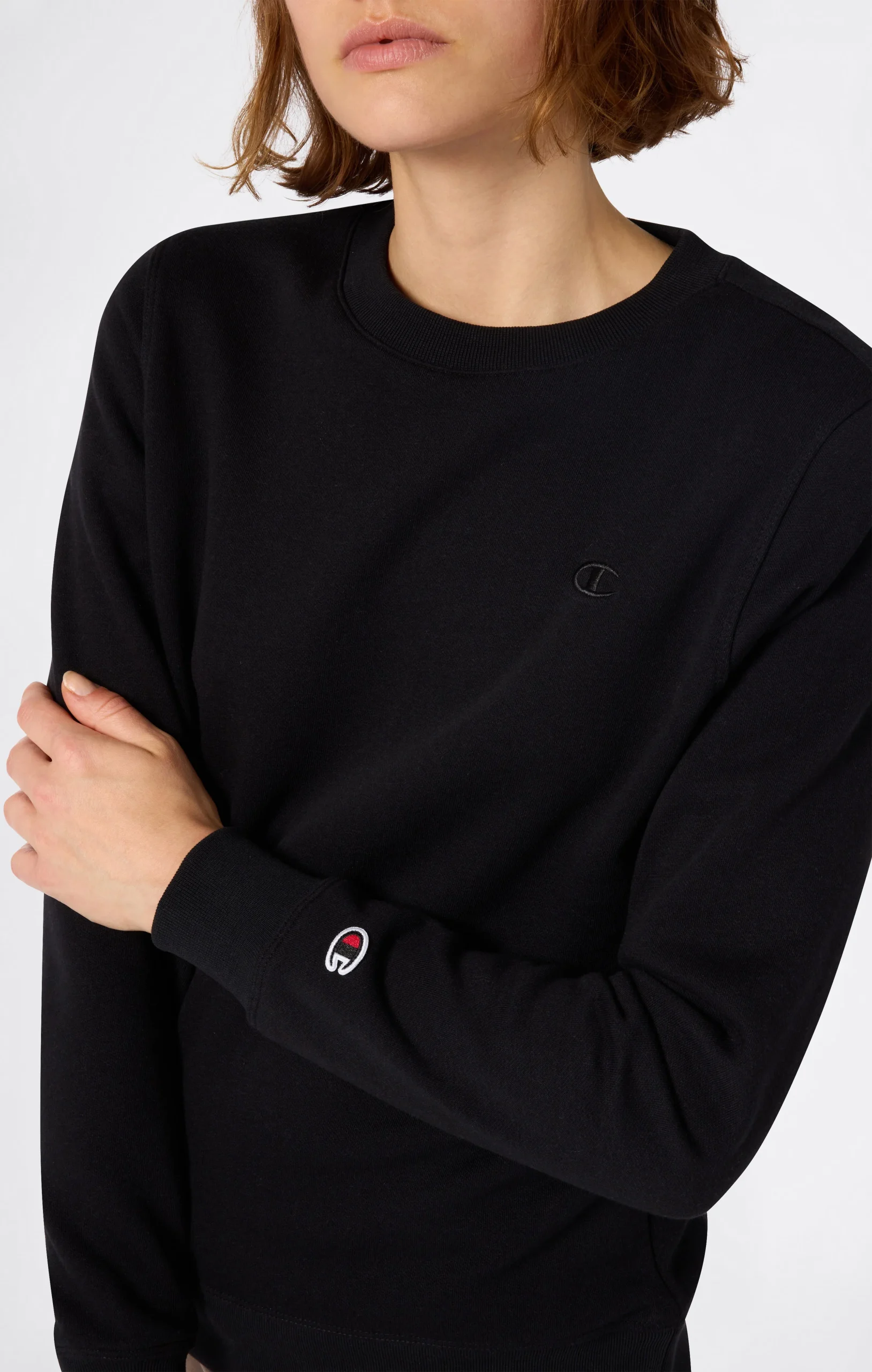 This clean-design crewneck sweatshirt from the Icons line stands out for its tone-on-tone embroidered logo and slim fit that enhances the silhouette. The compact fleece fabric with a brushed interior ensures warmth and softness, perfect for everyday comfort. A timeless piece, to wear alone or layered, with all the authentic Champion spirit.@@@Fabric: Compact and soft cotton-blend fleece 280 g/m² |Composition: 70% Cotton, 30% Polyester |Brushed interior for extra thermal comfort |Ribbed crewneck |Tone-on-tone embroidered logo on the chest |Embroidered C logo on the sleeve |Ribbed cuffs and hem |Fit: Slim Fit – Close-fitting but not tight. Follows the body’s natural shape.