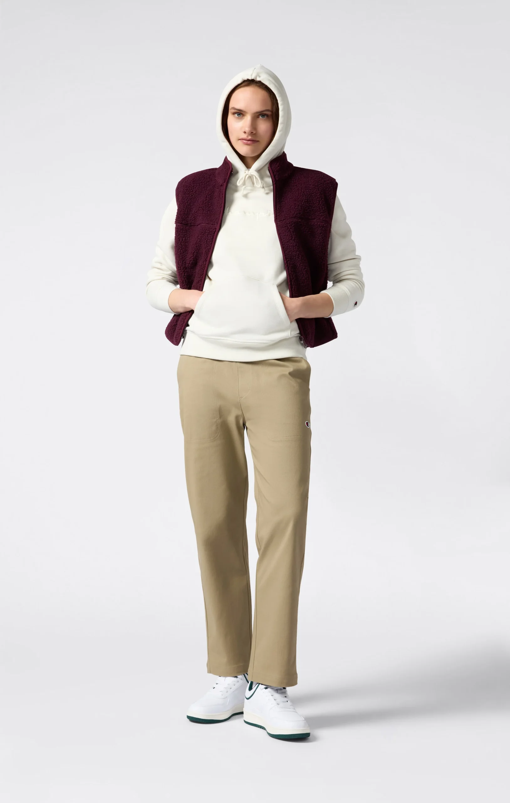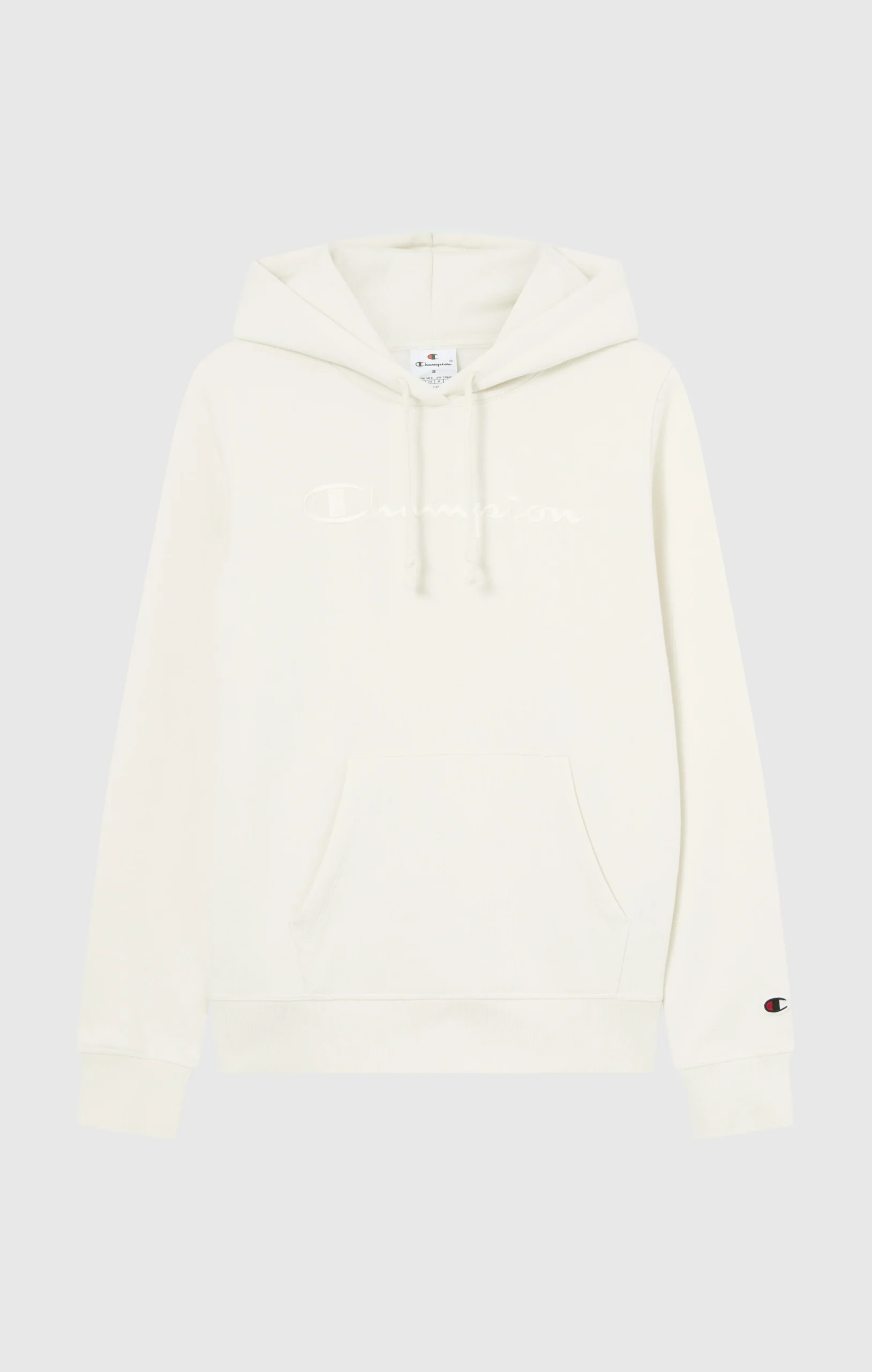This hoodie from the Icons line is a tribute to authentic Champion style, reimagined with a clean and essential approach. The tone-on-tone embroidered script logo on the chest adds a distinctive and refined touch, perfectly integrated into the soft color palette. The compact fleece fabric with a brushed interior ensures comfort and warmth, while the slim fit naturally follows the body’s shape.@@@Fabric: Soft and compact cotton-blend fleece – 280 g/m² |Composition: 70% Cotton, 30% Polyester |Brushed interior for superior thermal comfort |Tone-on-tone embroidered Champion logo on the chest |Kangaroo pocket |Drawstring hood |Ribbed cuffs and hem |Embroidered C logo on the sleeve |Fit: Slim Fit – Close-fitting but not tight. The garment follows the body’s curves naturally.