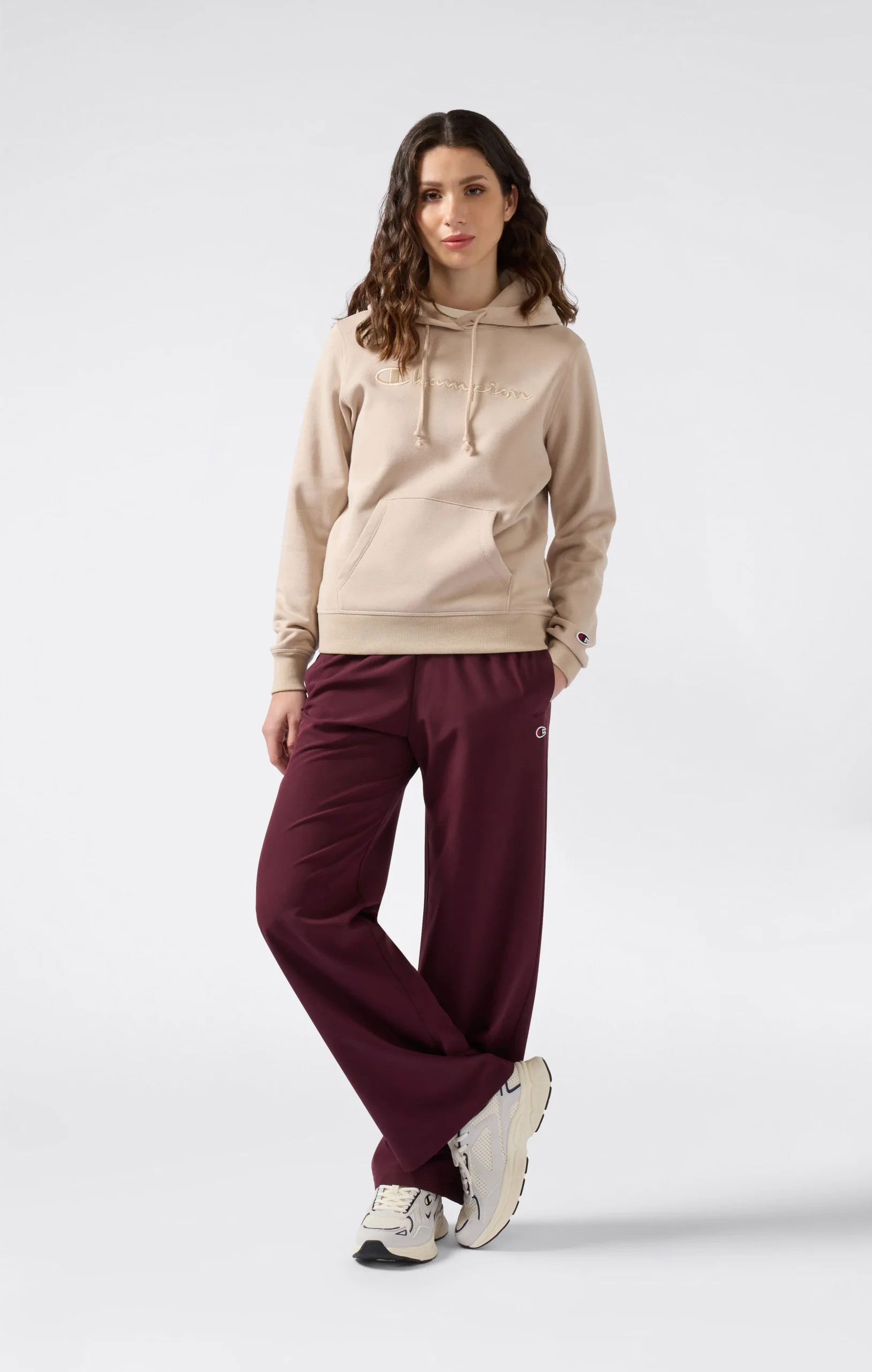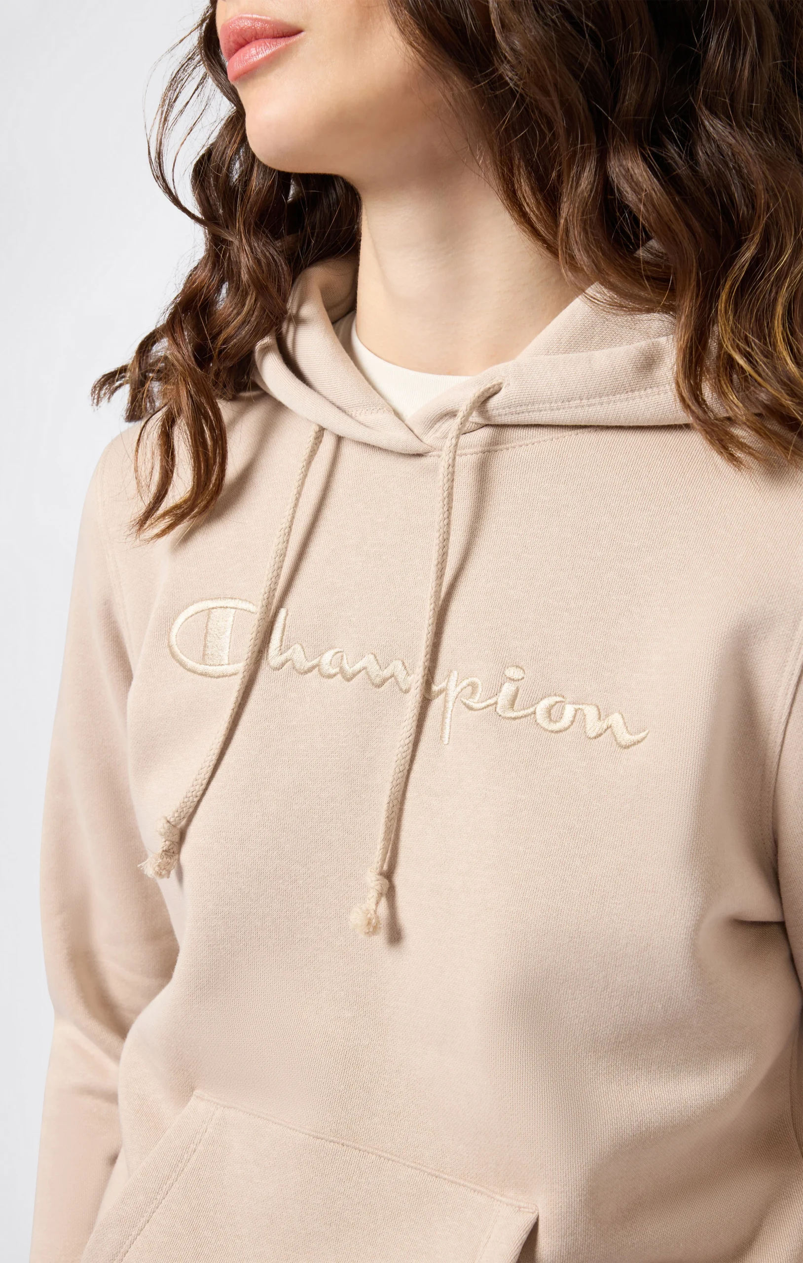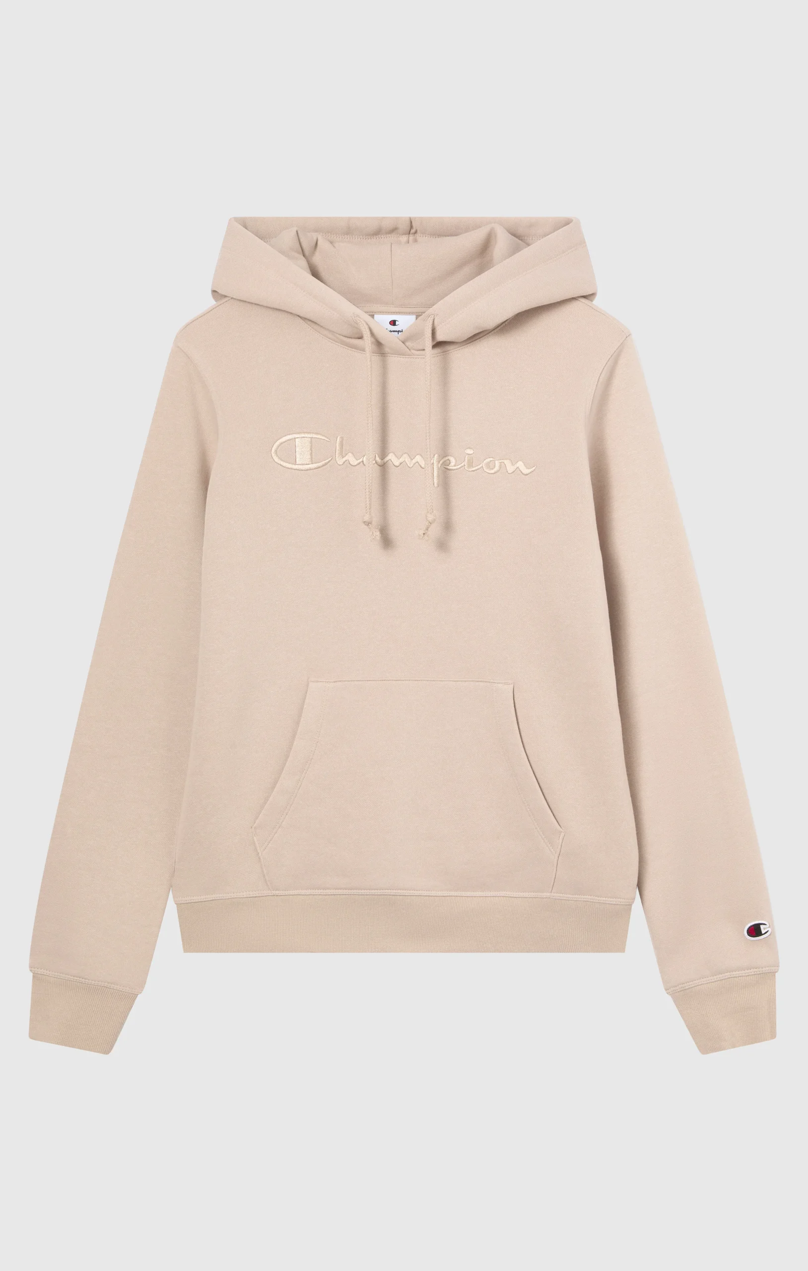 This hoodie from the Icons line is a tribute to authentic Champion style, reimagined with a clean and essential approach. The tone-on-tone embroidered script logo on the chest adds a distinctive and refined touch, perfectly integrated into the soft color palette. The compact fleece fabric with a brushed interior ensures comfort and warmth, while the slim fit naturally follows the body’s shape.@@@Fabric: Soft and compact cotton-blend fleece – 280 g/m² |Composition: 70% Cotton, 30% Polyester |Brushed interior for superior thermal comfort |Tone-on-tone embroidered Champion logo on the chest |Kangaroo pocket |Drawstring hood |Ribbed cuffs and hem |Embroidered C logo on the sleeve |Fit: Slim Fit – Close-fitting but not tight. The garment follows the body’s curves naturally.