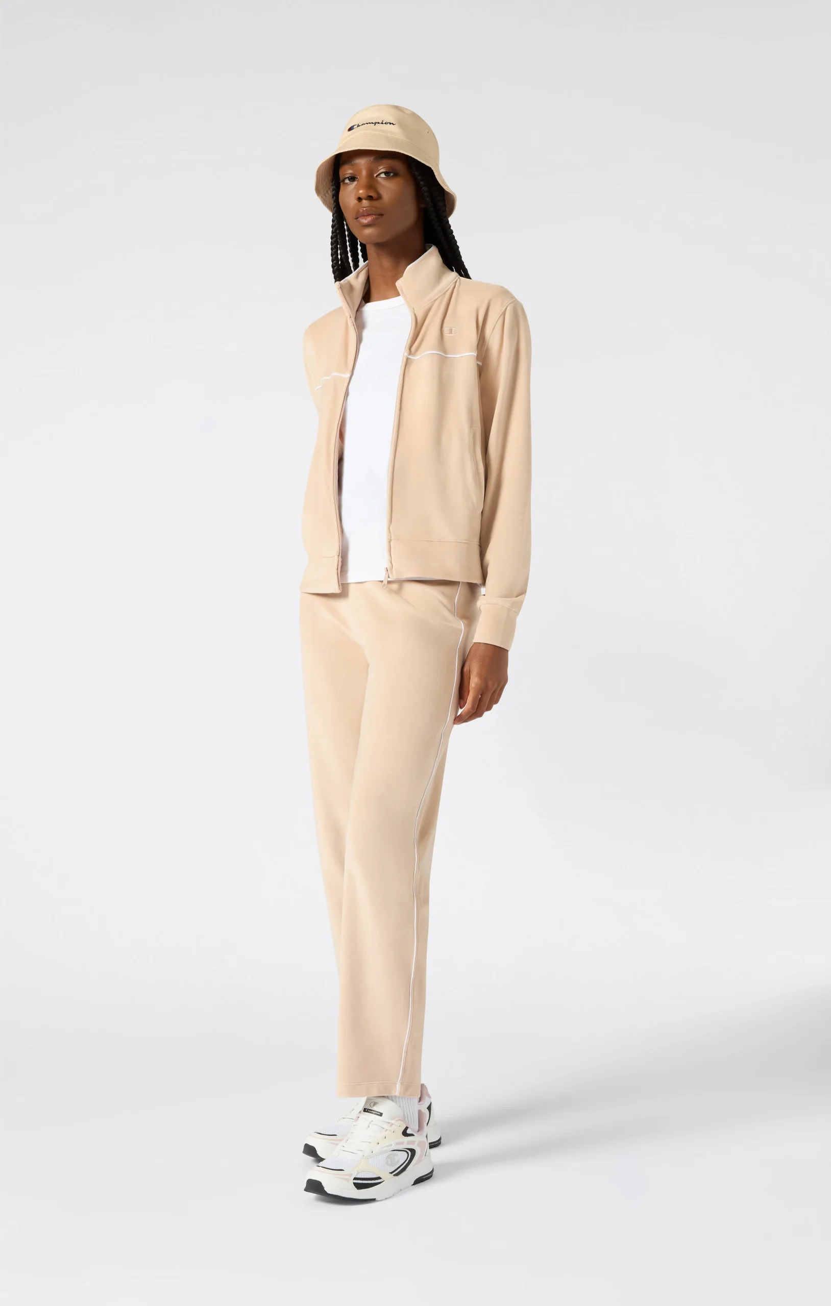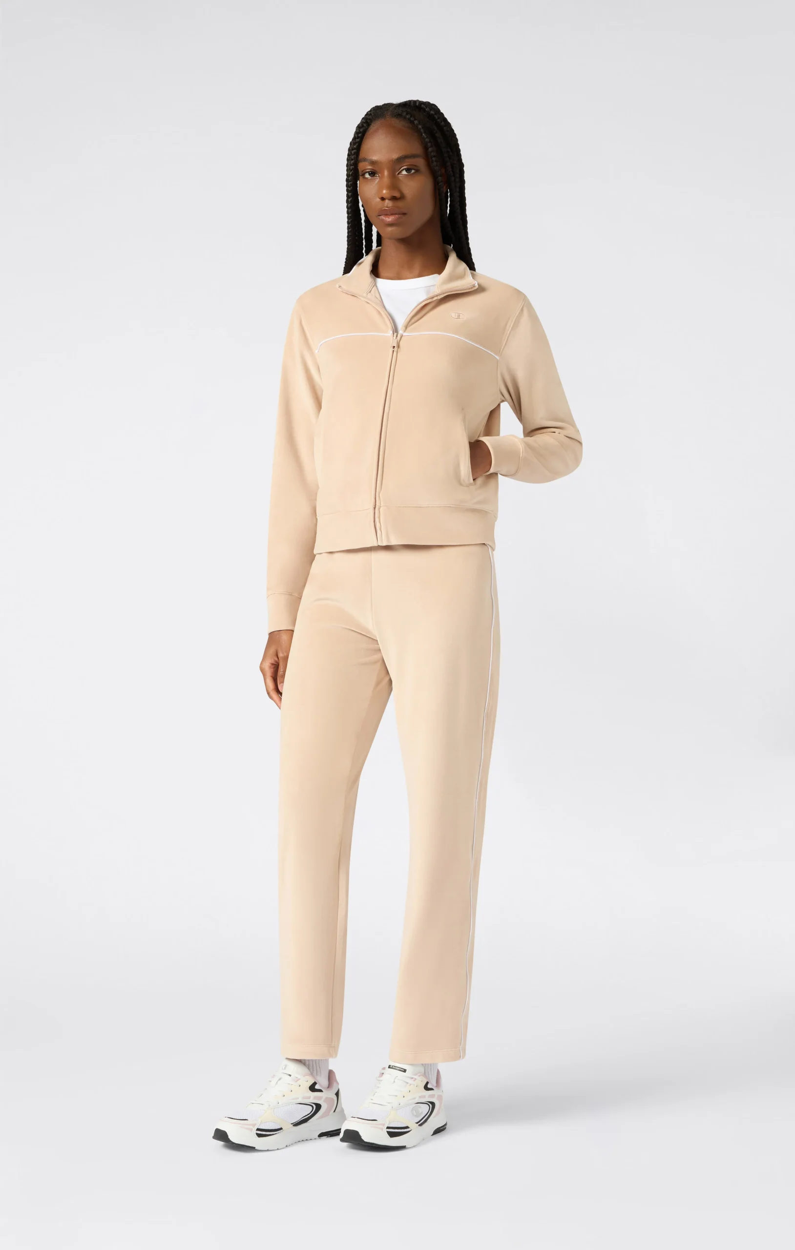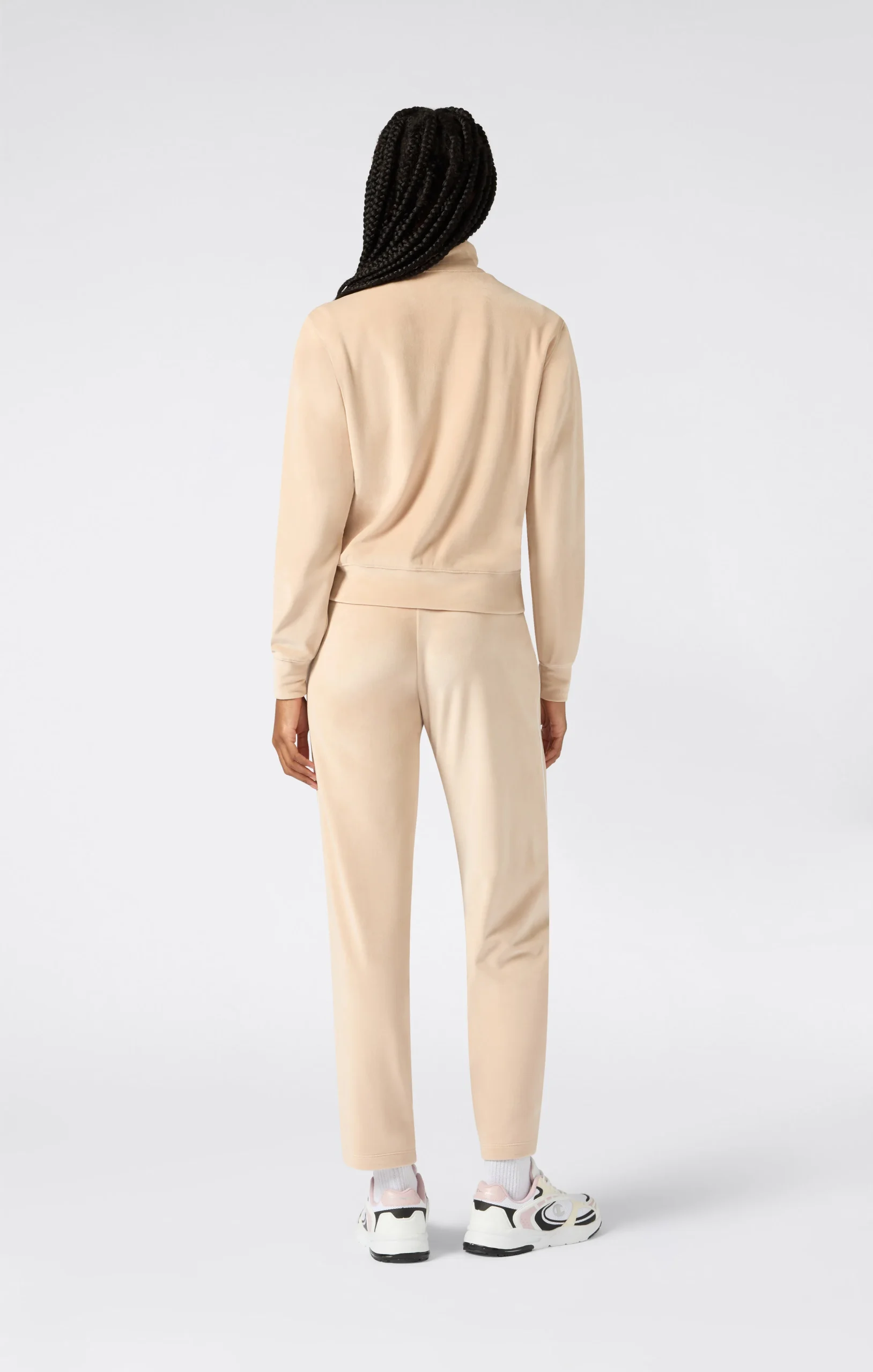 A full-zip set that blends sporty elegance and ultimate softness. Made from lightweight, silky velour, it flatters the figure with a slim fit. The velvet-effect fabric adds a touch of retro-contemporary style, perfect for relaxing or a comfy look.@@@Fabric: Soft Micro Velour, weight: 250 g/m² |Composition: 94% Polyester, 6% Elastane |Soft and smooth velvet-effect fabric |Full-zip sweatshirt with high collar |Slim pants with elastic waistband |Embroidered logo |Fit: Slim Fit: Close-fitting but not tight. The garment follows the silhouette, contouring the body’s shape.