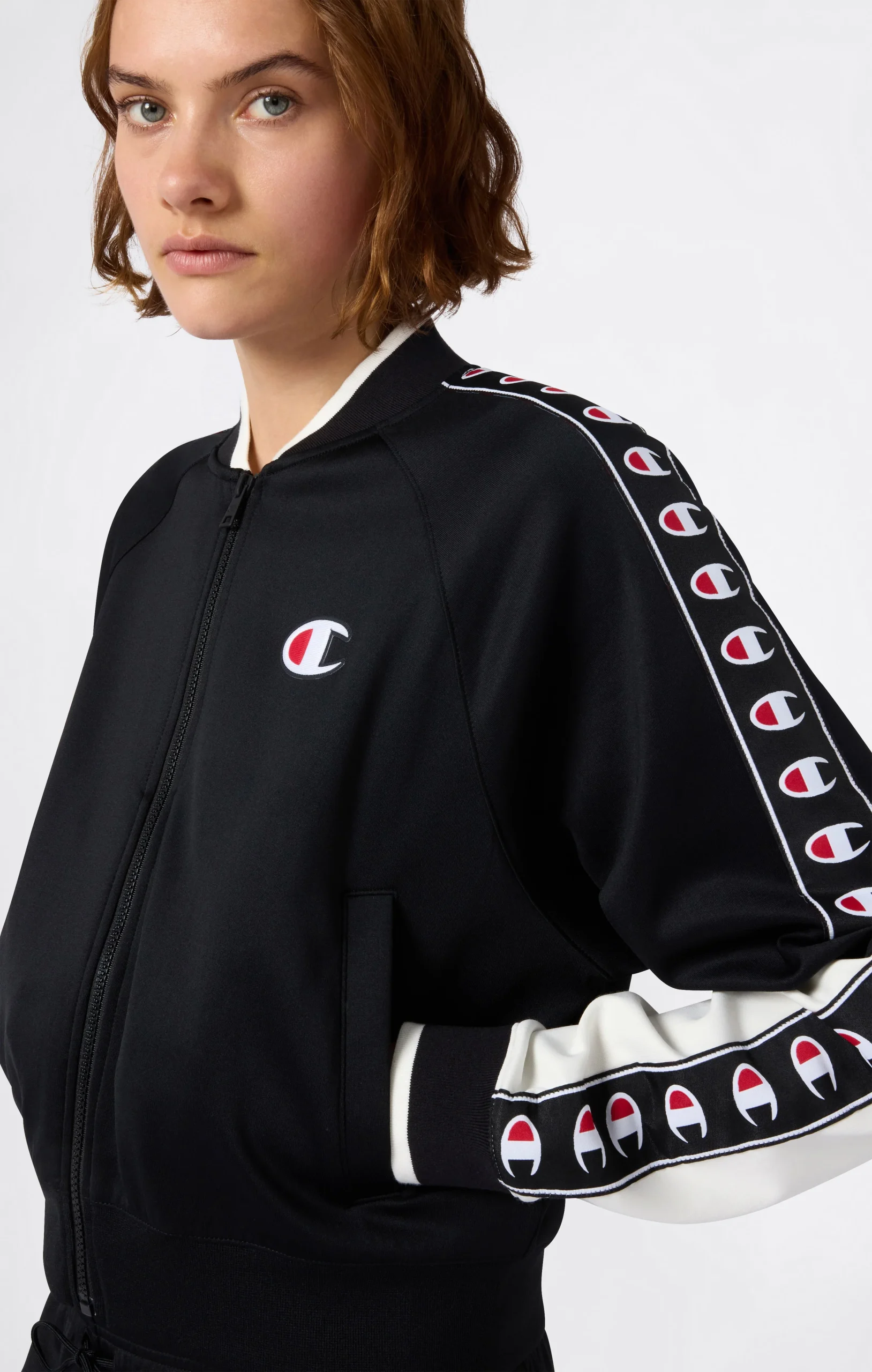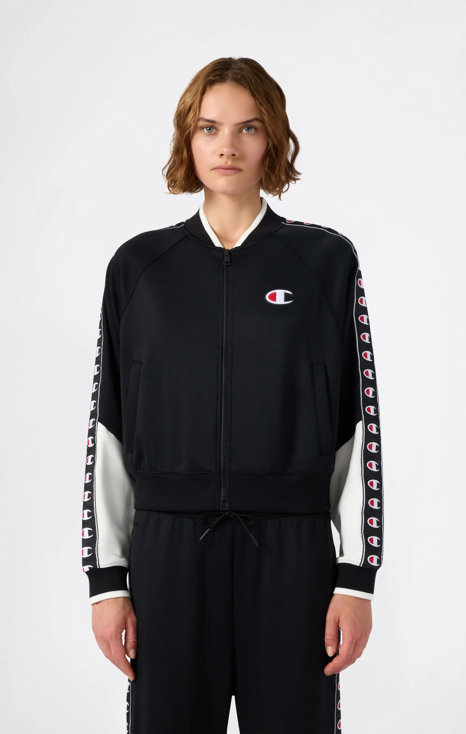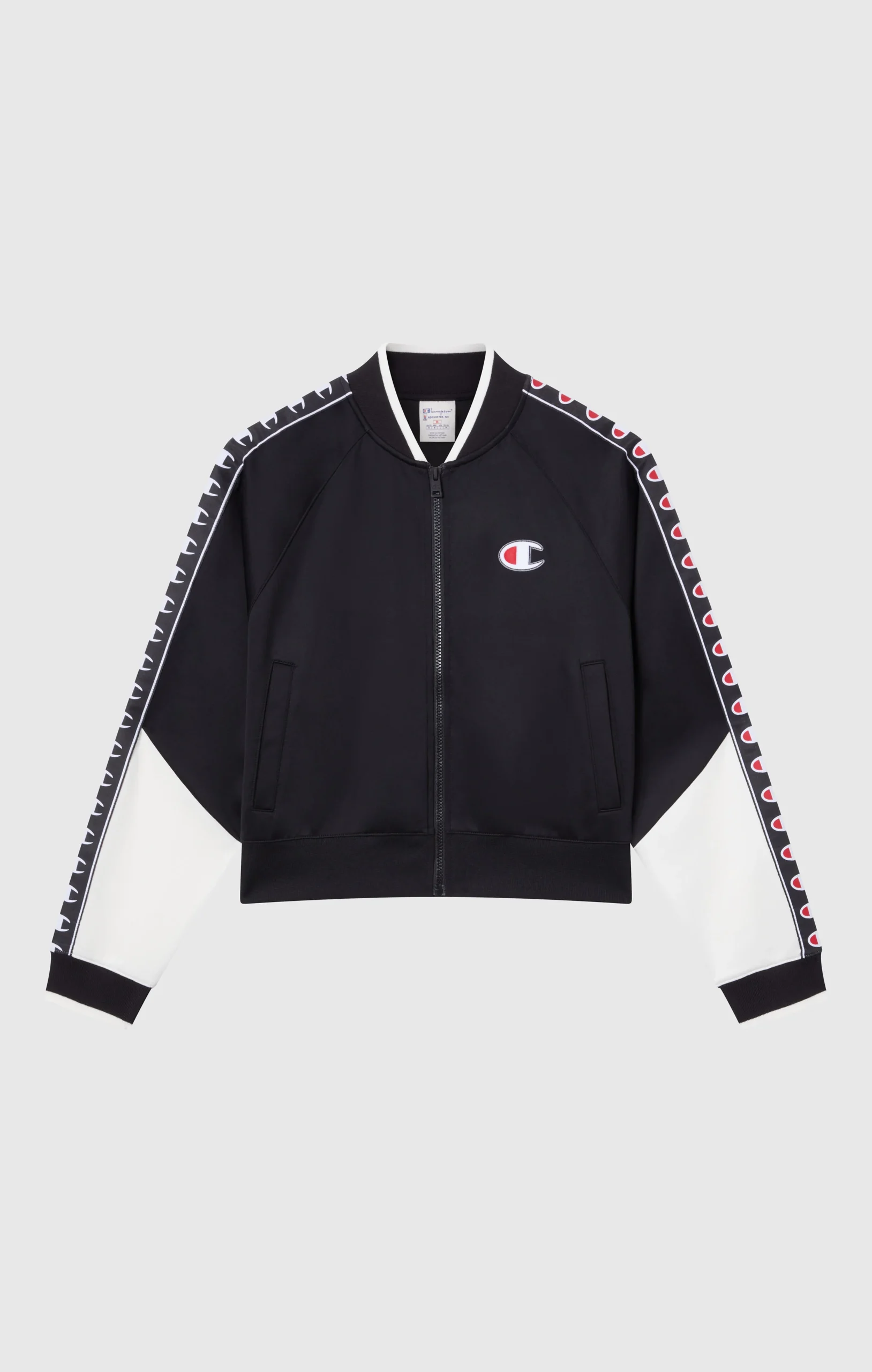 Inspired by ’90s sports uniforms, this full-zip sweatshirt reinterprets the classic track top with a feminine, lifestyle twist. Made from matte and shiny interlock, it features logo tape on the sleeves, ribbed collar with contrast stripes and an embroidered C-logo on the chest. The regular fit makes it perfect for sporty-casual or heritage-themed outfits.@@@Fabric: Shiny & Matt Interlock, weight: 265 g/m² |Composition: 50% Cotton 43% Polyester 7% Elastane |Logo tape on sleeves |Full zip fastening |Ribbed collar with contrast stripes |Embroidered C-logo on the chest |Fit: Standard Fit: Versatile and comfortable fit with standard width and length. Close to the body with clean lines that do not cling. Regular shoulder cut.
