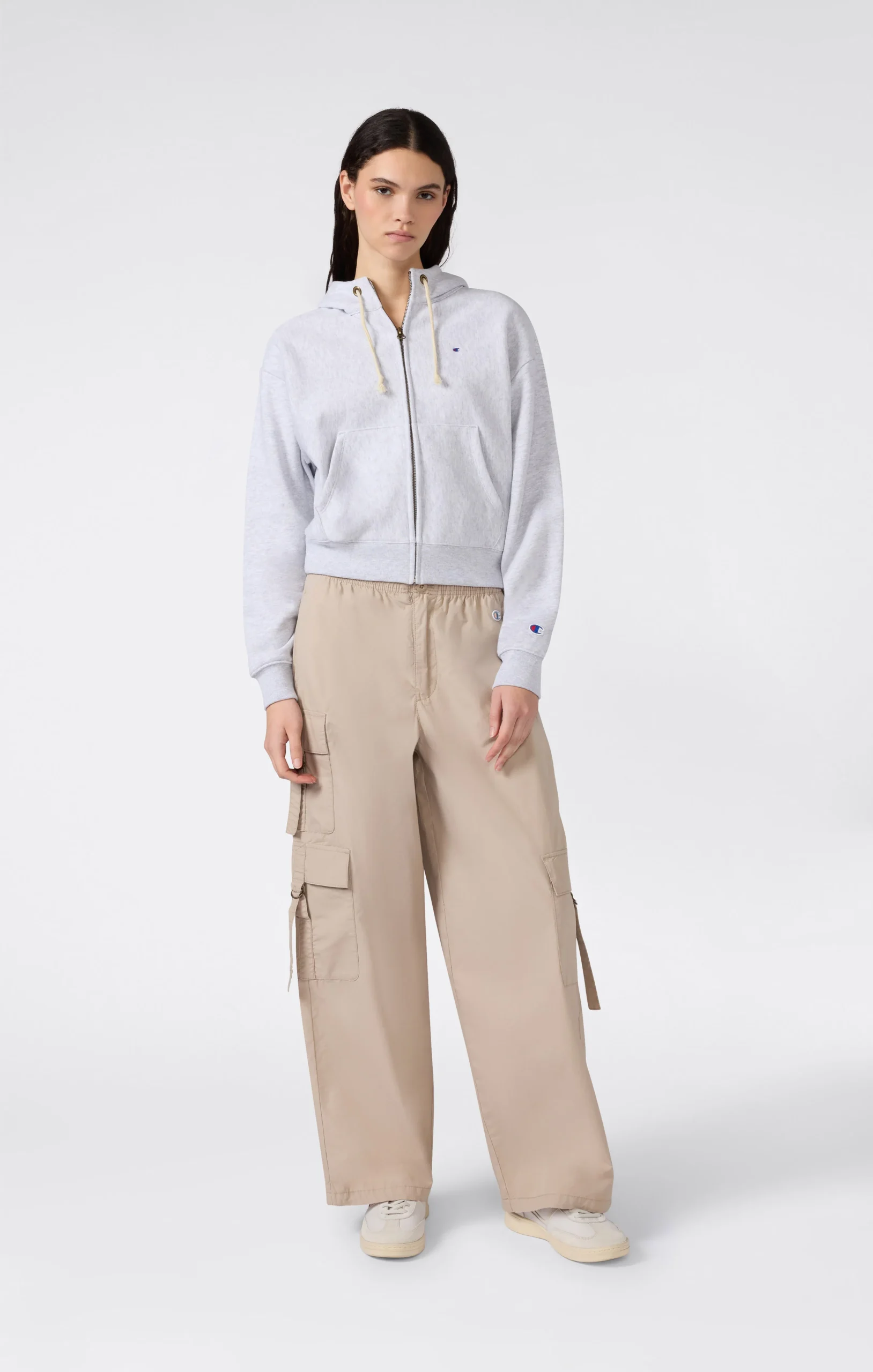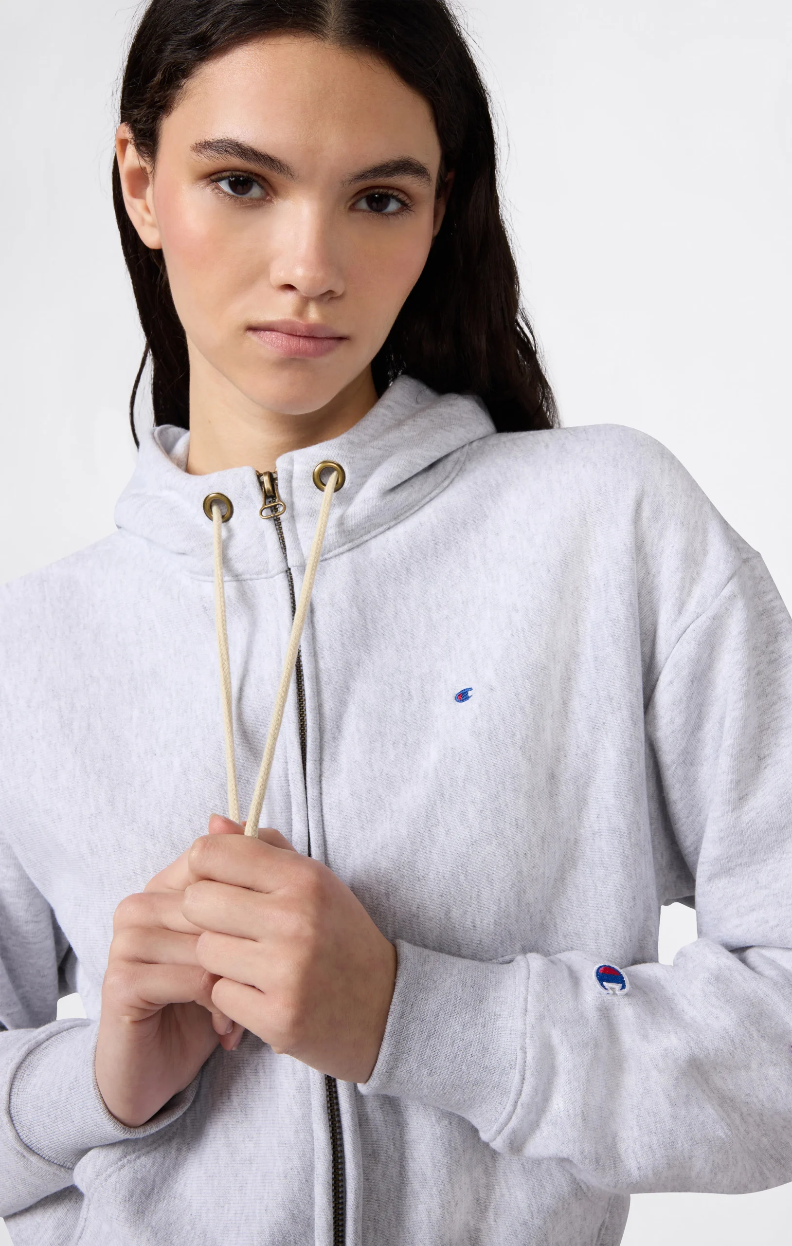 Women’s full zip hoodie with a clean, contemporary design. Made from soft reverse terry with Reverse Weave construction, an iconic Champion technique that uses a horizontal fabric orientation to improve stability and help maintain shape over time. The lightweight structure with an unbrushed interior makes it ideal for everyday wear, while the standard fit ensures comfort and versatility. The adjustable hood, full zip closure and front pockets complete the design with a functional, clean look.@@@Standard Fit, comfortable with a regular silhouette |Soft reverse terry fabric |Composition: 82% Cotton, 18% Polyester |Weight: 400 g/m² |Reverse Weave construction |Unbrushed interior |Adjustable hood with drawstring |Full zip closure |Front pockets |Ribbed cuffs and hem |Champion logo embroidered on the sleeve
