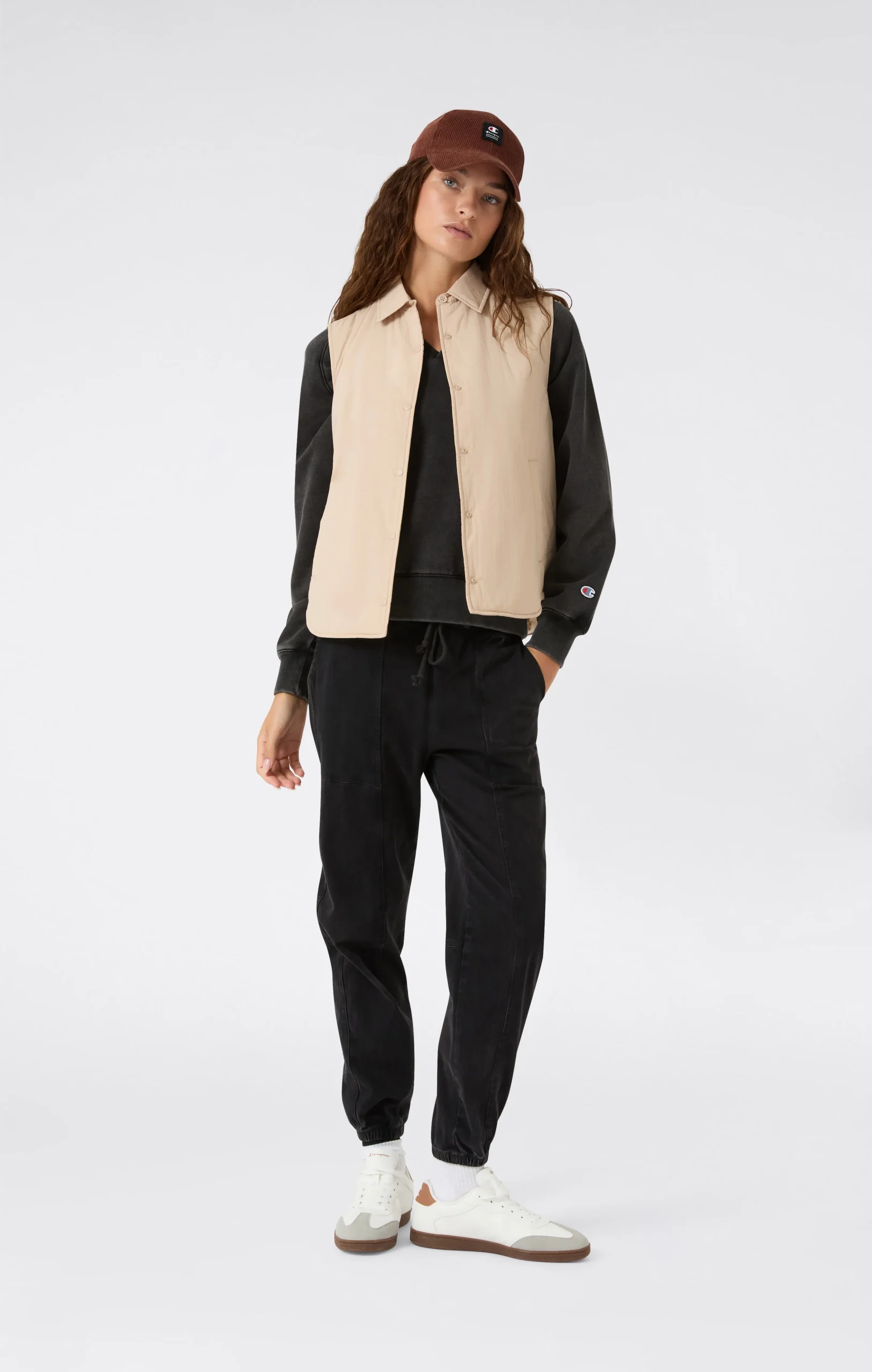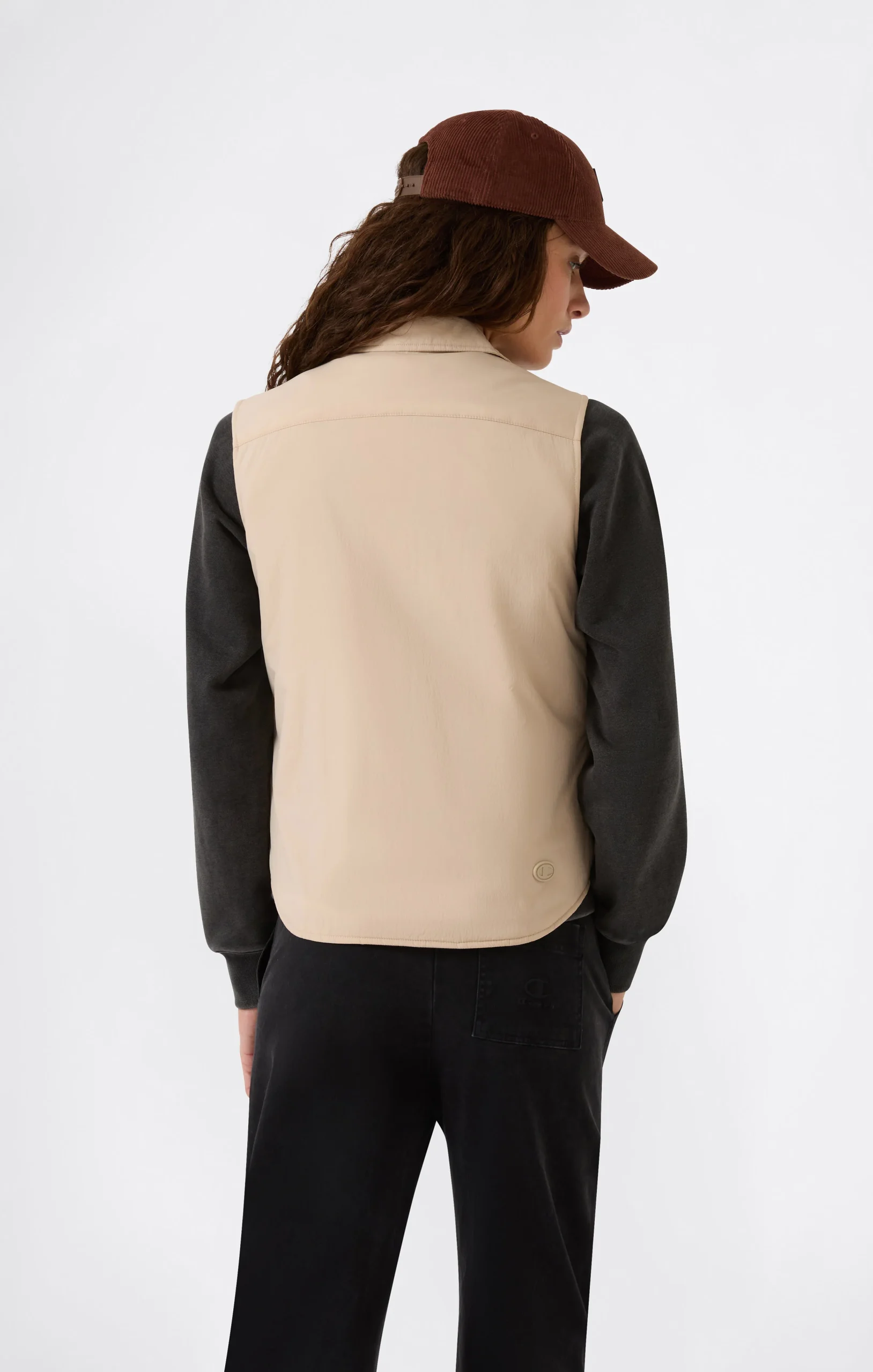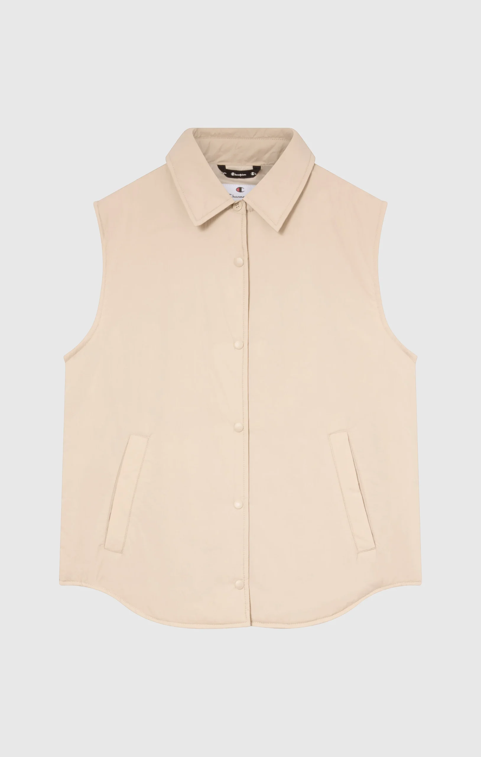 Essential yet distinctive, this vest is ideal to complete your outdoor outfit with lightweight comfort. The nylon fabric with ciré finish and water-repellent treatment protects against light rain, while the snap-button front closure and slanted pockets add functionality. Wear it alone or layered under a jacket for versatile styling.@@@Fabric: Ciré Woven Nylon, weight: 43 g/m² |Composition: 100% Polyamide |Water-repellent treatment |Shirt-style collar |Front snap button closure |Slanted side pockets |Sleeveless |Standard Fit: Versatile and comfortable fit with standard widths and lengths. Close to the body, it has simple lines that do not cling to the shape. Regular shoulder cut.