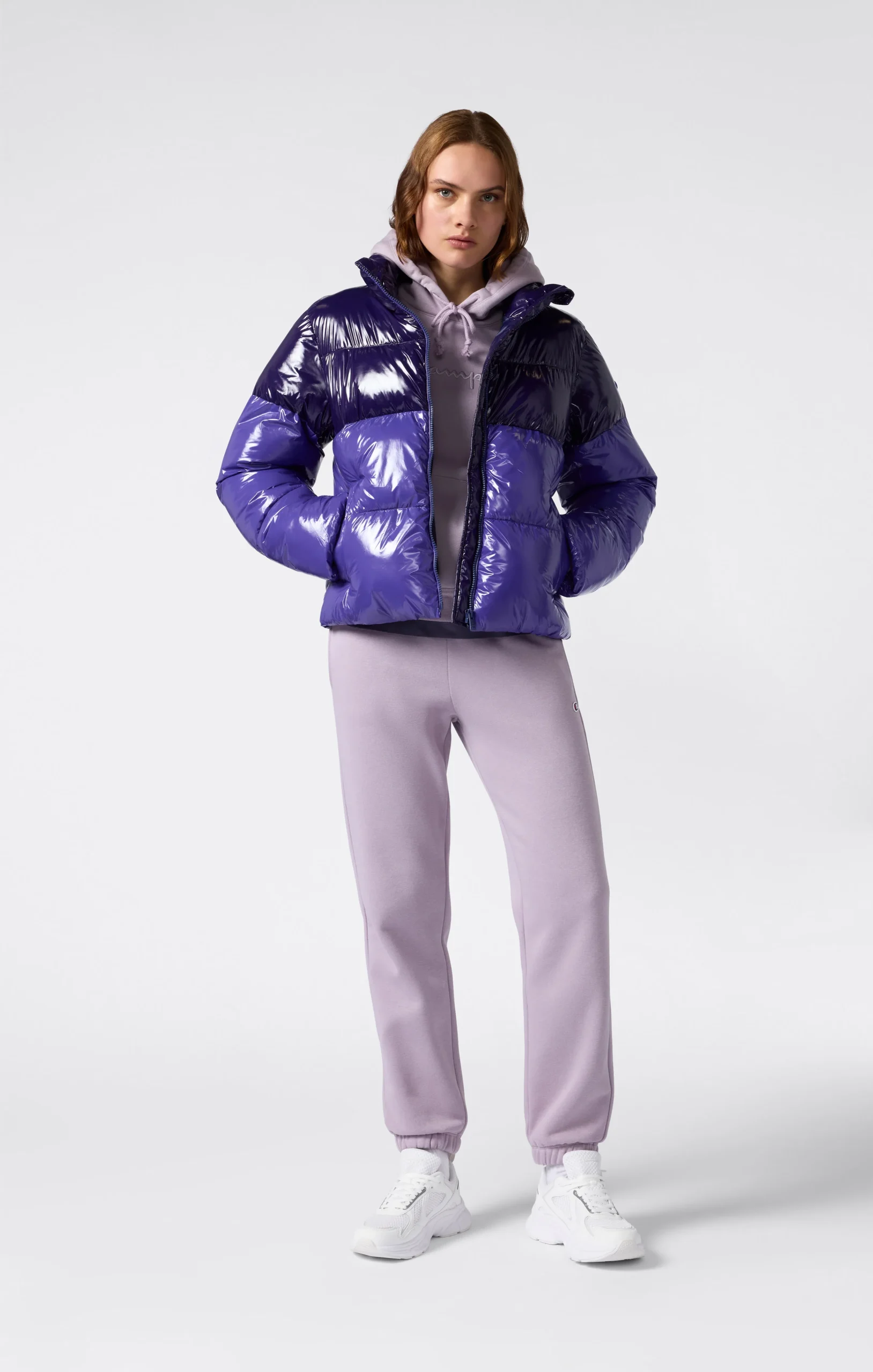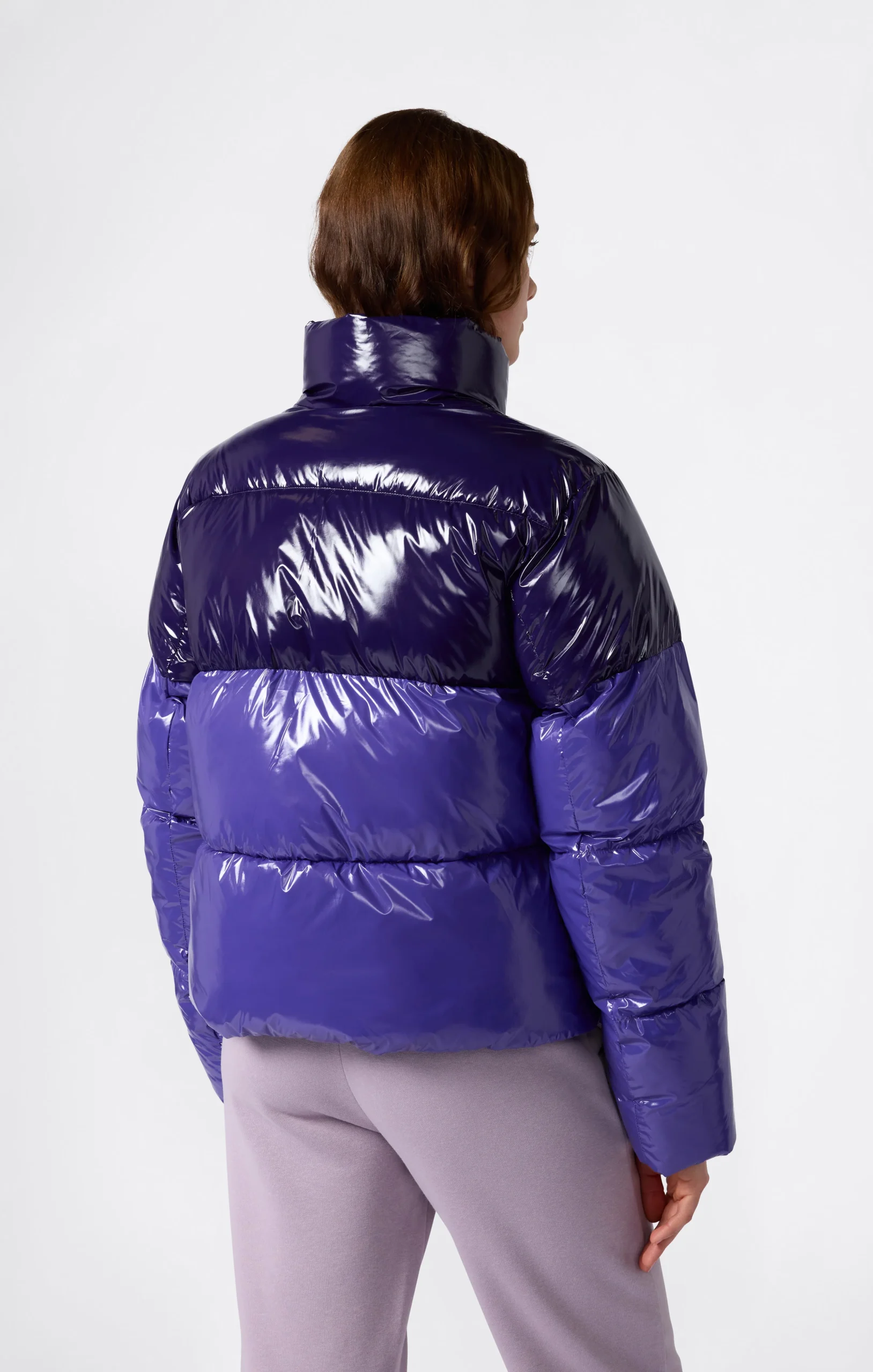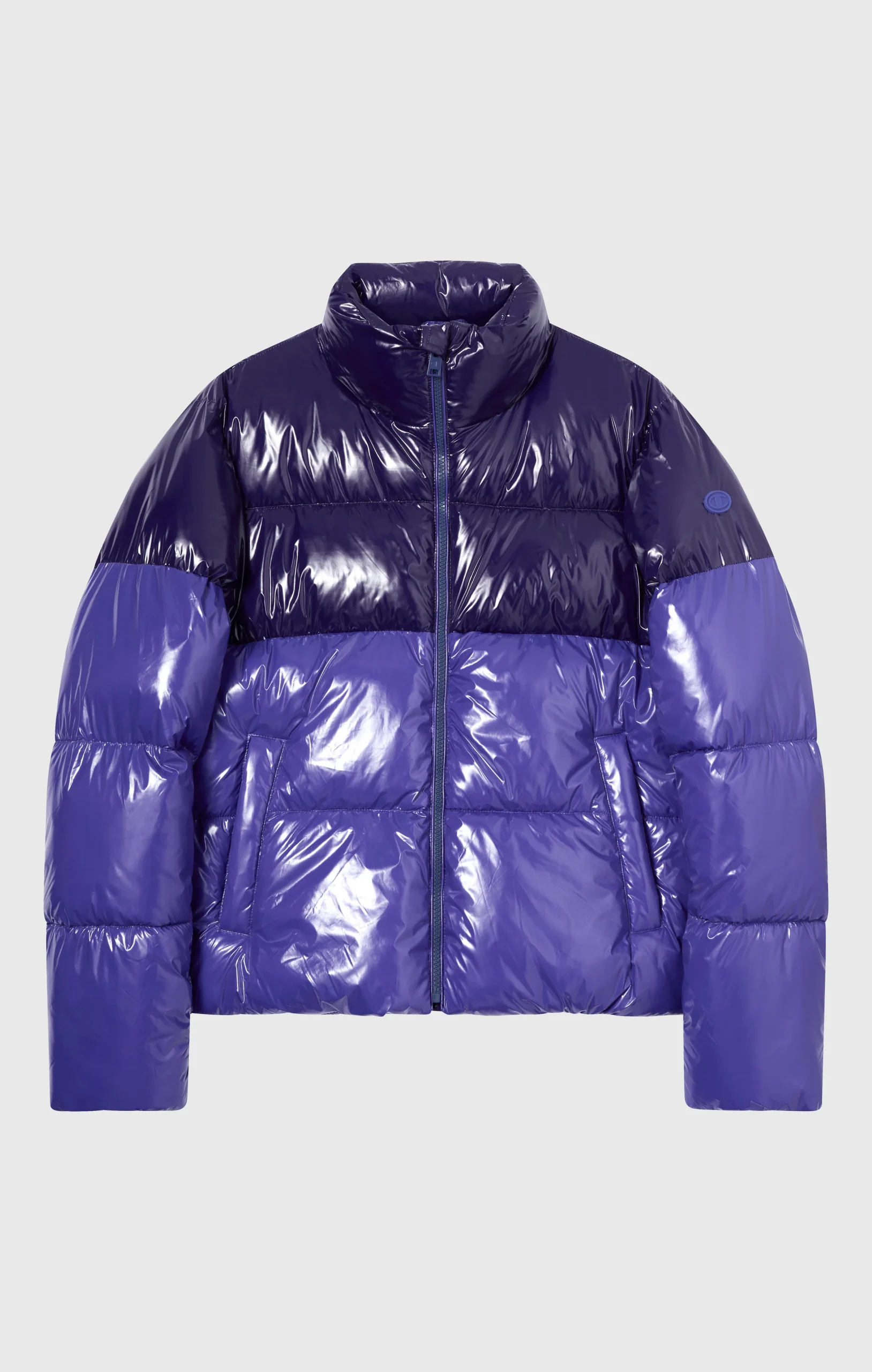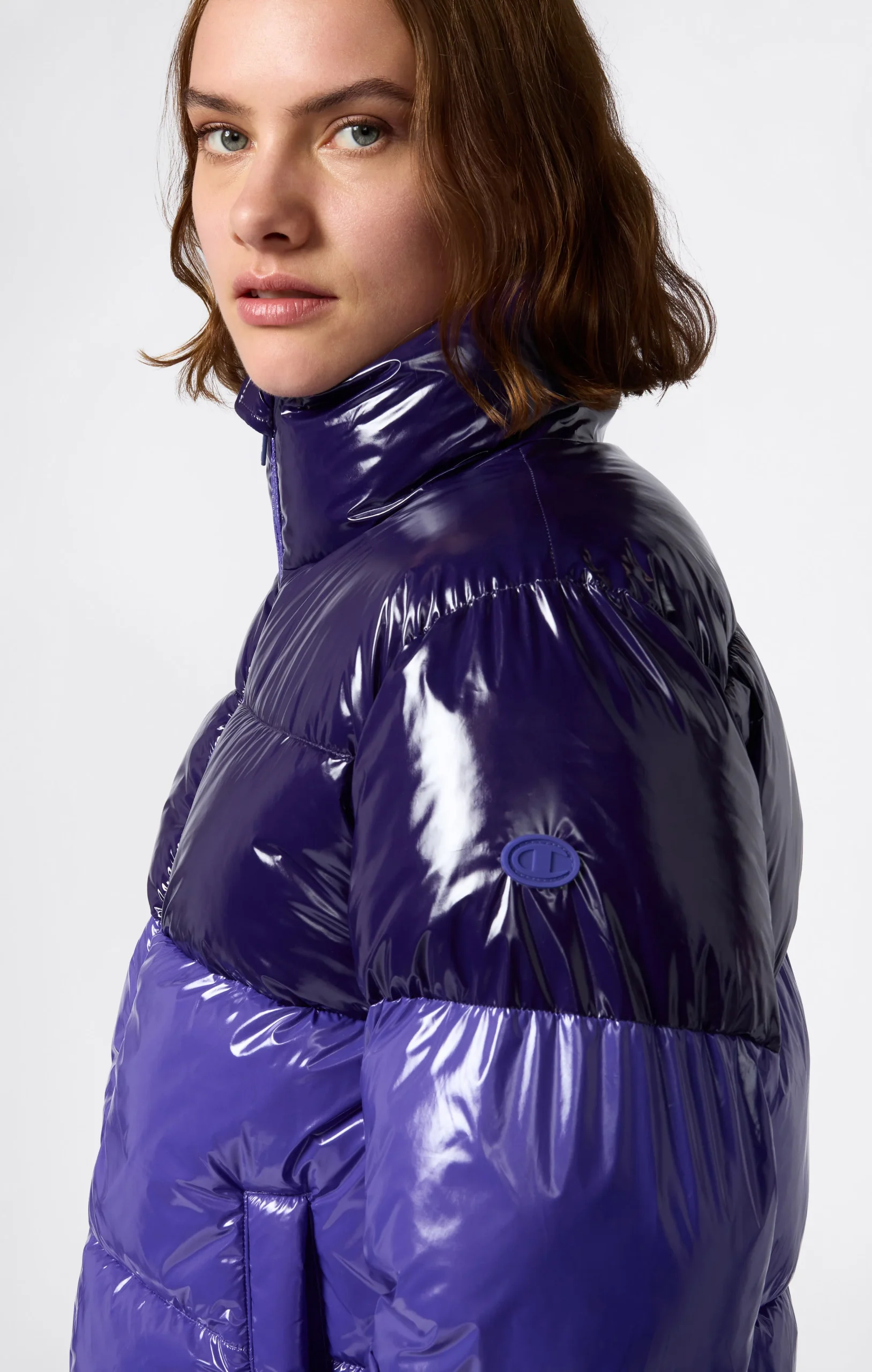 Padded jacket with a shiny, contemporary look, perfect for facing winter in style. The two-tone design enhances the fabric’s glossy effect, while the cropped cut and high collar add a modern urban touch. Thermal comfort and metropolitan character combined in one.@@@Fabric: Shiny polyurethane with varnished effect, 60 g/m² |Composition: 60% Polyamide, 40% Polyurethane |Light down-effect padding |Front zip closure |Front pockets |High collar |Standard Fit: Versatile and comfortable fit with standard widths and lengths. Close to the body, it has simple lines that do not cling to the shape. Regular shoulder cut.