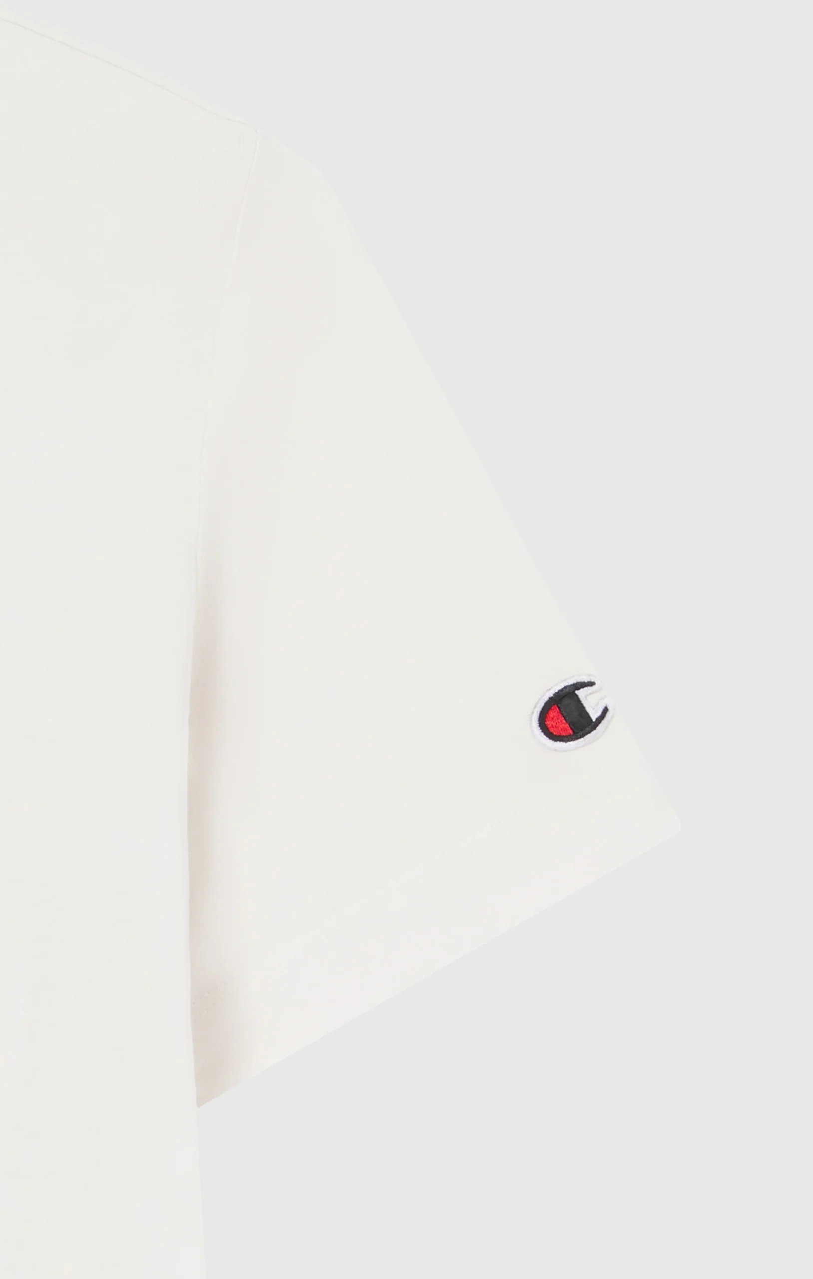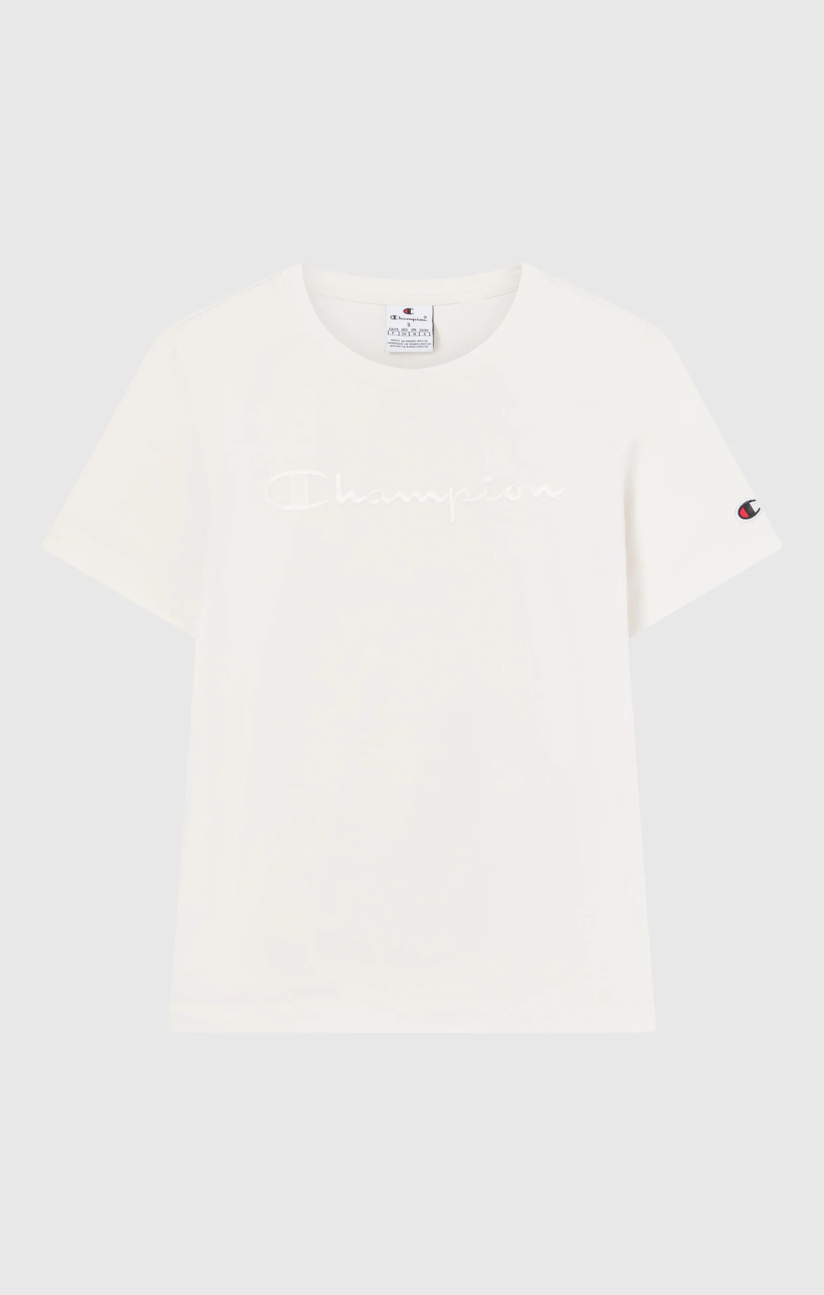 This t-shirt from the Icons line combines classic construction with a feminine and refined touch. The tone-on-tone embroidered Champion logo on the chest fits elegantly into the delicate color palette, enhancing the essential design. The combed jersey offers a soft and compact feel, while the slim fit follows the body’s lines, providing a comfortable and defined fit.@@@Fabric: Combed jersey 180 g/m² |Composition: 100% Cotton |Tone-on-tone embroidered Champion logo on the chest |Ribbed collar |Embroidered C logo on the sleeve |Fit: Slim Fit – Close-fitting but not tight. The garment follows the body’s curves naturally.