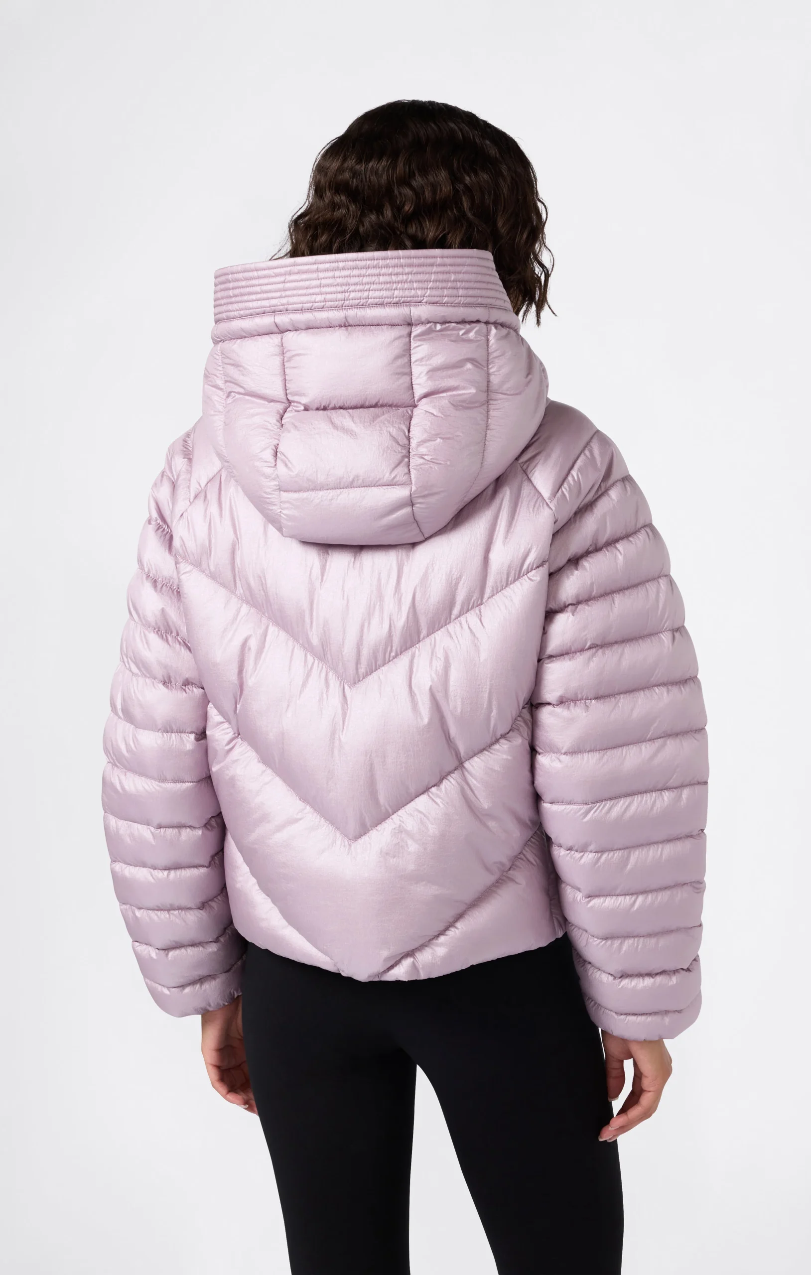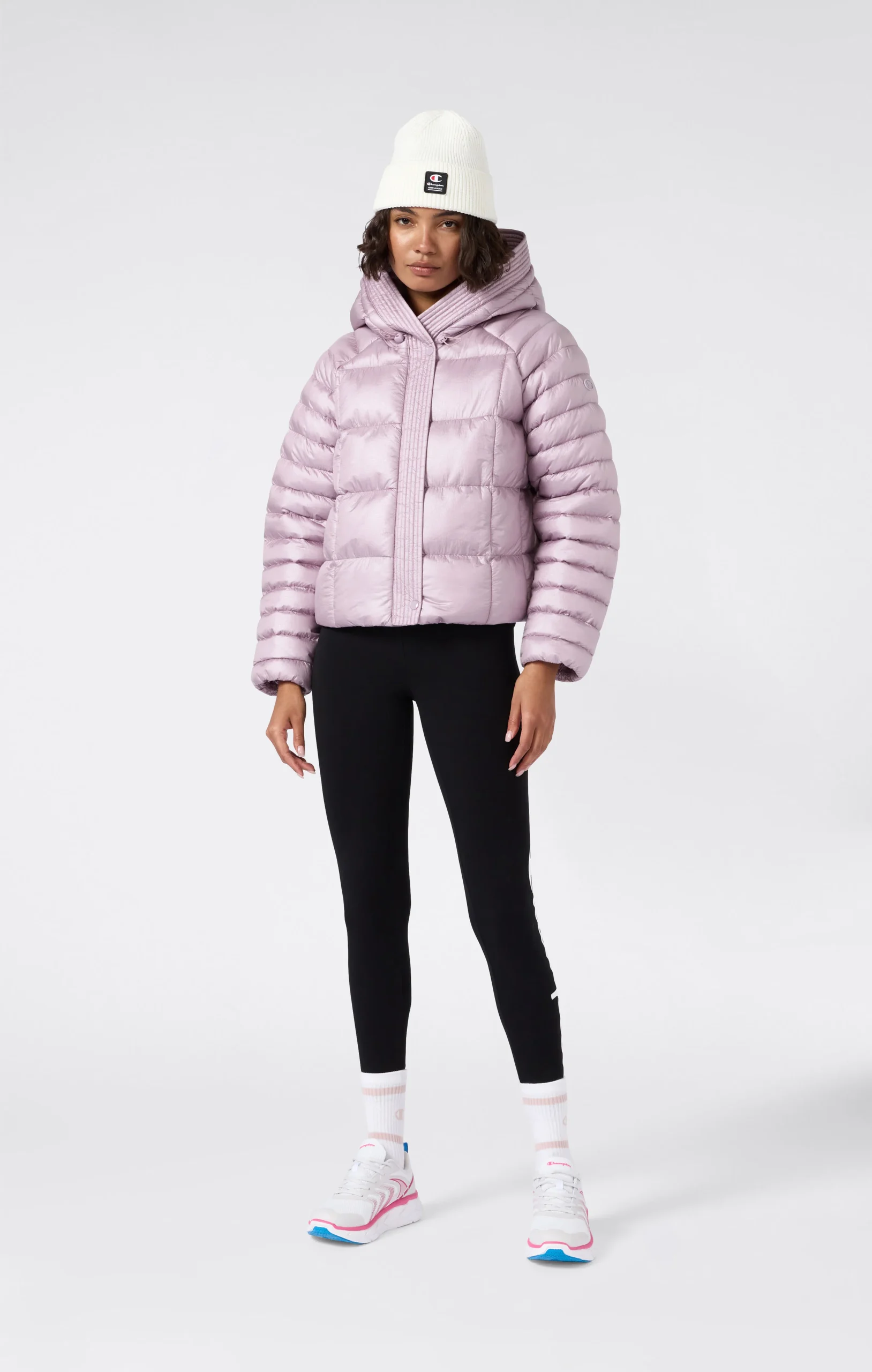 Padded jacket with a shiny look and crinkled texture, designed to face the cold in style. The design features a snug hood and oversized quilted squares for comfort and protection. Lightweight and compact, it’s perfect for winter in the city.@@@Fabric: Shiny Nylon, 41 g/m² |Composition: 100% Polyamide |Light polyester padding |Integrated hood |Diamond quilting |Closure with zip and snap buttons |Standard Fit: Versatile and comfortable fit with standard widths and lengths. Close to the body, it has simple lines that do not cling to the shape. Regular shoulder cut.