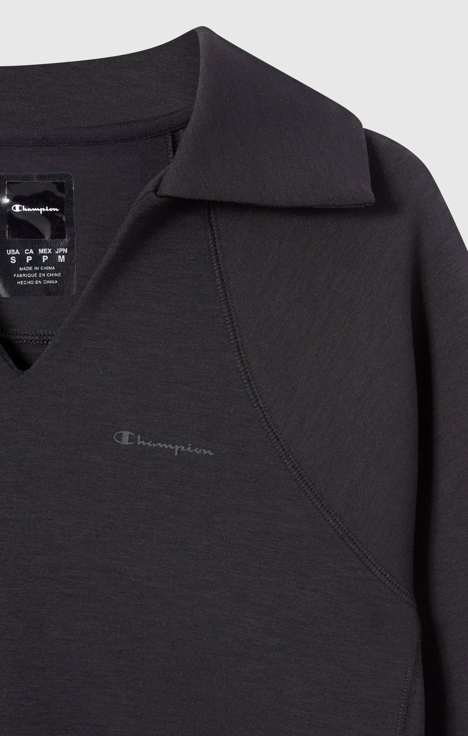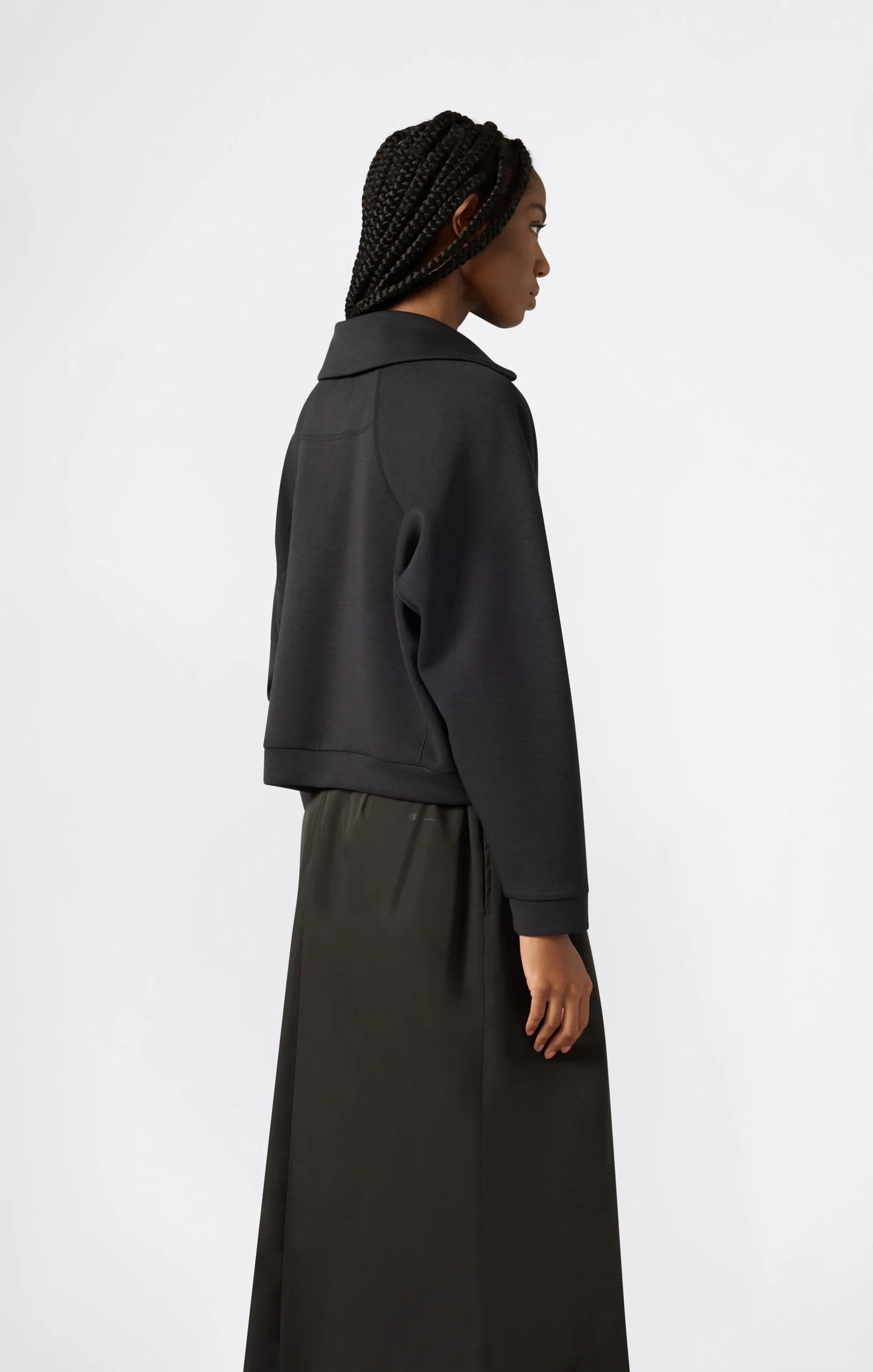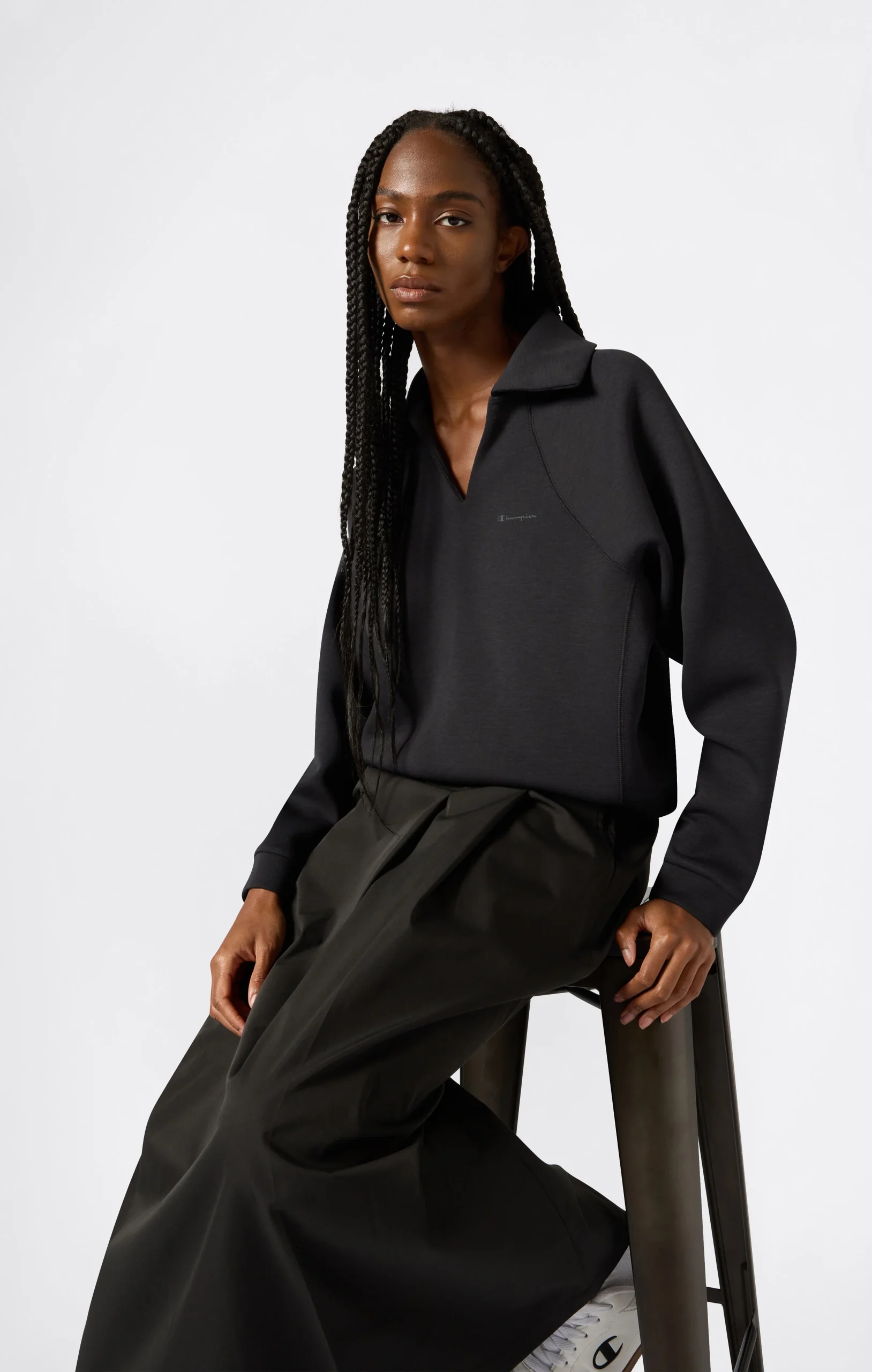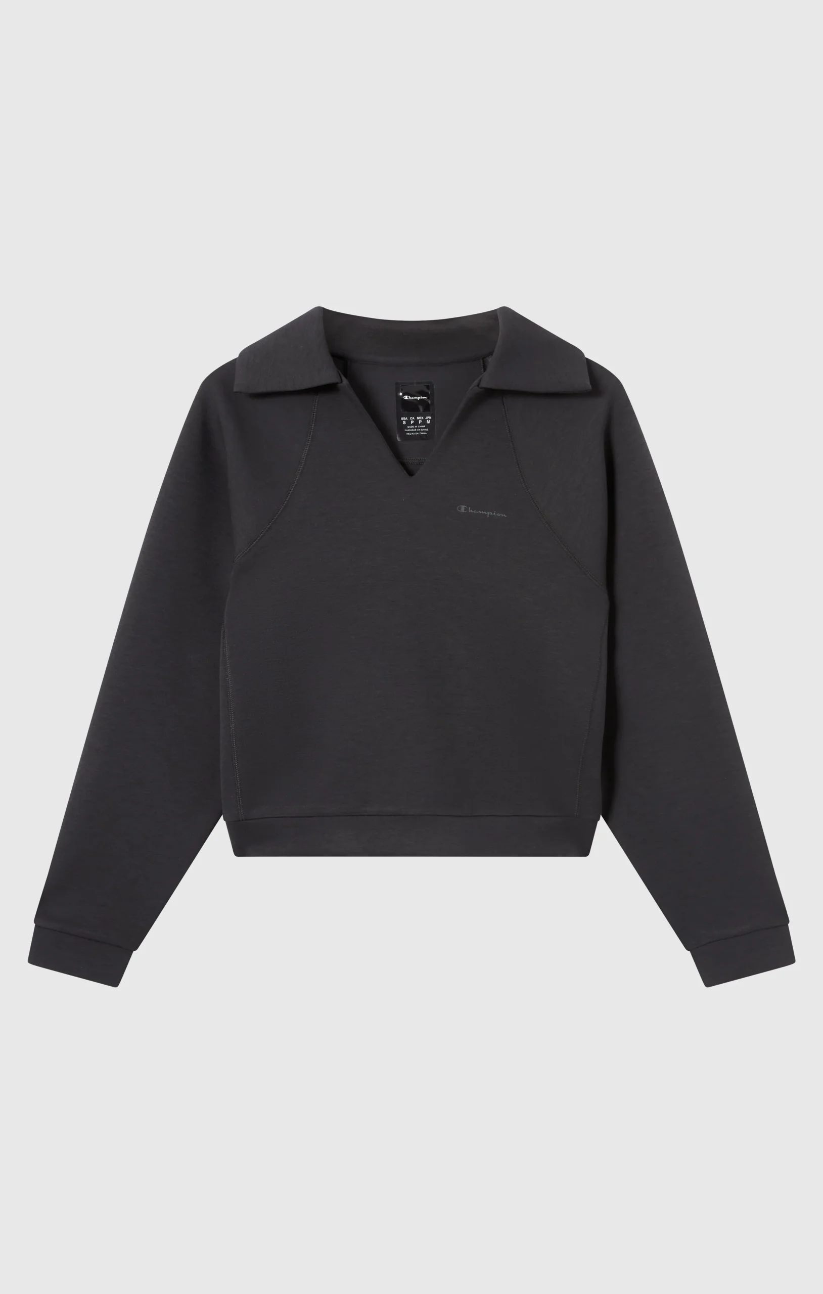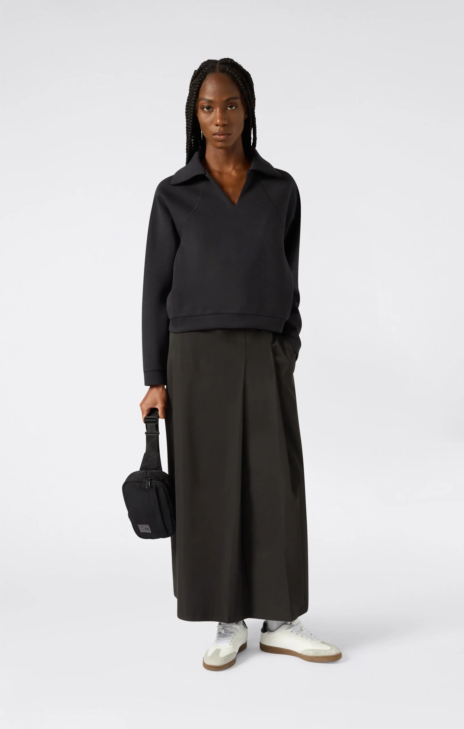 This open-collar sweatshirt offers a modern take on a sportswear classic, combining style and comfort. Made from Stretch Double Knit fabric with a cotton-feel finish, it moves with softness and flexibility. The relaxed fit and natural breathability make it perfect for an effortlessly refined everyday look.@@@Fabric: Stretch Double Knit, weight: 335 g/m² |Composition: 83% Polyester, 12% Rayon, 5% Polyurethane |Recycled polyester |Open pointed collar |Cotton feel |Breathable |Stretch |Fit: Relax Fit: soft and comfortable fit, slightly loose at the chest, dropped shoulder, regular length.